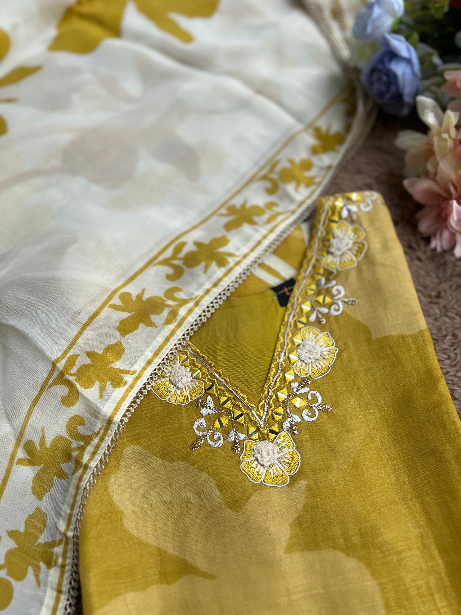 Radiate elegance in this mustard yellow shimmer maslin suit featuring delicate floral motifs and subtle embroidery on the neckline. Paired with cotton silk pants and a contrasting ivory shimmer maslin dupatta with intricate floral border, this set is a perfect blend of tradition and contemporary charm.