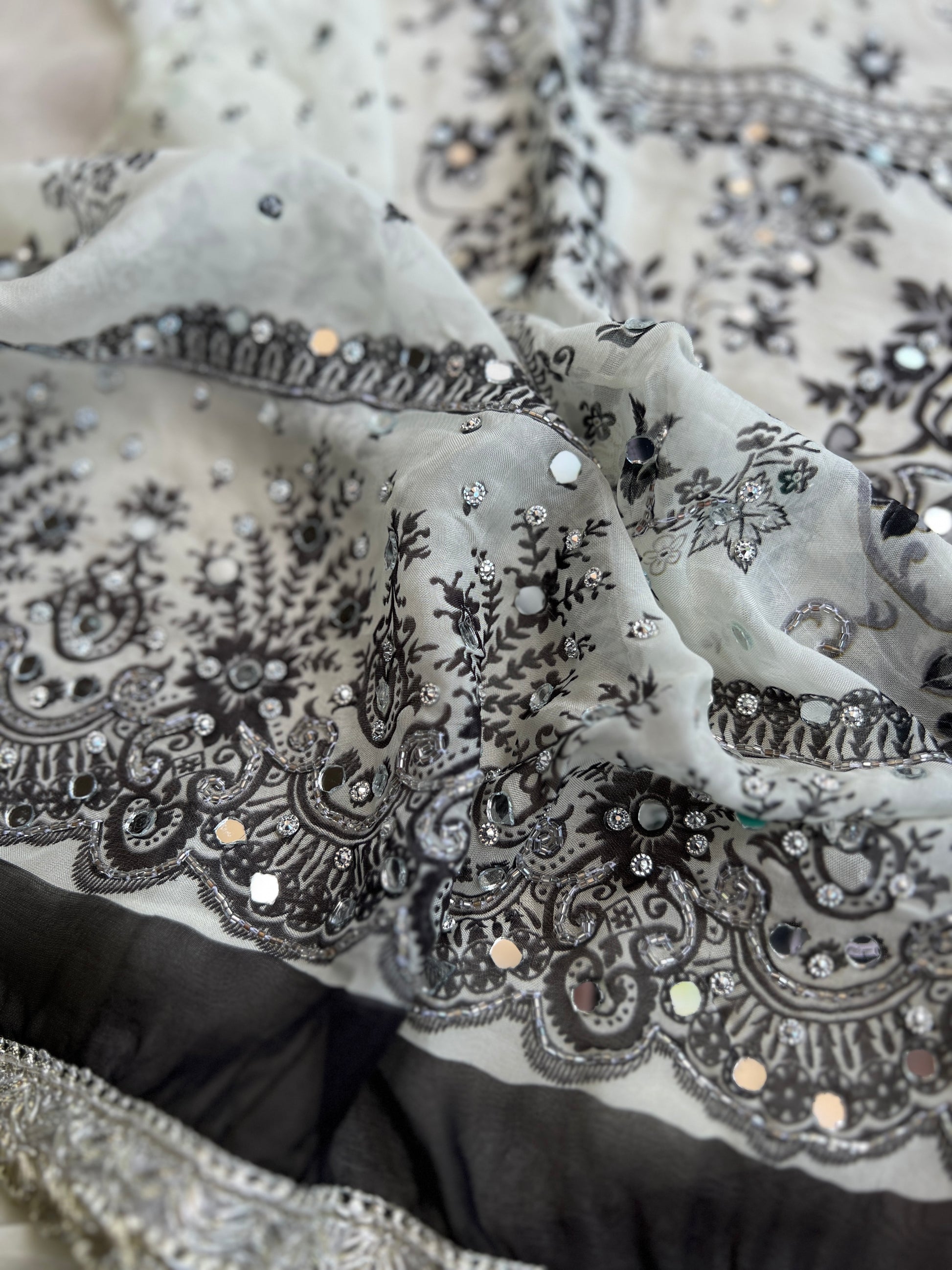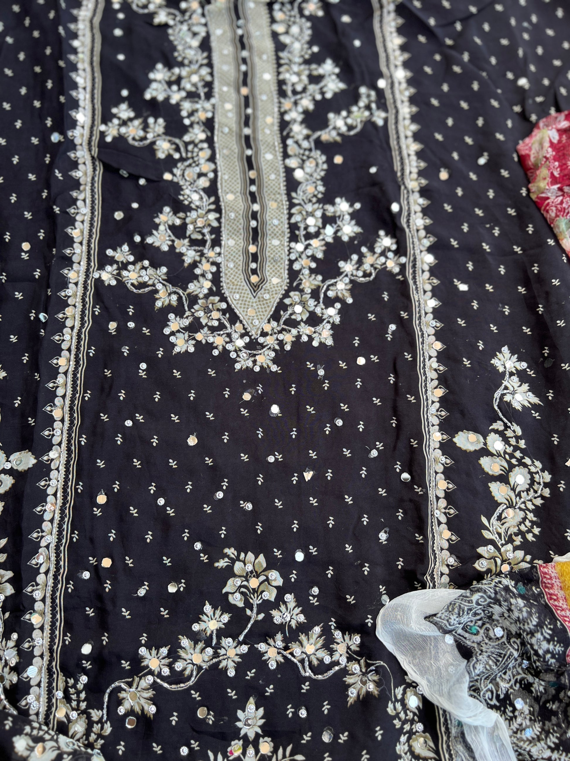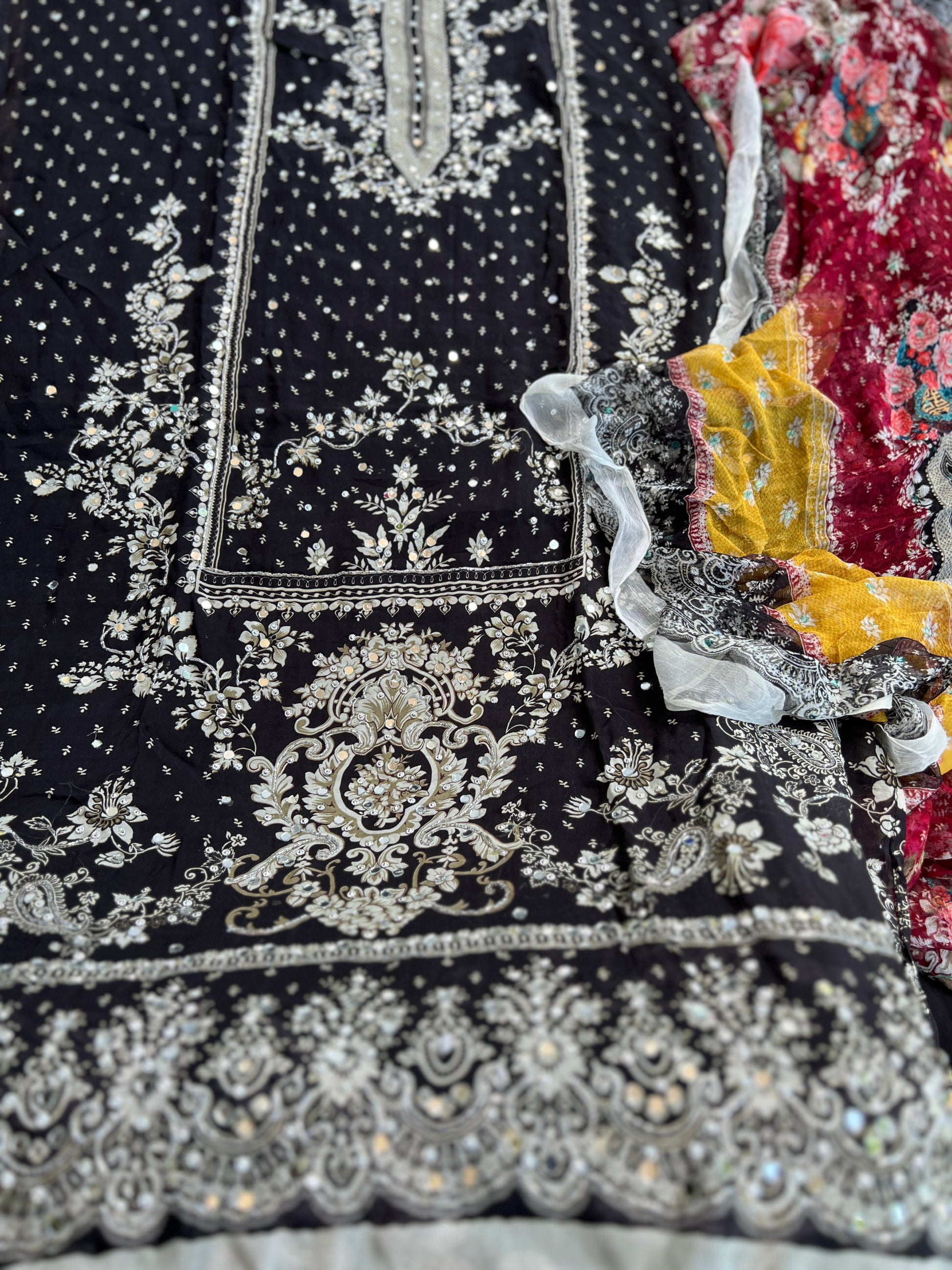 A classy fusion of tradition and vibrance, this black and white Karachi print crepe unstitched salwar suit is adorned with delicate mirror embroidery for a festive sparkle. The highlight of the ensemble is the multicolour chiffon mirror dupatta, adding a playful burst of colours to the timeless black-and-white base. Paired with a comfortable Shantoon bottom, this suit set strikes the perfect balance between elegance and festive charm.