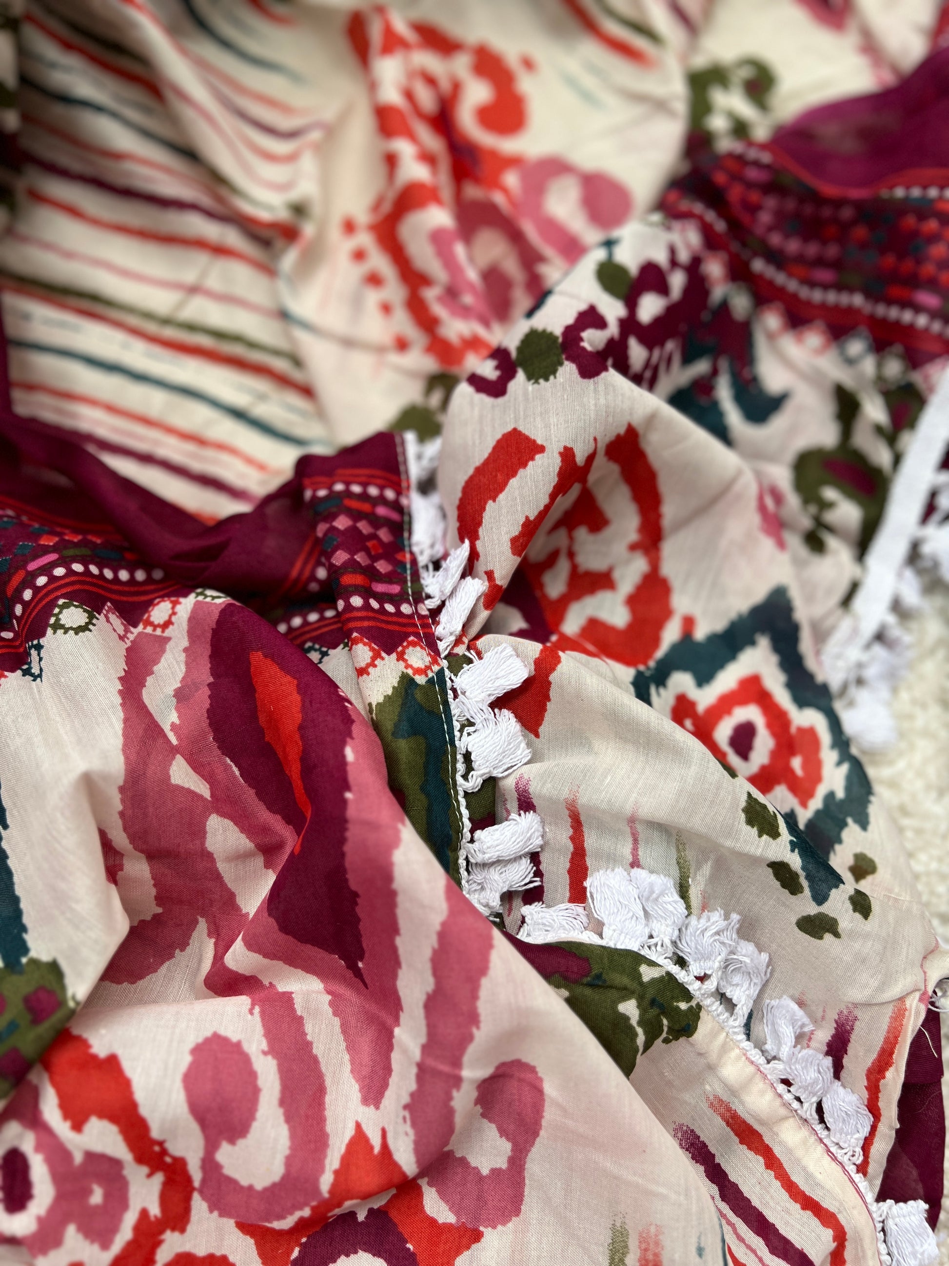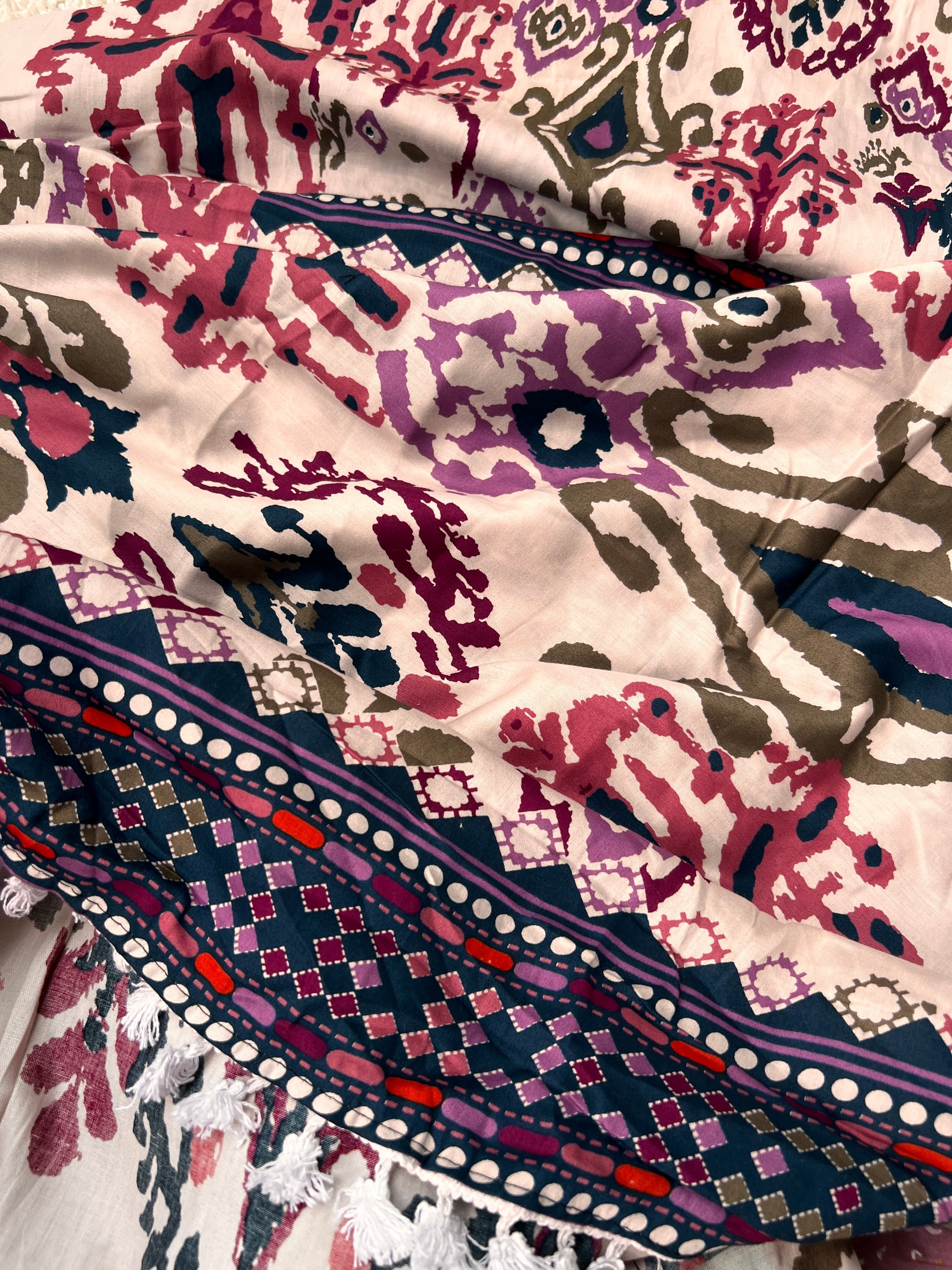Infused with tribal charm and contemporary flair, these Boho-style suits in soft modal cotton feature vibrant mirror work and bold geometric patterns. The intricate detailing and rich color palettes create a lively yet earthy aesthetic, perfect for casual gatherings, summer festivities, or a statement day-out look. Lightweight and breathable, these ensembles offer comfort without compromising on style.