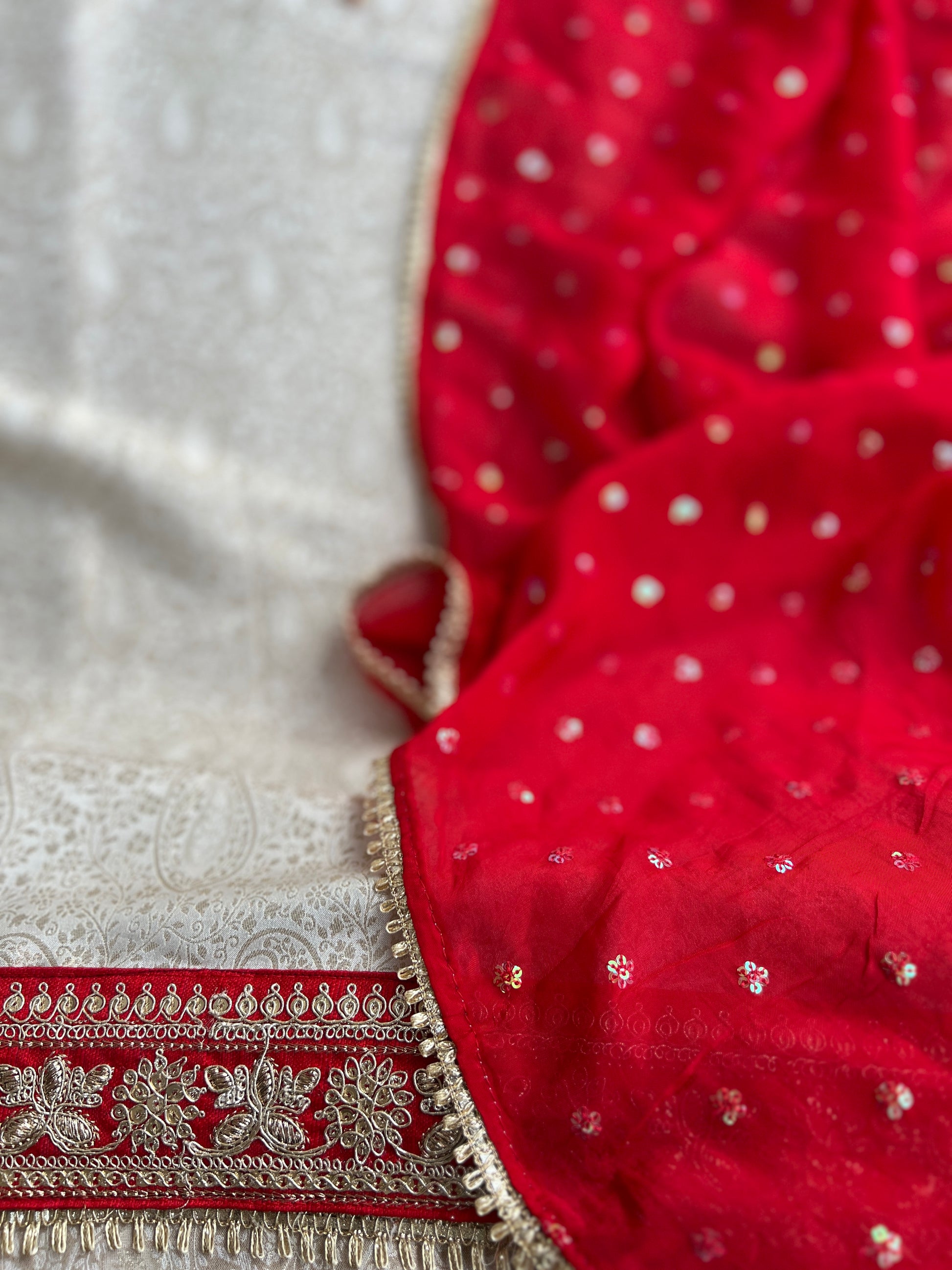 Completing the look is a stunning red dupatta adorned with delicate sequins boota all over, adding just the right amount of festive sparkle. Classy, elegant, and effortlessly graceful, this outfit is perfect for wedding functions, festive evenings, and special winter occasions.