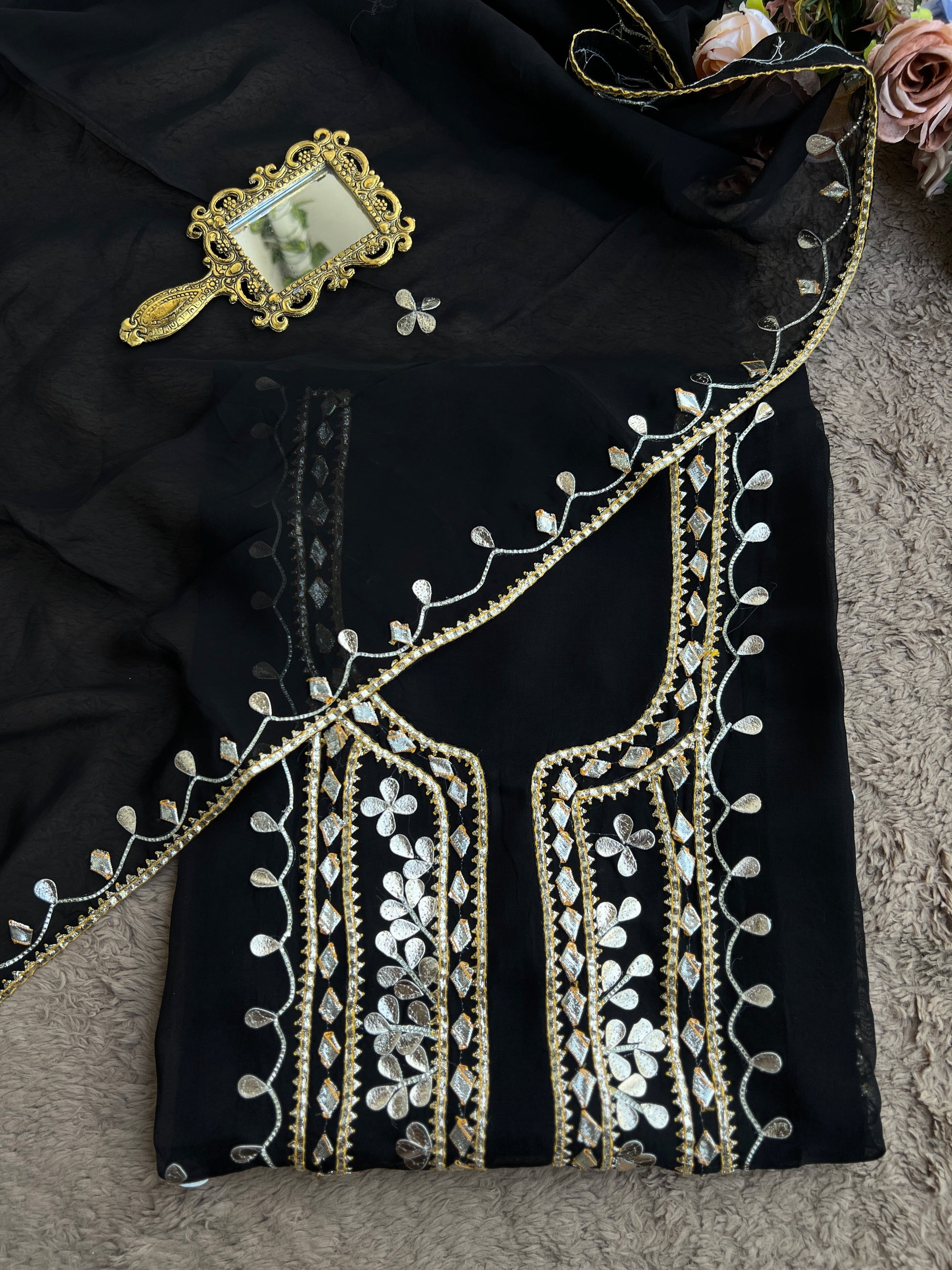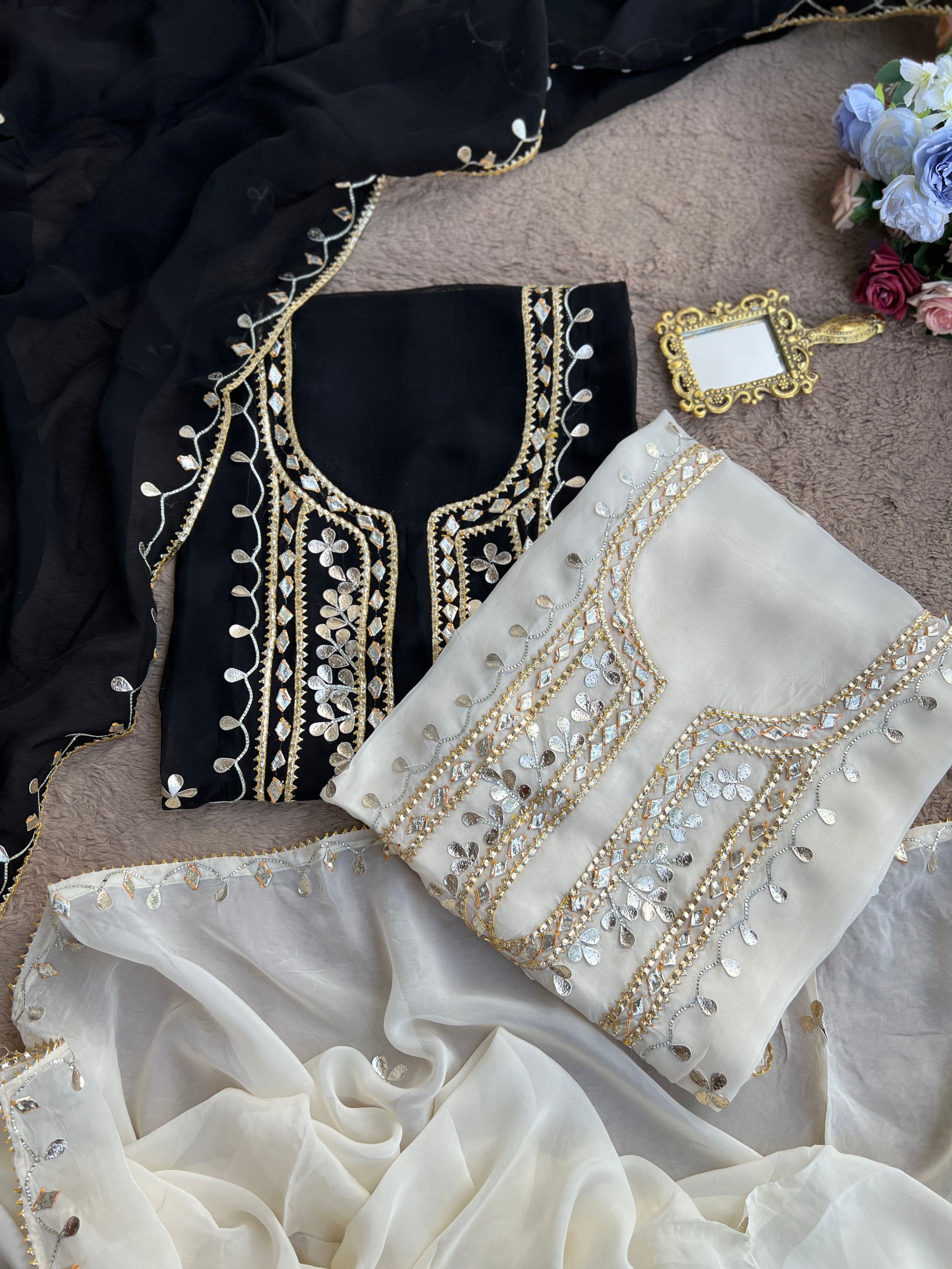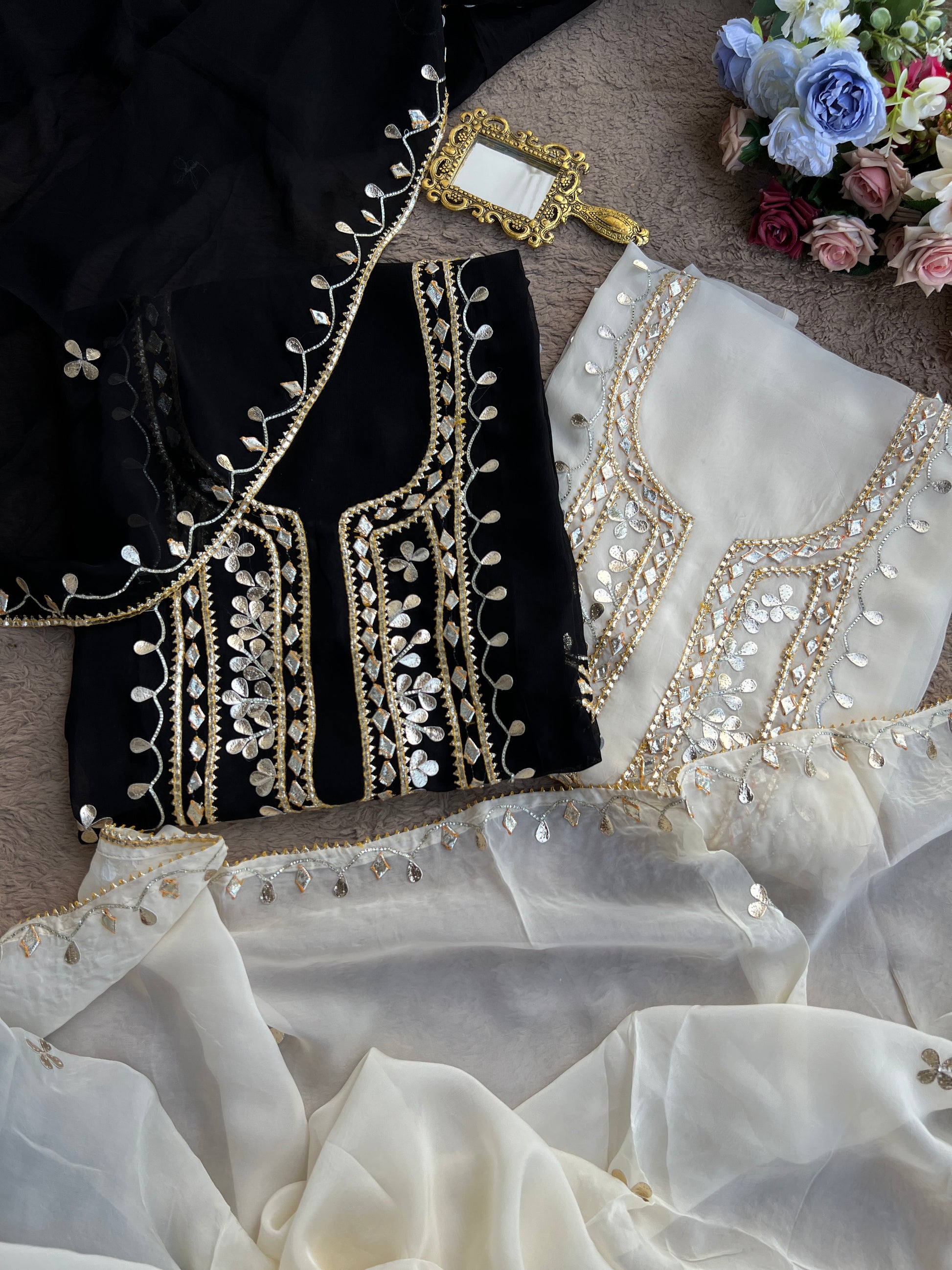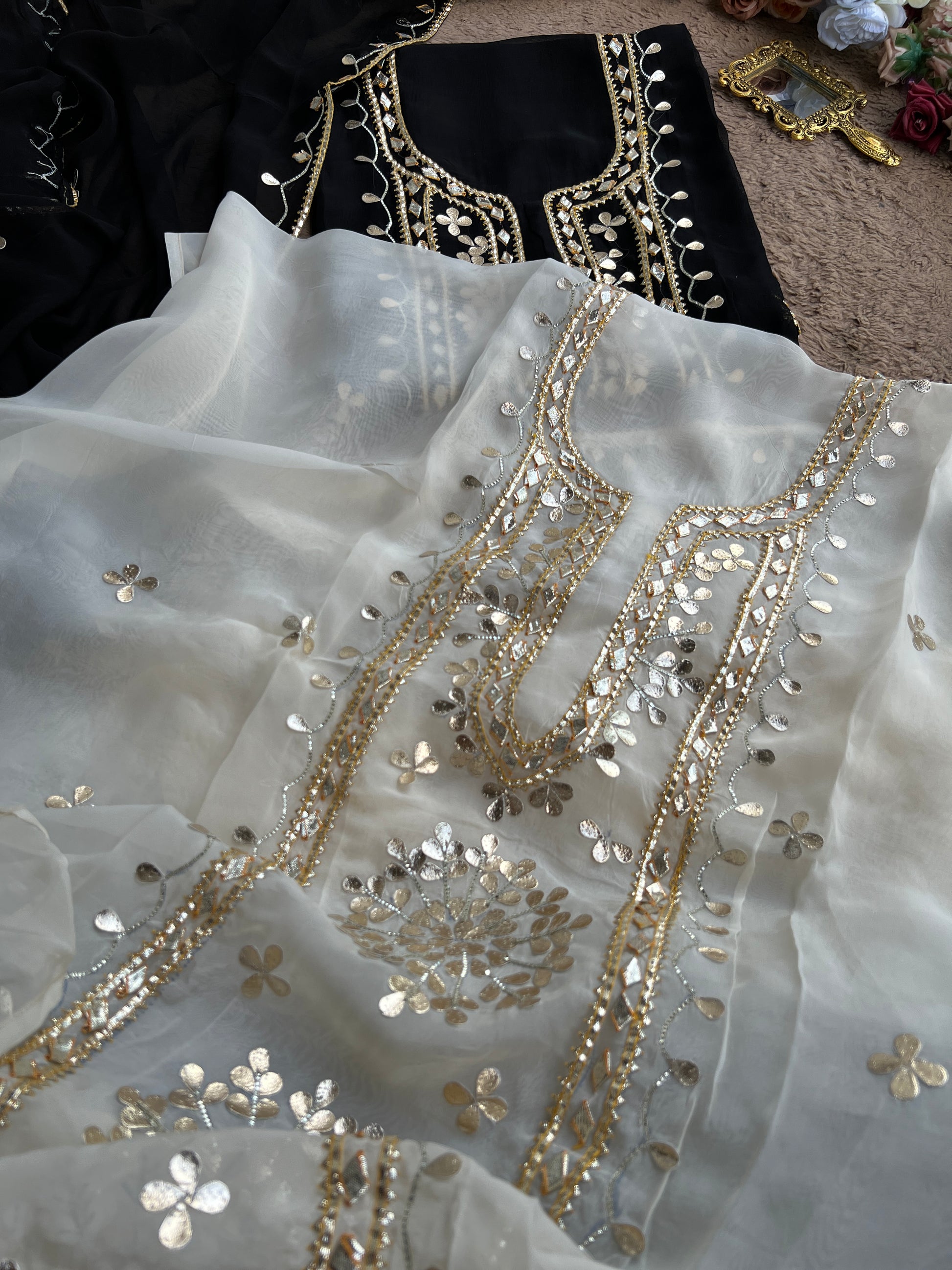 Indulge in timeless elegance with this beautifully crafted soft viscose organza suit set, adorned with intricate gota patti and mirror-inspired embroidery on the neckline and sleeves.