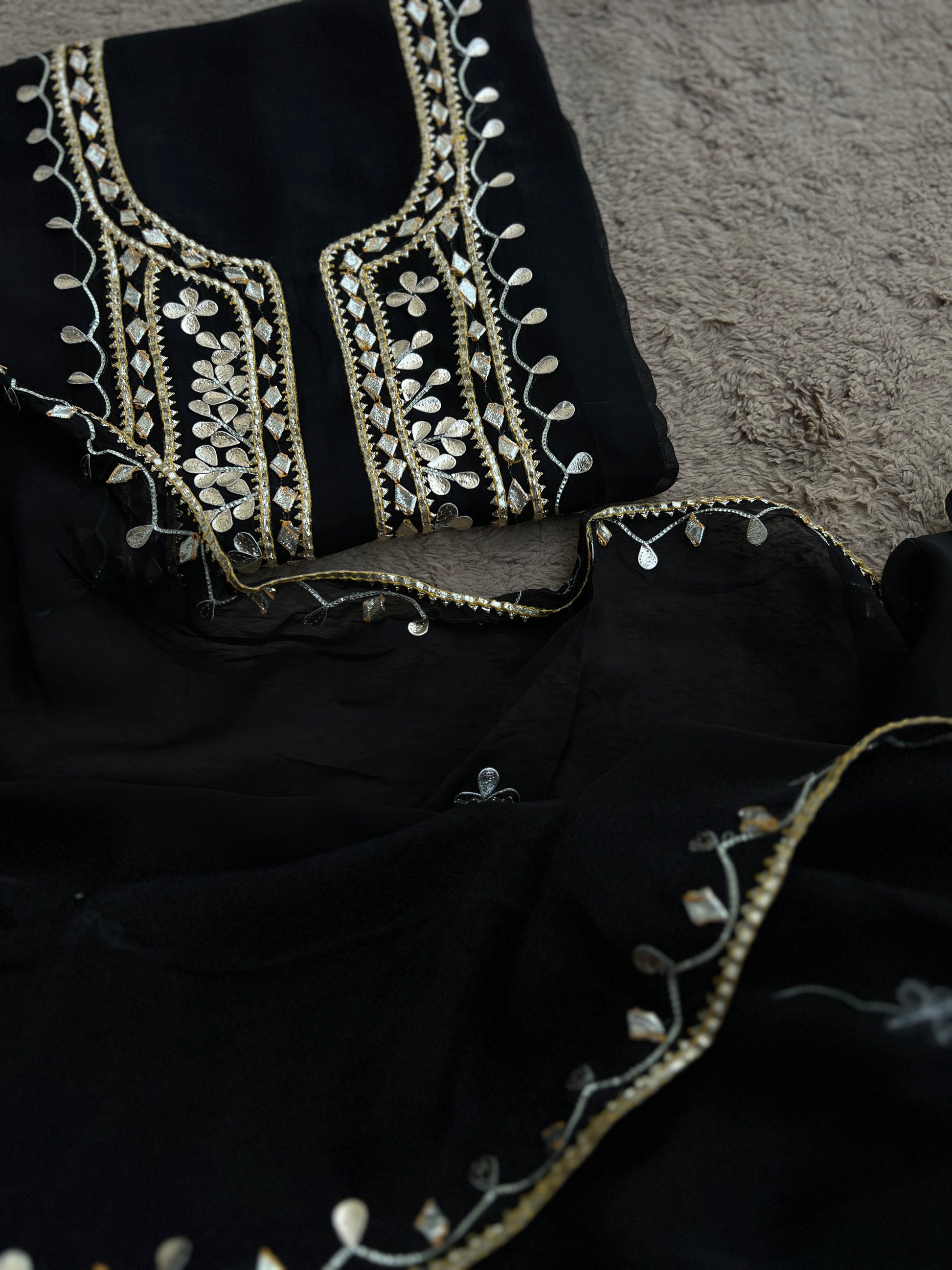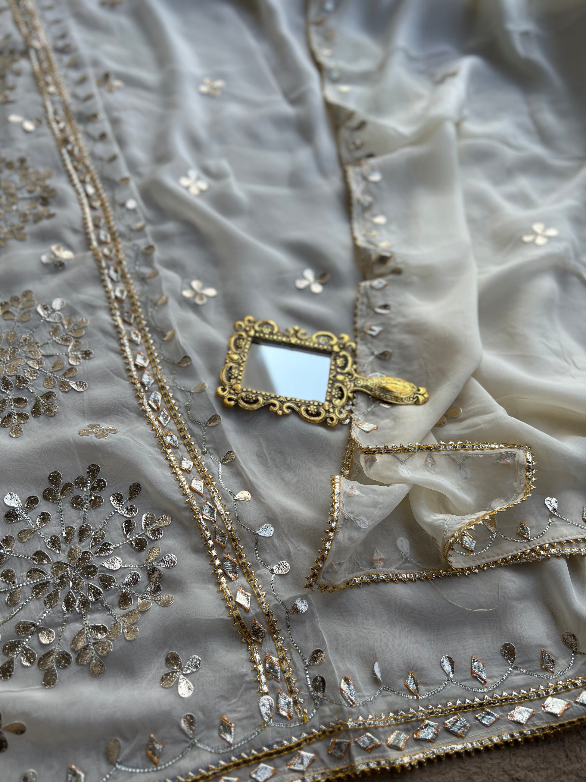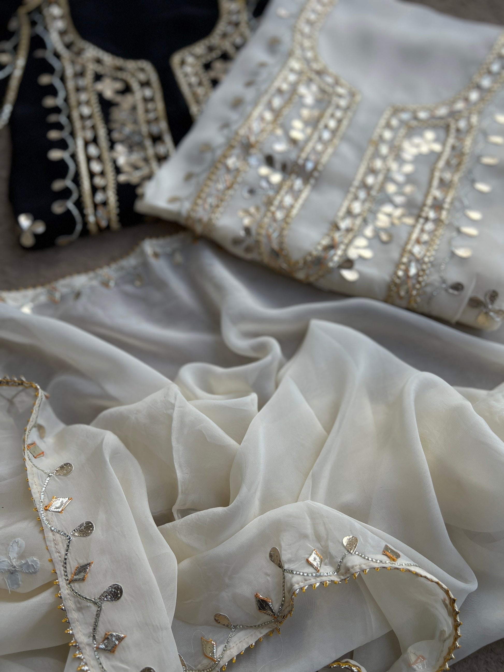 Indulge in timeless elegance with this beautifully crafted soft viscose organza suit set, adorned with intricate gota patti and mirror-inspired embroidery on the neckline and sleeves.