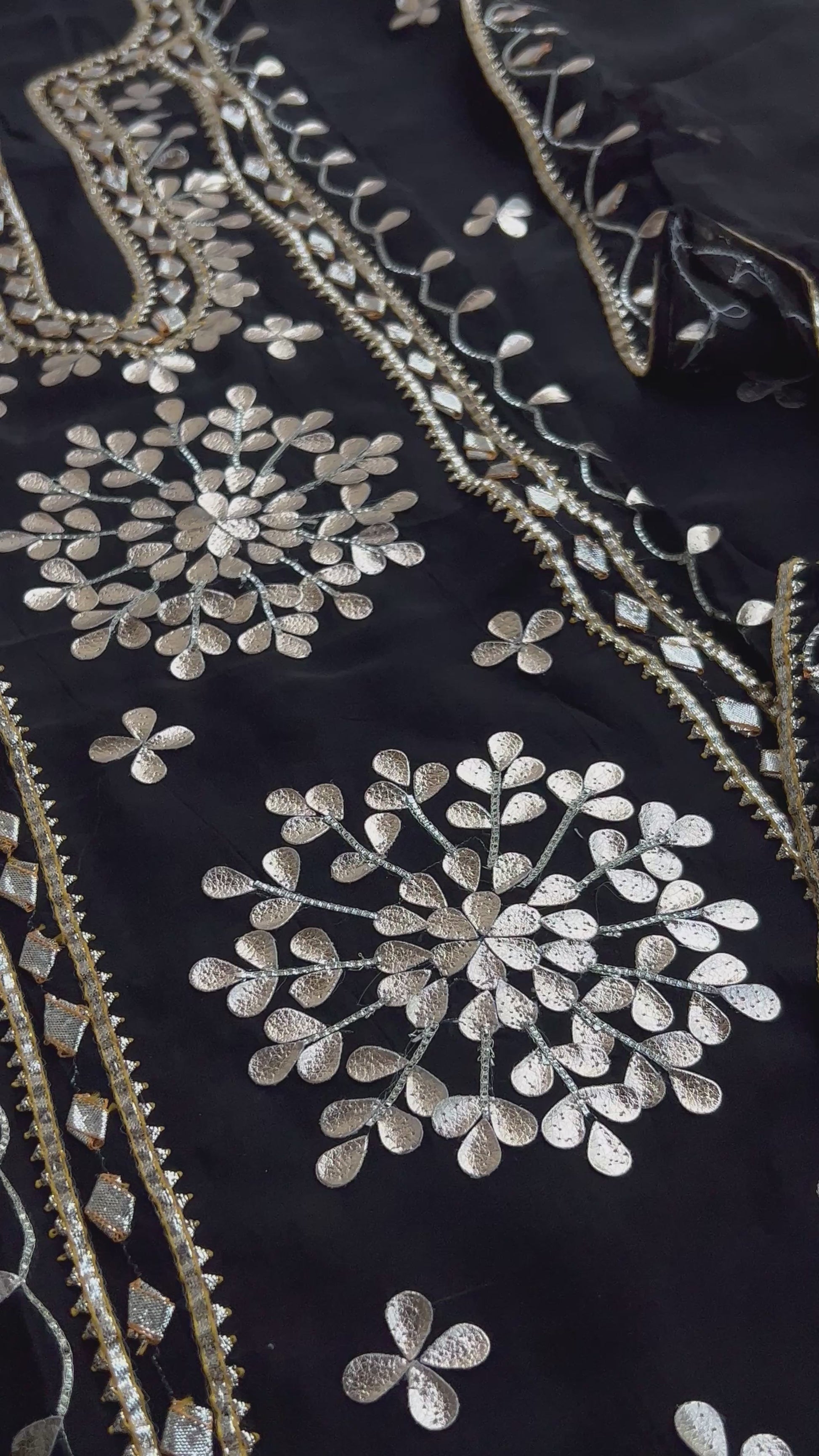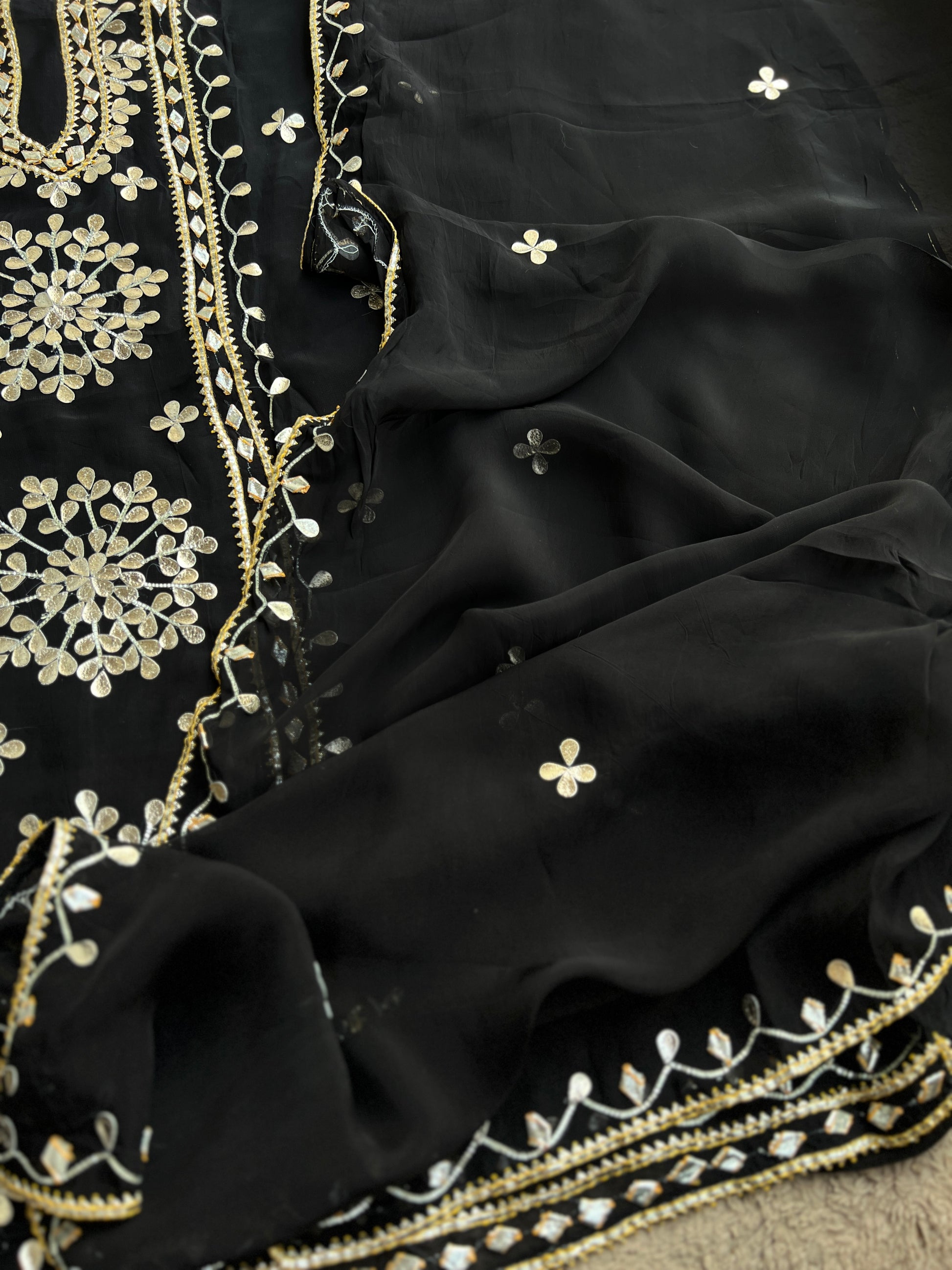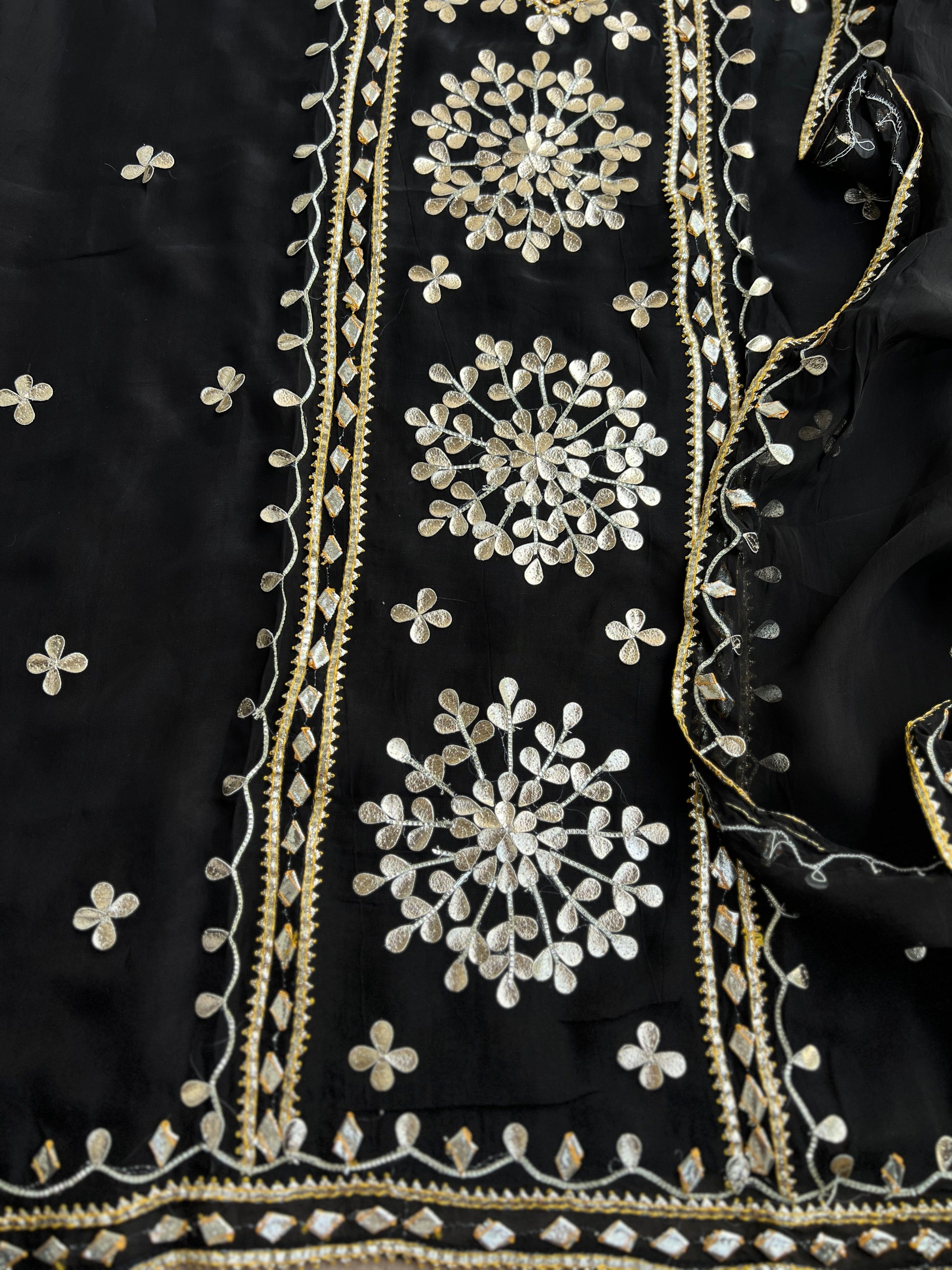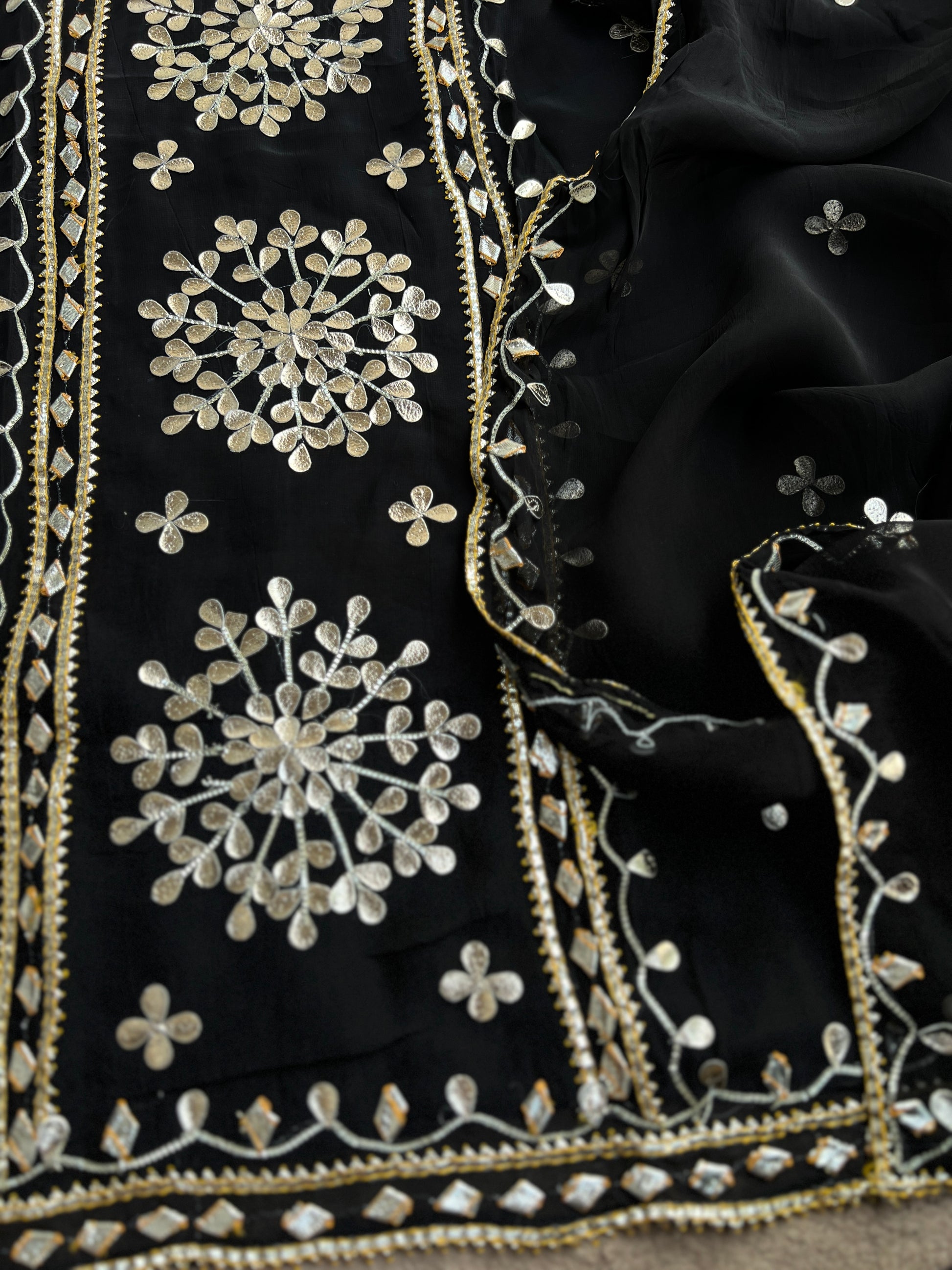 Indulge in timeless elegance with this beautifully crafted soft viscose organza suit set, adorned with intricate gota patti and mirror-inspired embroidery on the neckline and sleeves.