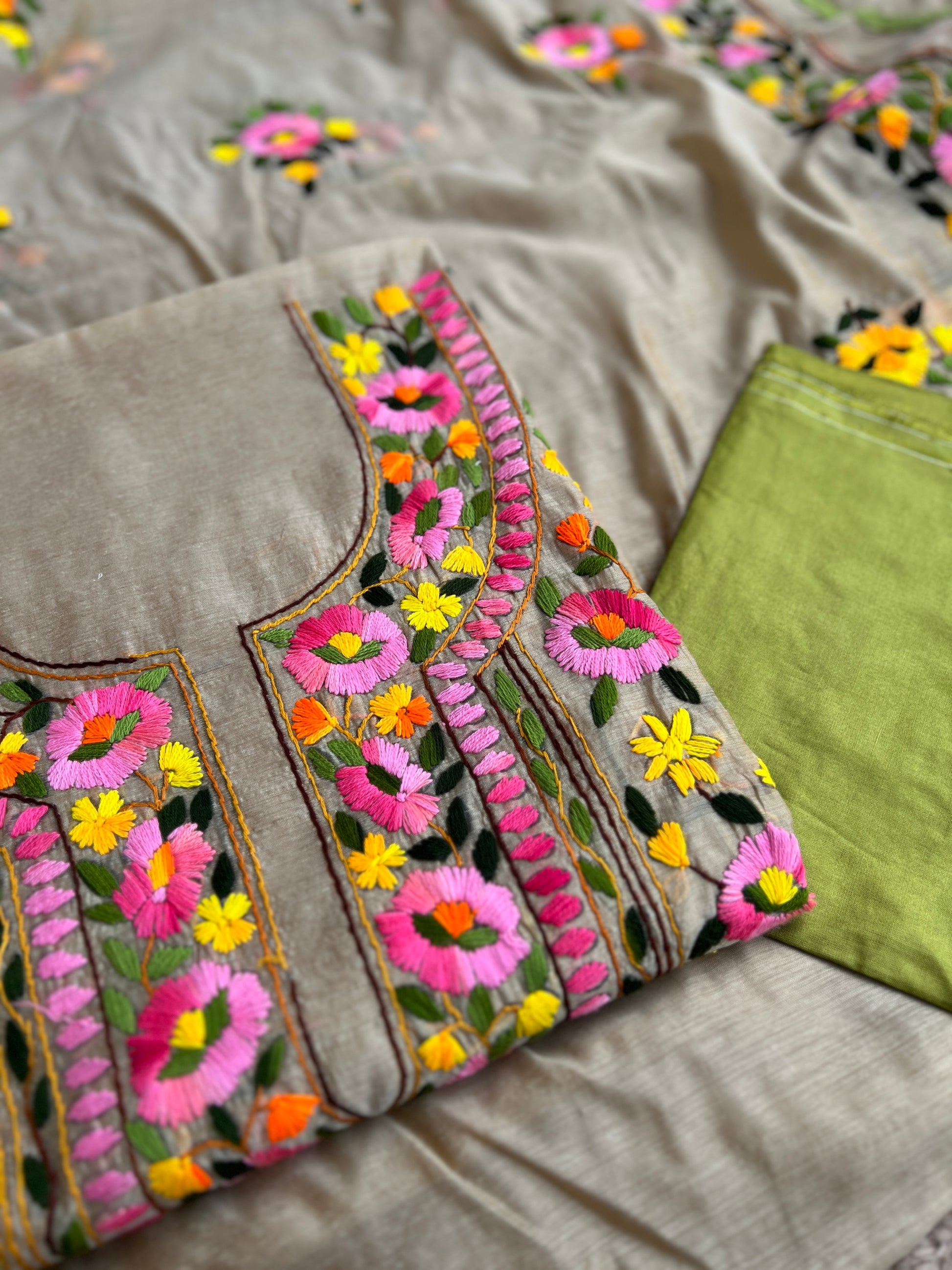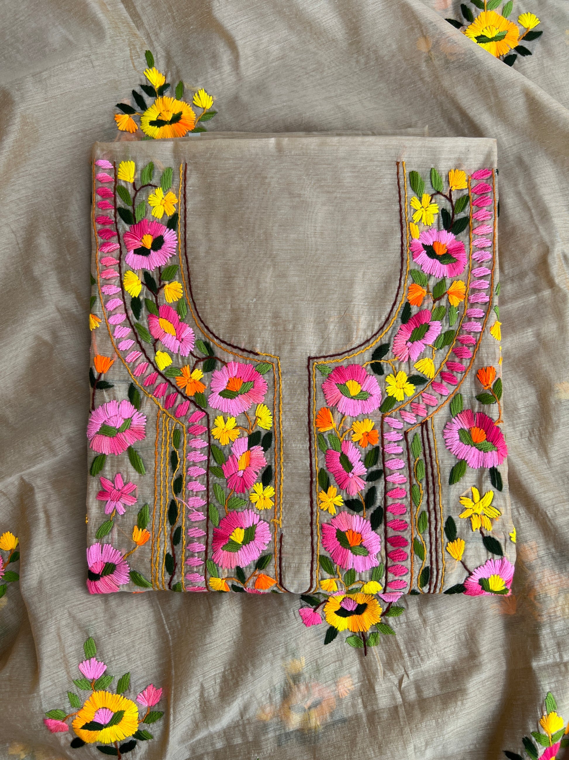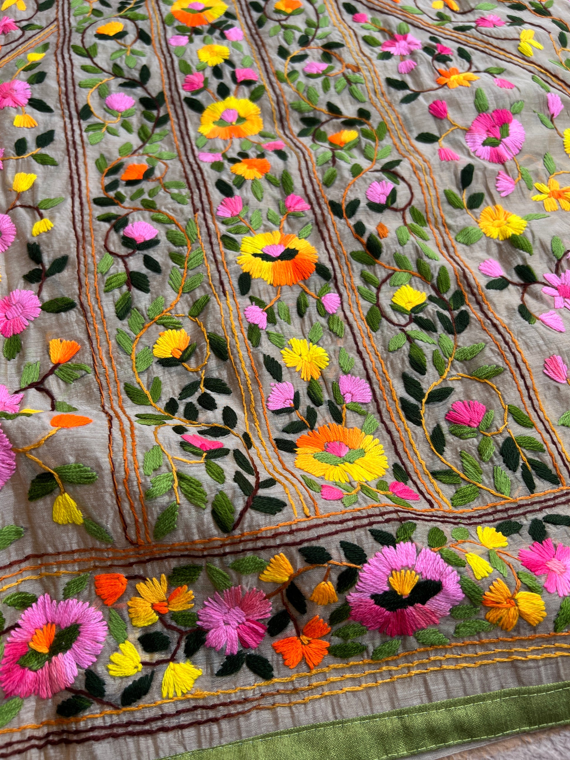 Elegant Beige Multi Phulkari Chanderi Silk Ensemble