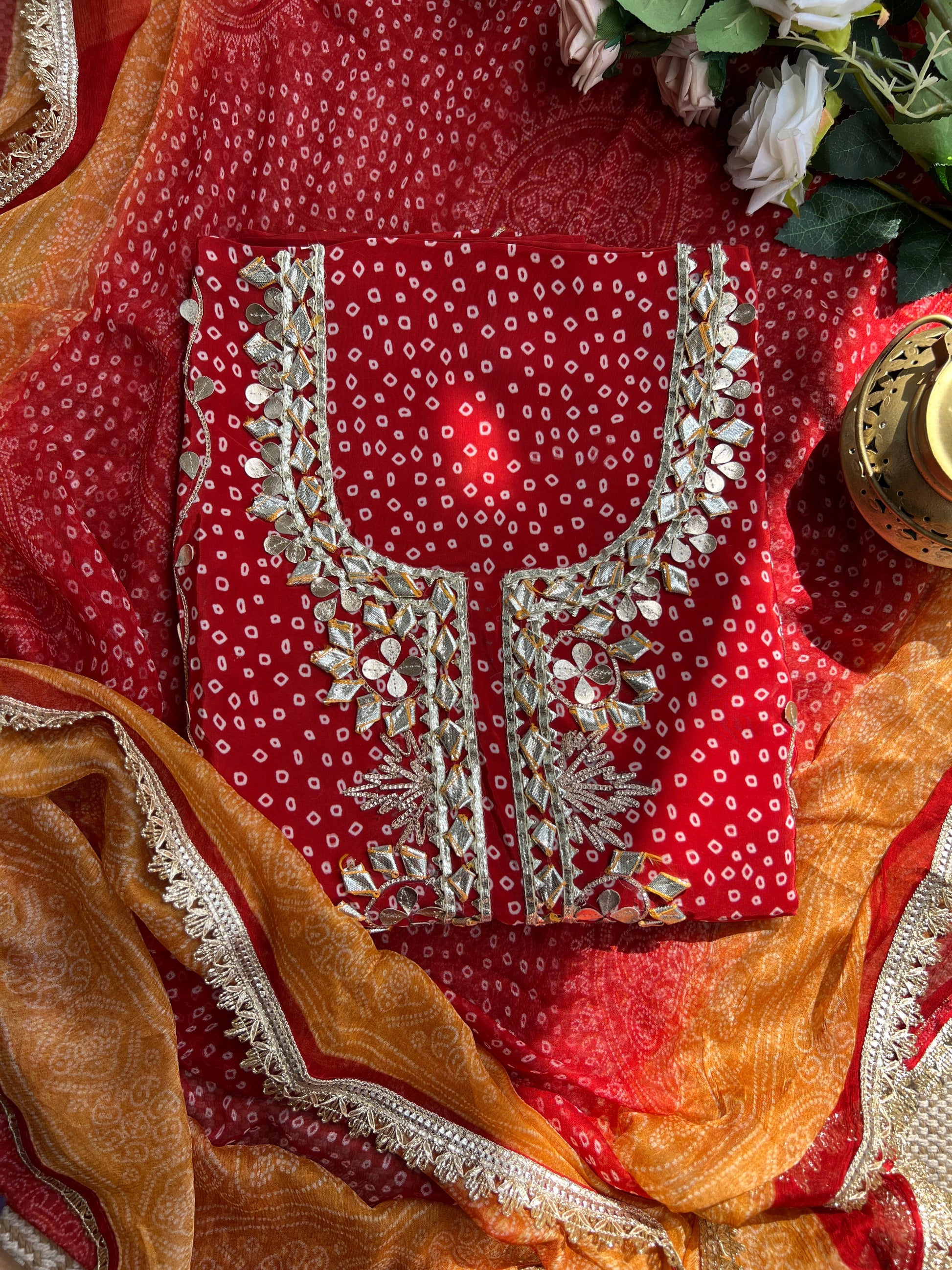 Elegant Crepe Bandhani Suit with Gotapatti Neck & Lace-Accented Chiffon Dupatta