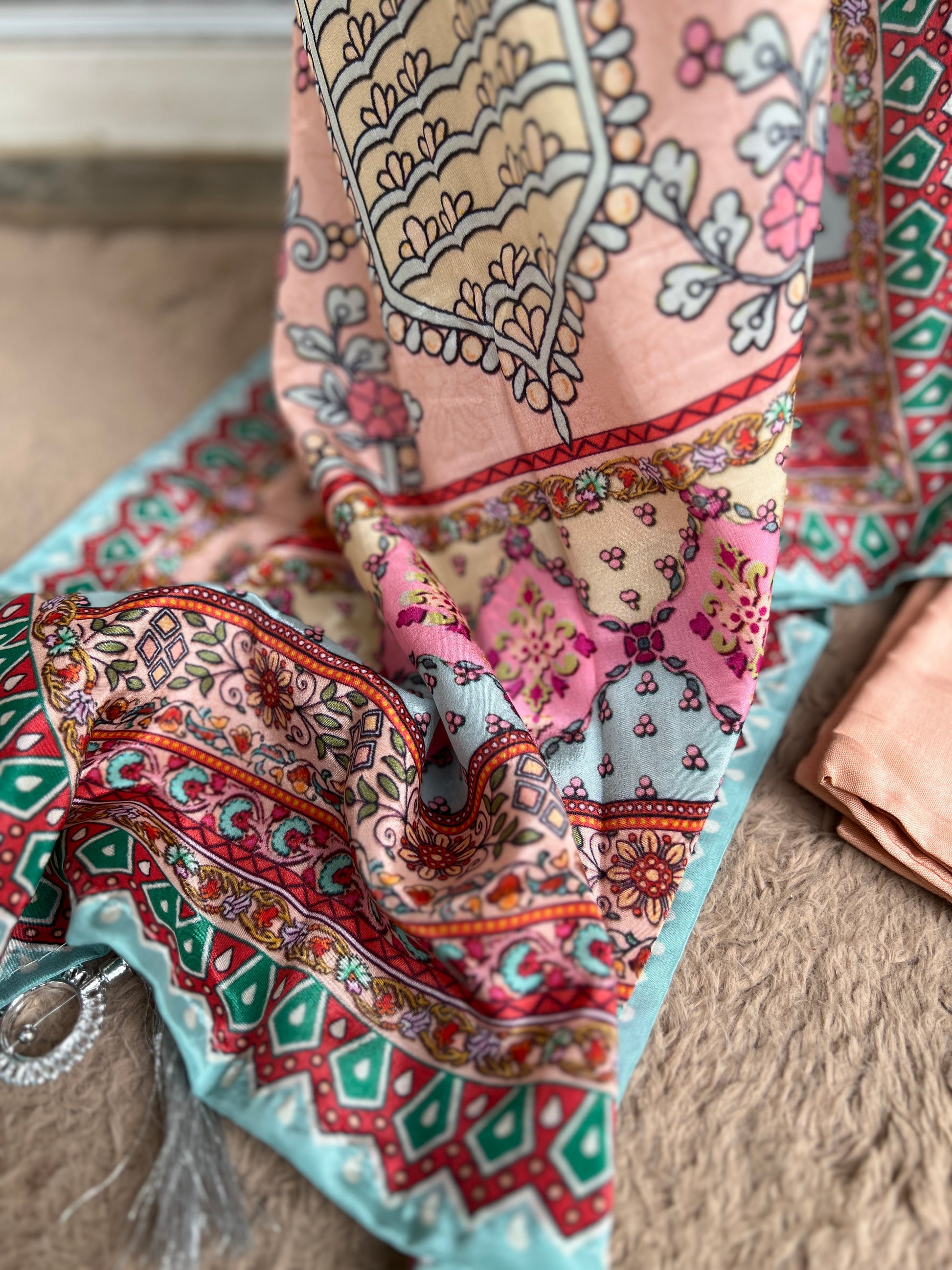 Turn heads with this beautifully designed Pakistani Crepe Salwar Suit, adorned with delicate mirror work and vibrant traditional prints. The soft crepe fabric drapes gracefully, while the intricate detailing on the neckline adds a festive charm. With its ready-to-wear stitched silhouette, this outfit is perfect for both casual gatherings and festive occasions.