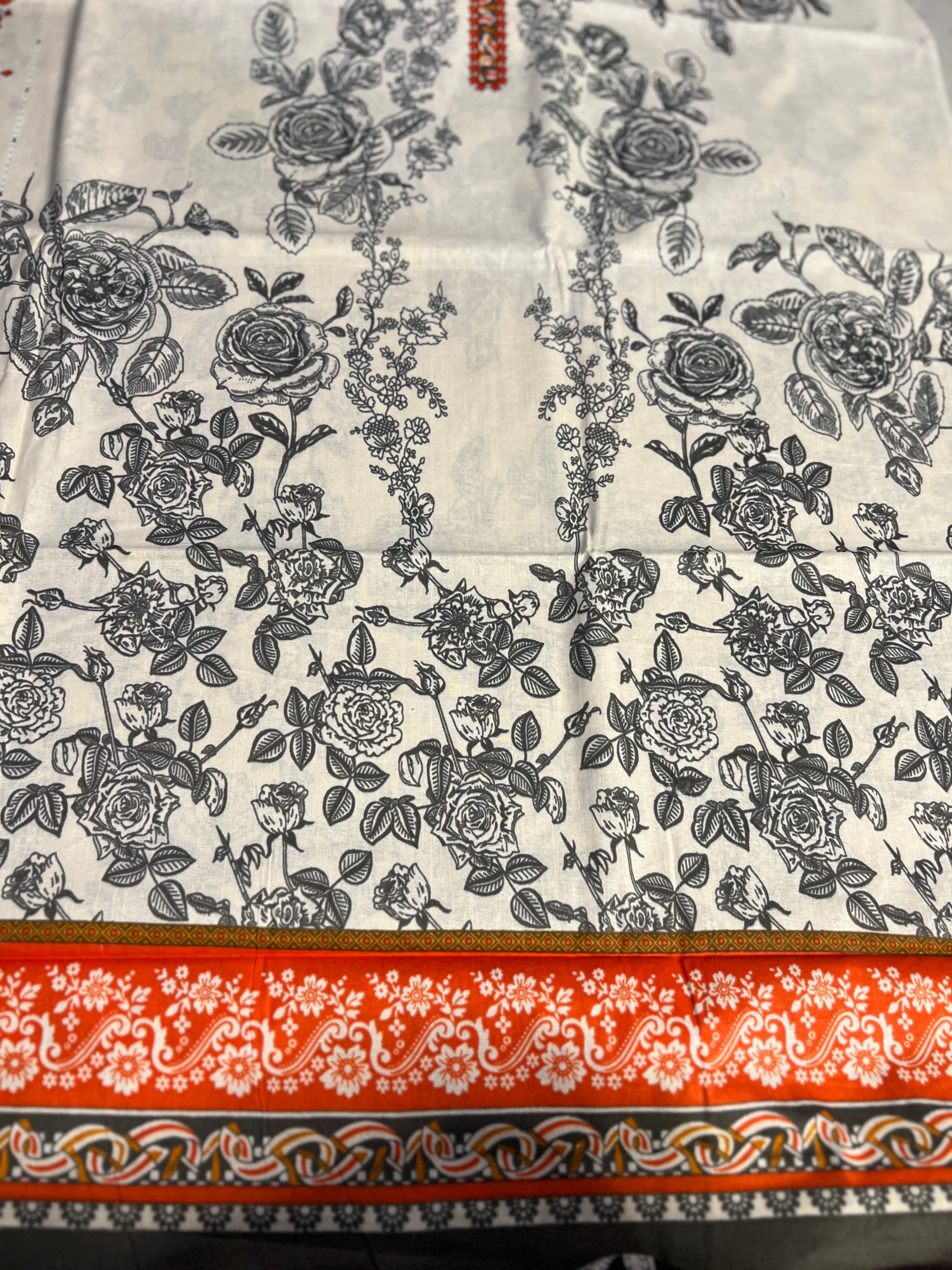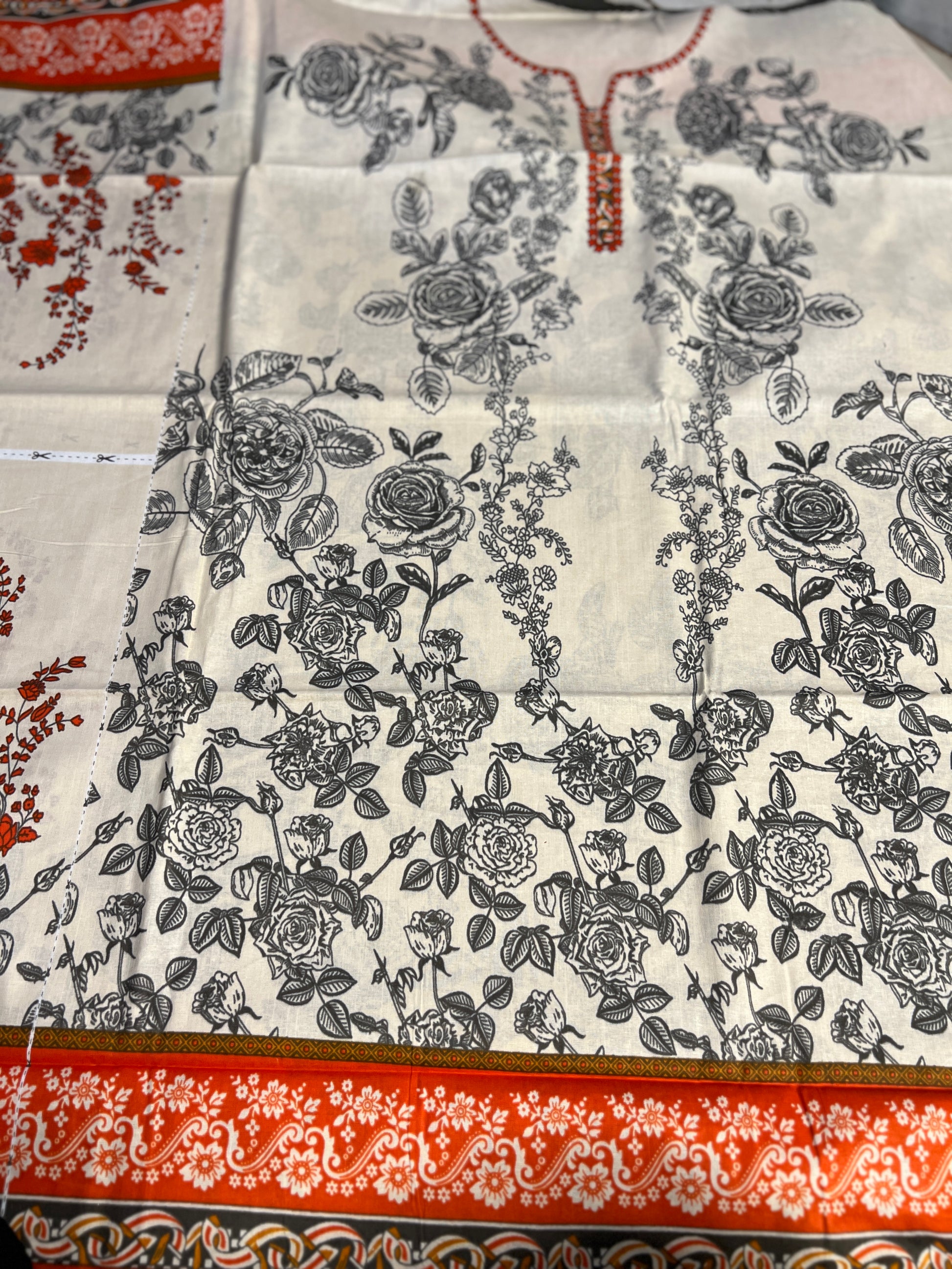 A timeless ivory base beautifully adorned with intricate black floral prints and highlighted with subtle rust orange detailing on the neckline and borders. The contrast dupatta with coordinated prints enhances the overall grace of the outfit, making it perfect for office wear, casual gatherings, and everyday elegance.