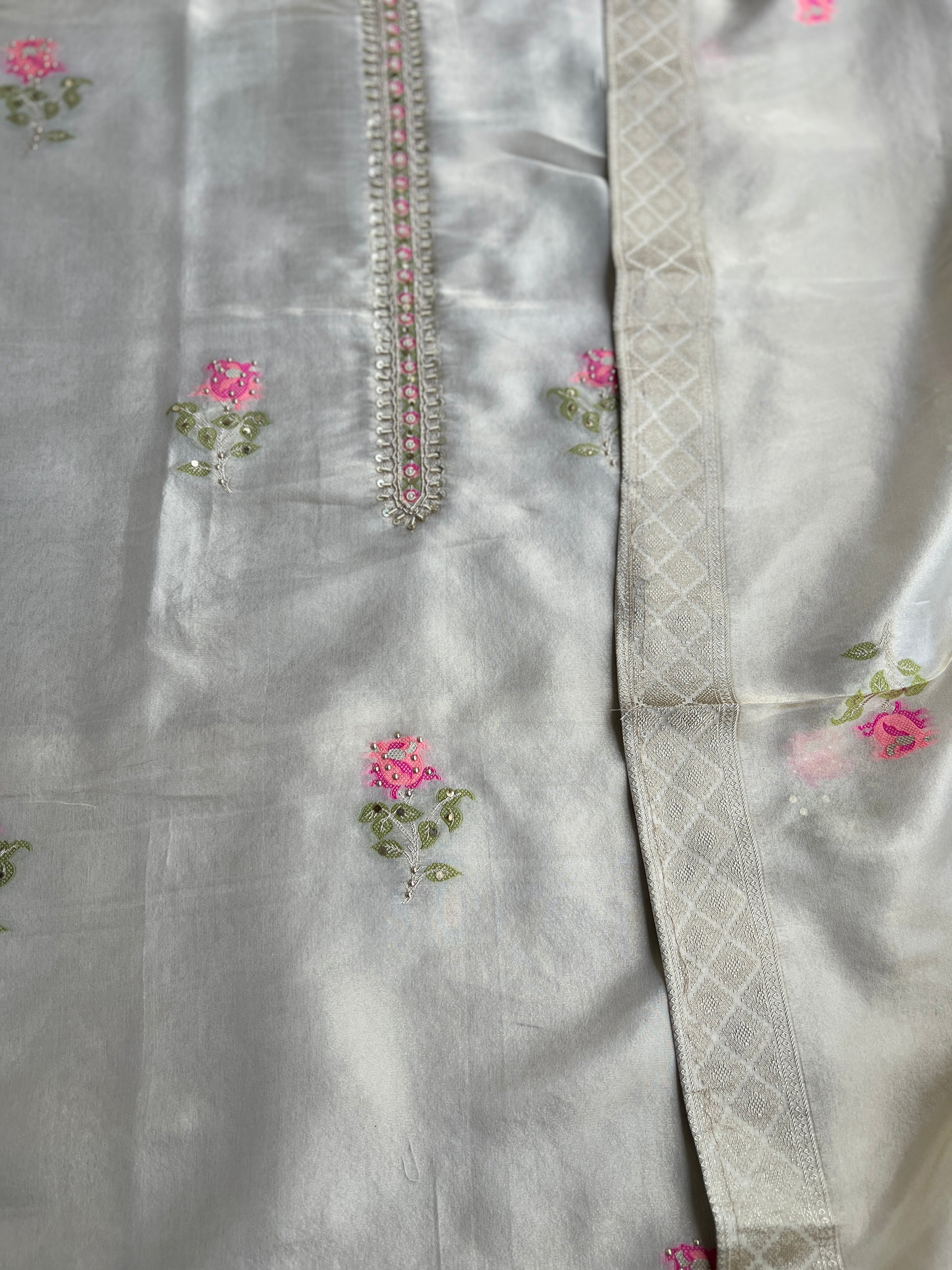 The set is paired with a stunning Banarasi woven dupatta, adorned with intricate floral patterns that showcase classic craftsmanship.