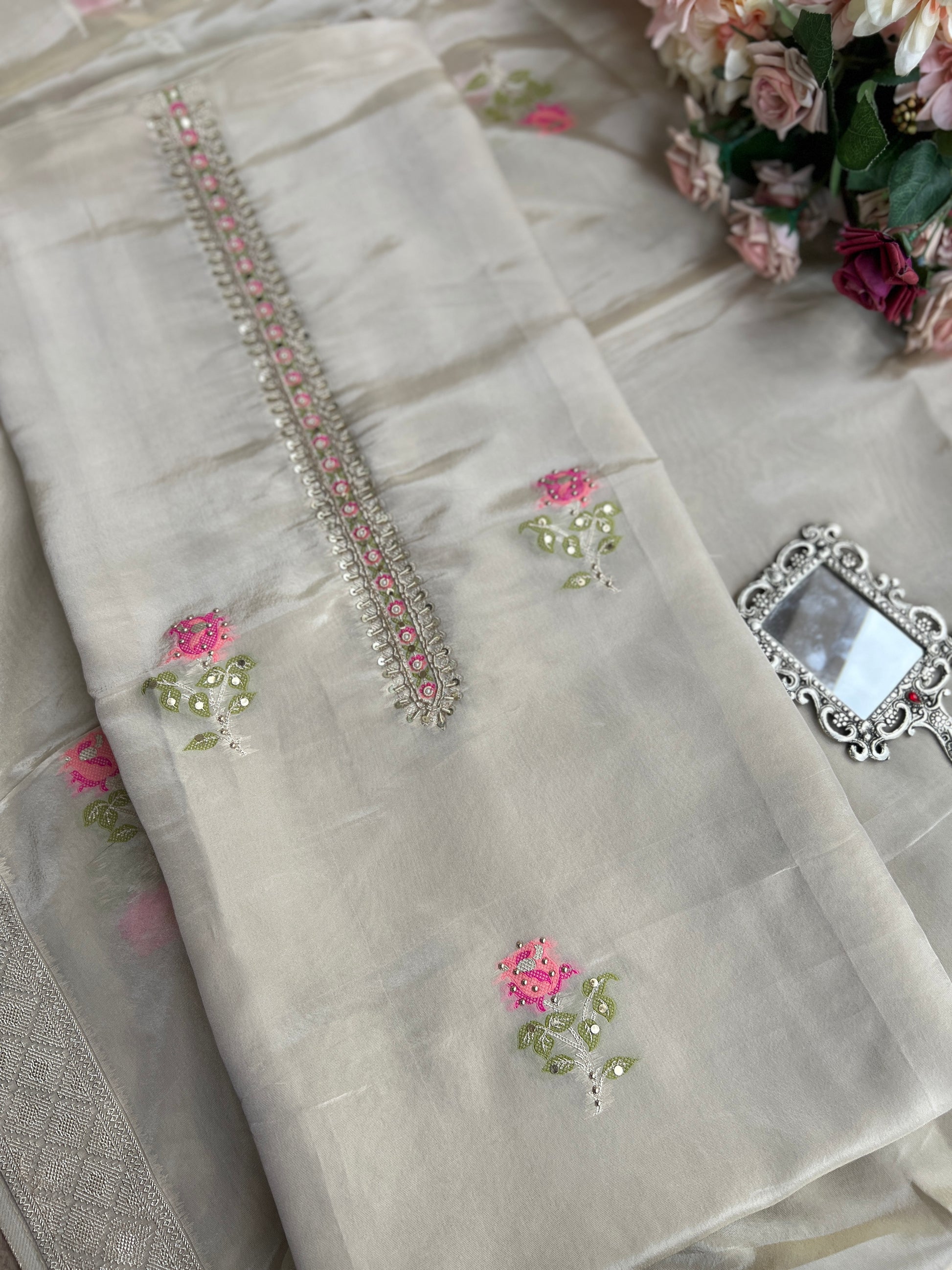 Elegant Kanjivaram Floral Weave Suit with Handworked Neckline & Banarasi Dupatta