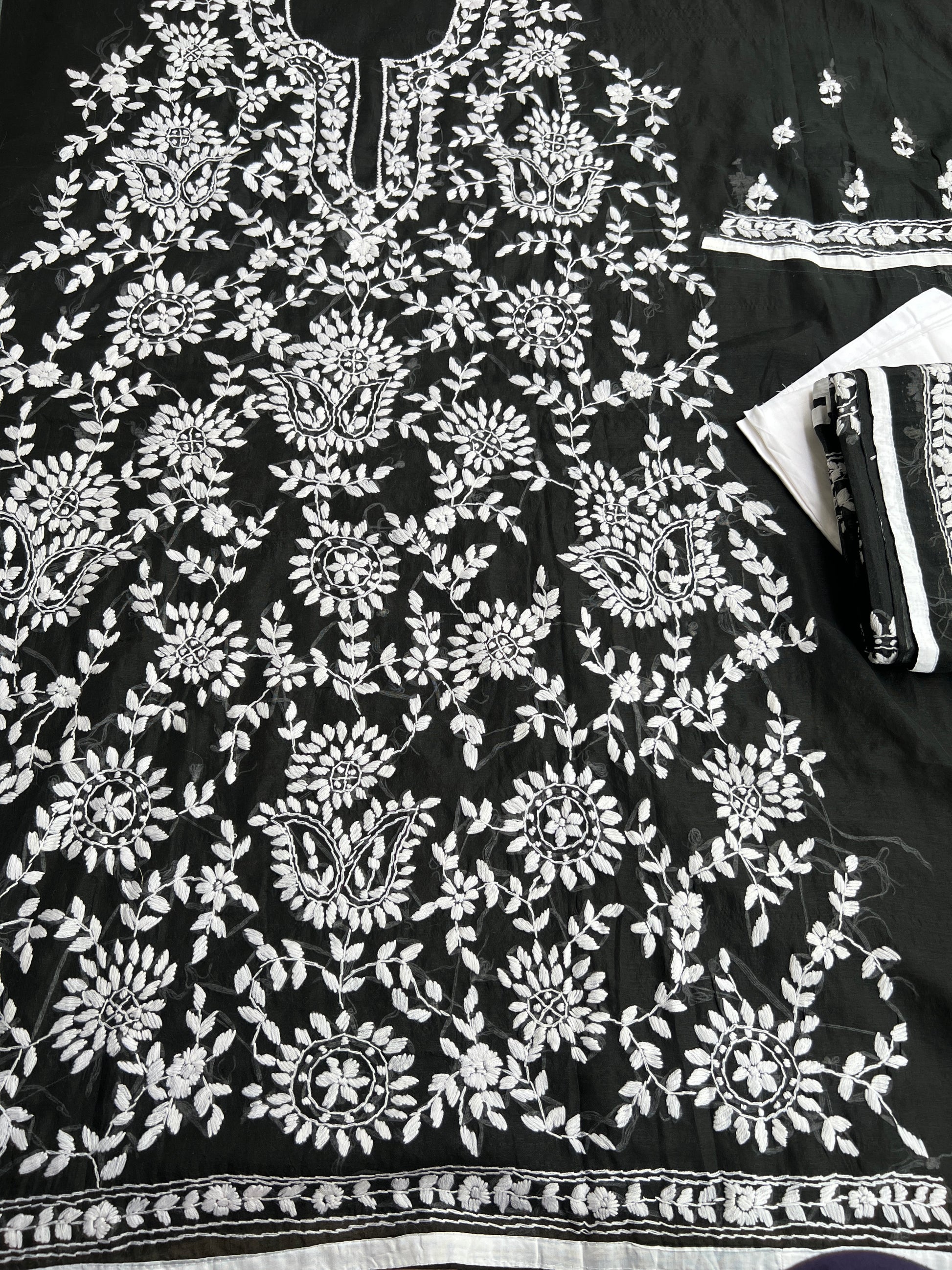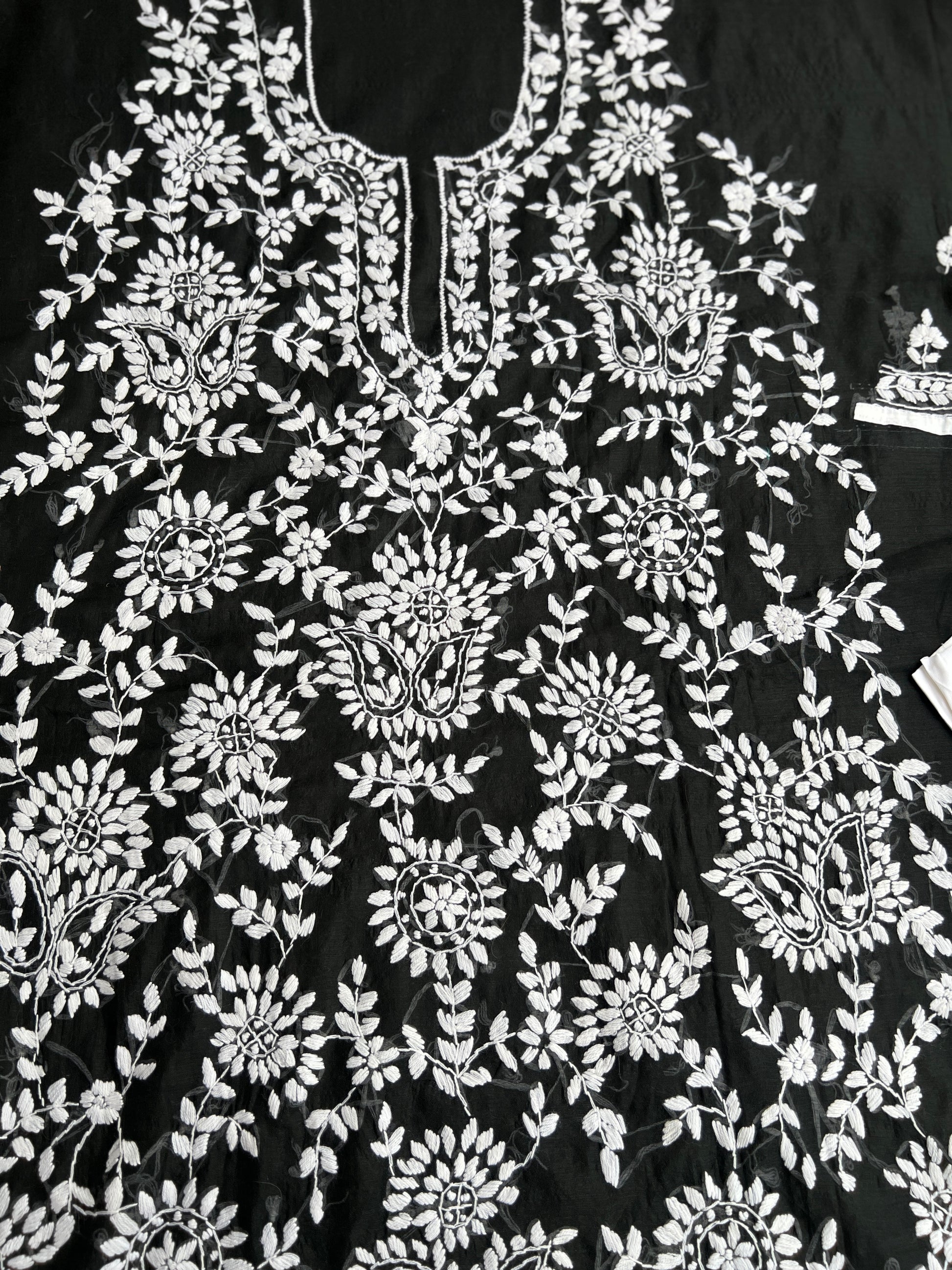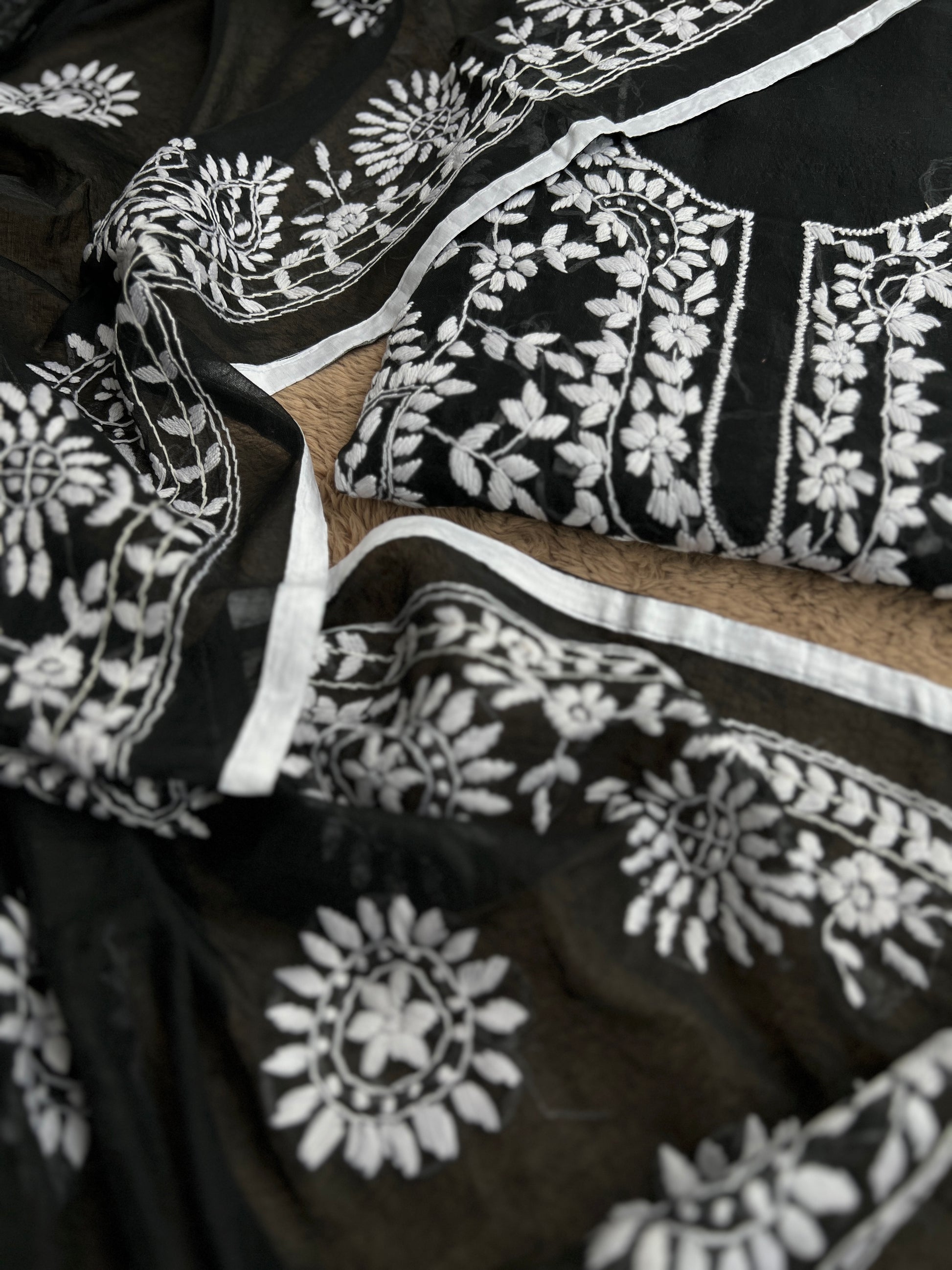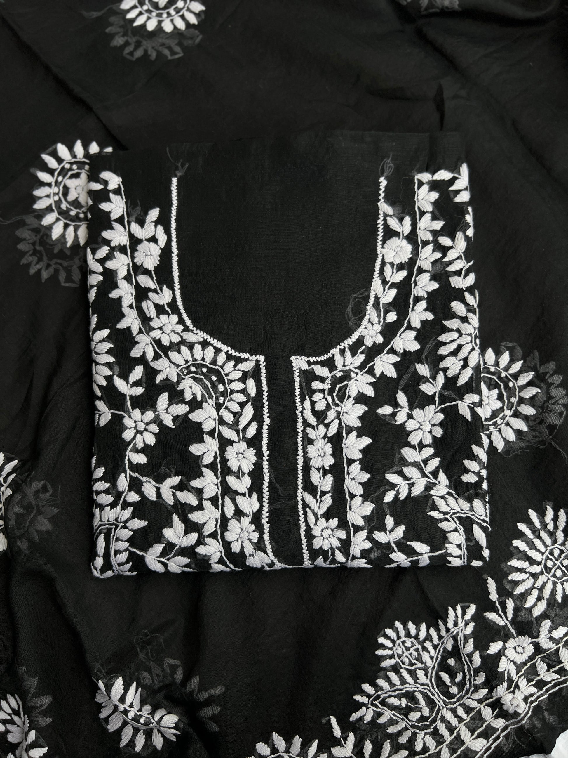 Step into elegance with this white and blackPhulkari suit, featuring a chanderi silk shirt and dupatta beautifully detailed with delicate white embroidery. Paired with a white cotton silk bottom, this ensemble is a graceful fusion of tradition and sophistication. The contrast of royal blue and white makes it a timeless piece β perfect for festive wear, family gatherings, and cultural occasions.