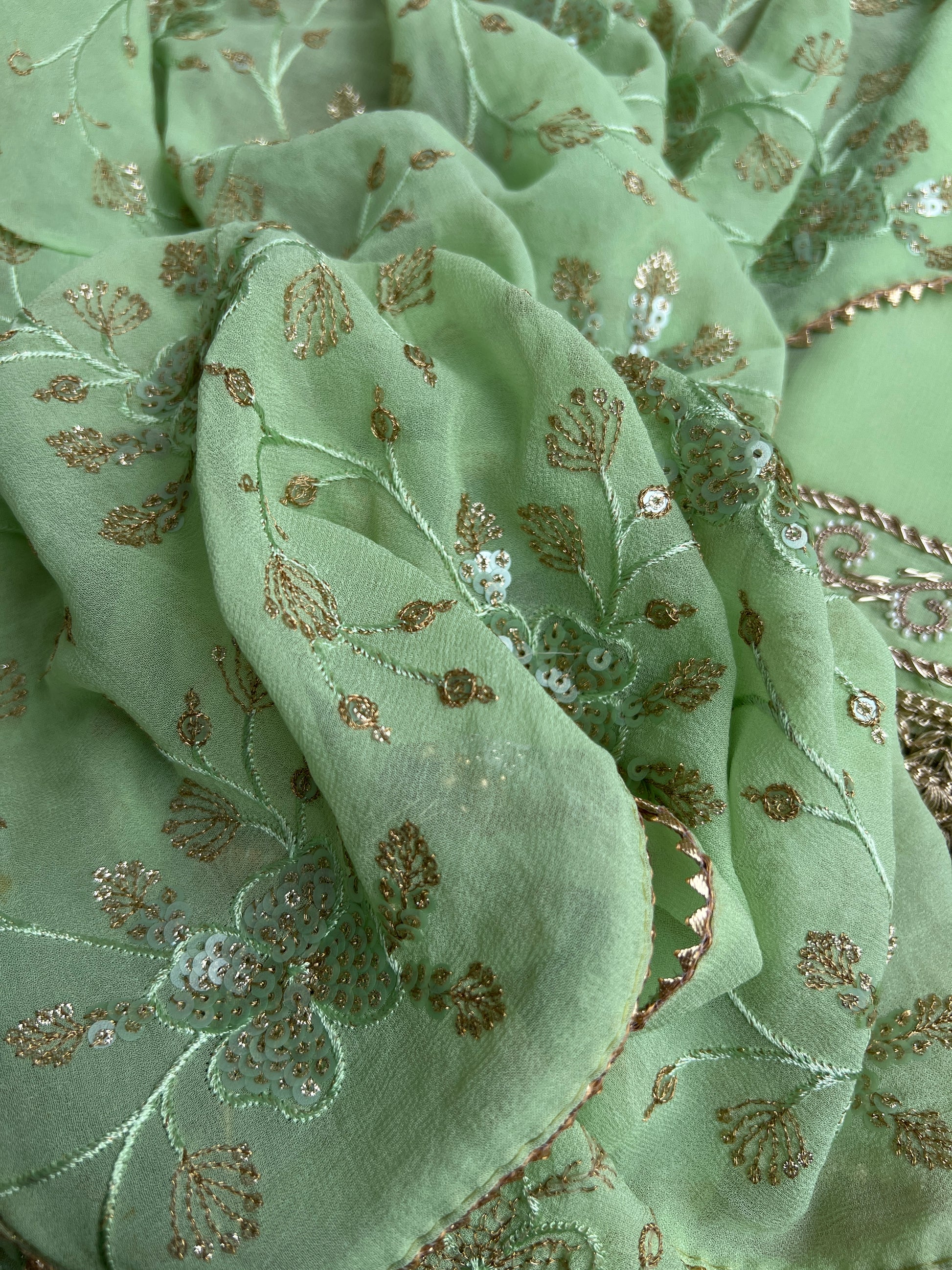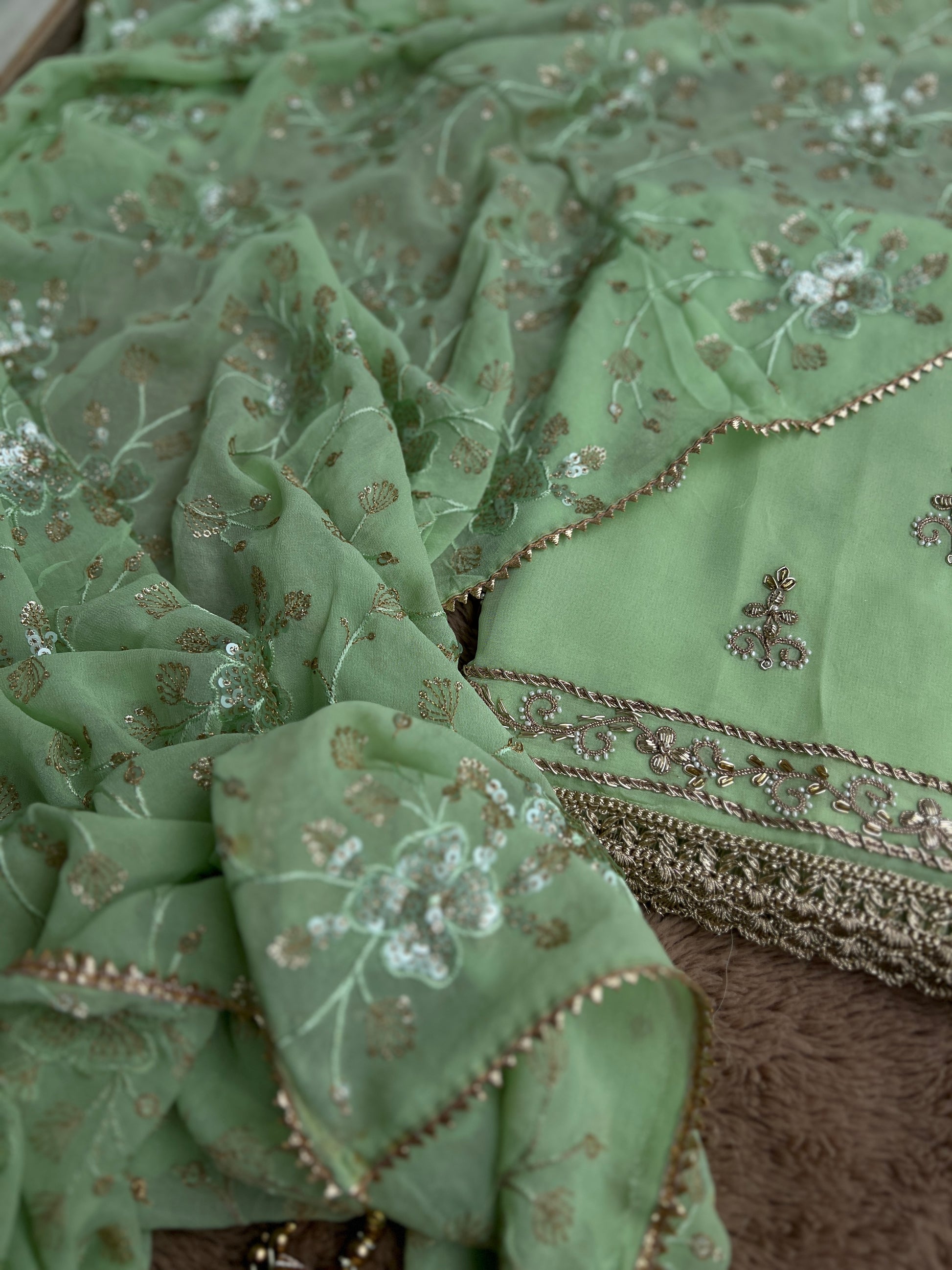 This stunning georgette fabric ensemble is a perfect blend of traditional craftsmanship and modern sophistication. The top features intricate handwork along the neckline, adorned with delicate silver and gold zari embroidery, complemented by all-over botti (small floral motifs) that add a subtle shimmer across the fabric. The daman (hemline) is exquisitely detailed with matching embroidered work, enhancing the outfitβs grandeur. The ensemble includes a lining for added comfort and a bottom piece attached for a seamless fit. Paired with a beautifully embroidered dupatta, this set showcases lightweight georgette with intricate patterns and a shimmering border, making it ideal for festive occasions or elegant gatherings. The soft, flowing texture of the georgette fabric ensures a graceful drape, while the meticulous handwork elevates its luxurious appeal.