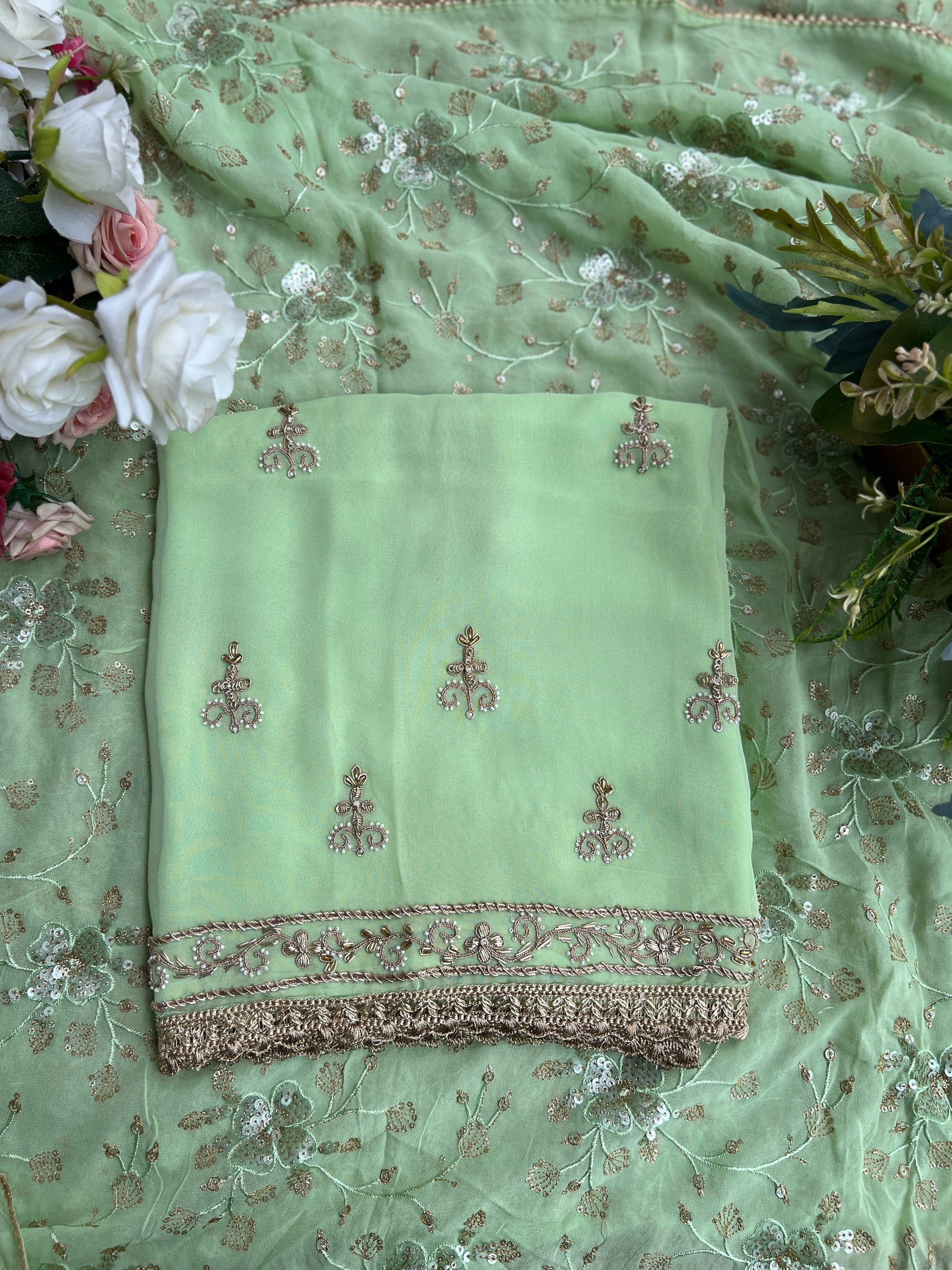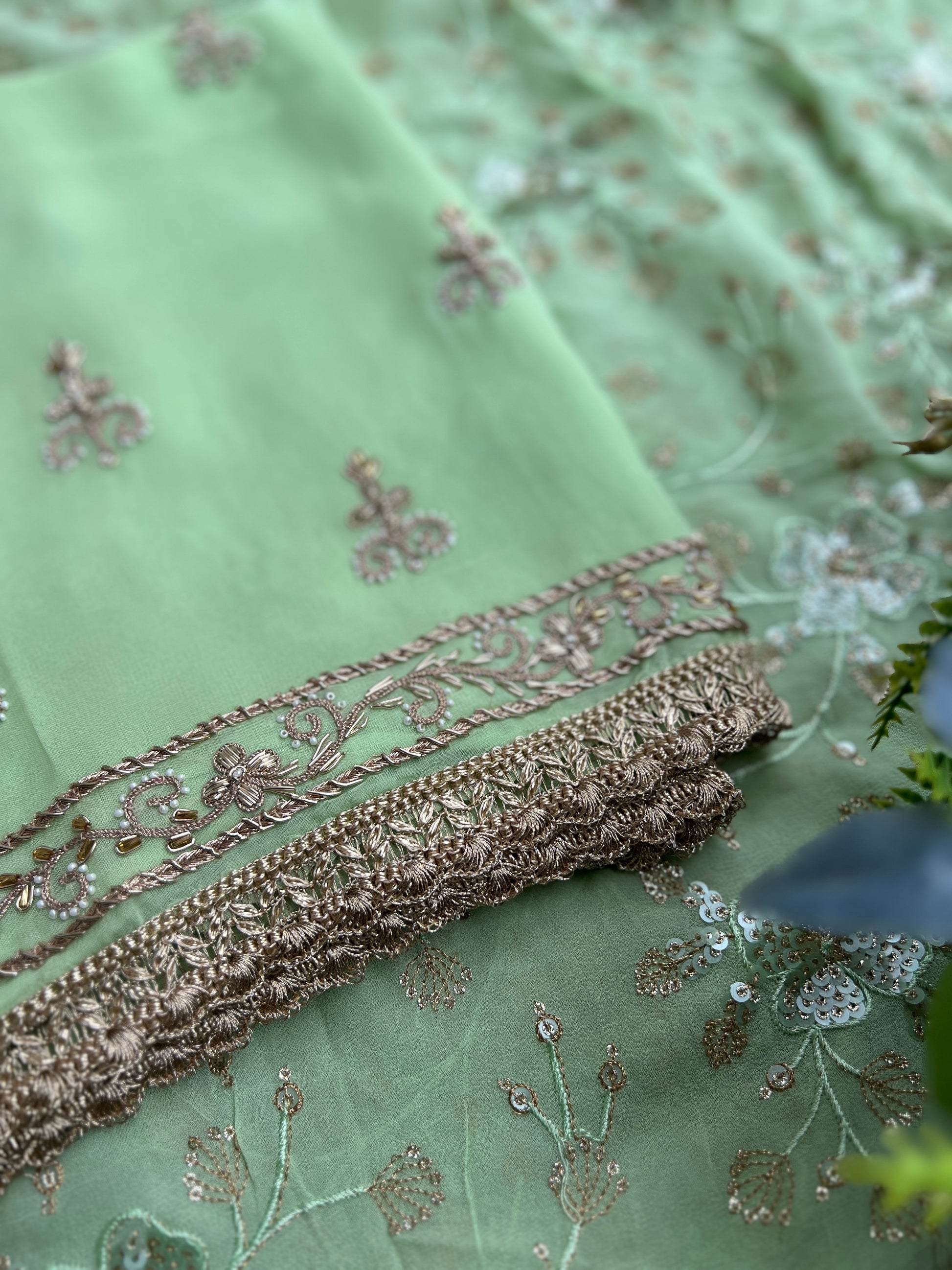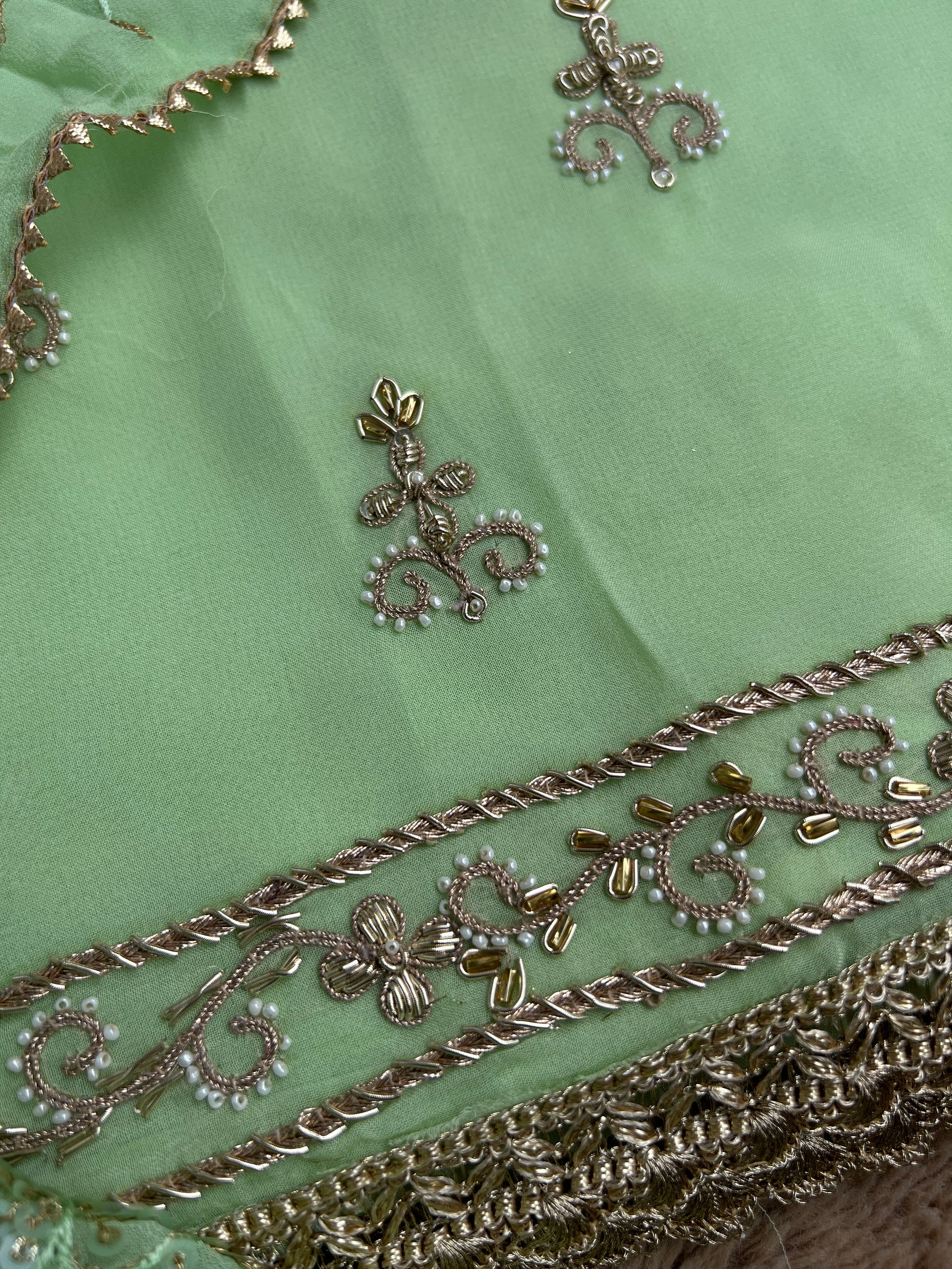 Care Tip: To maintain the beauty of this georgette ensemble, hand wash gently with mild detergent in cold water or opt for dry cleaning to preserve the embroidery and fabric texture. Avoid direct sunlight while drying, and store in a cool, dry place to prevent damage to the delicate zari work and botti. Iron on low heat with a pressing cloth to protect the embellishments.