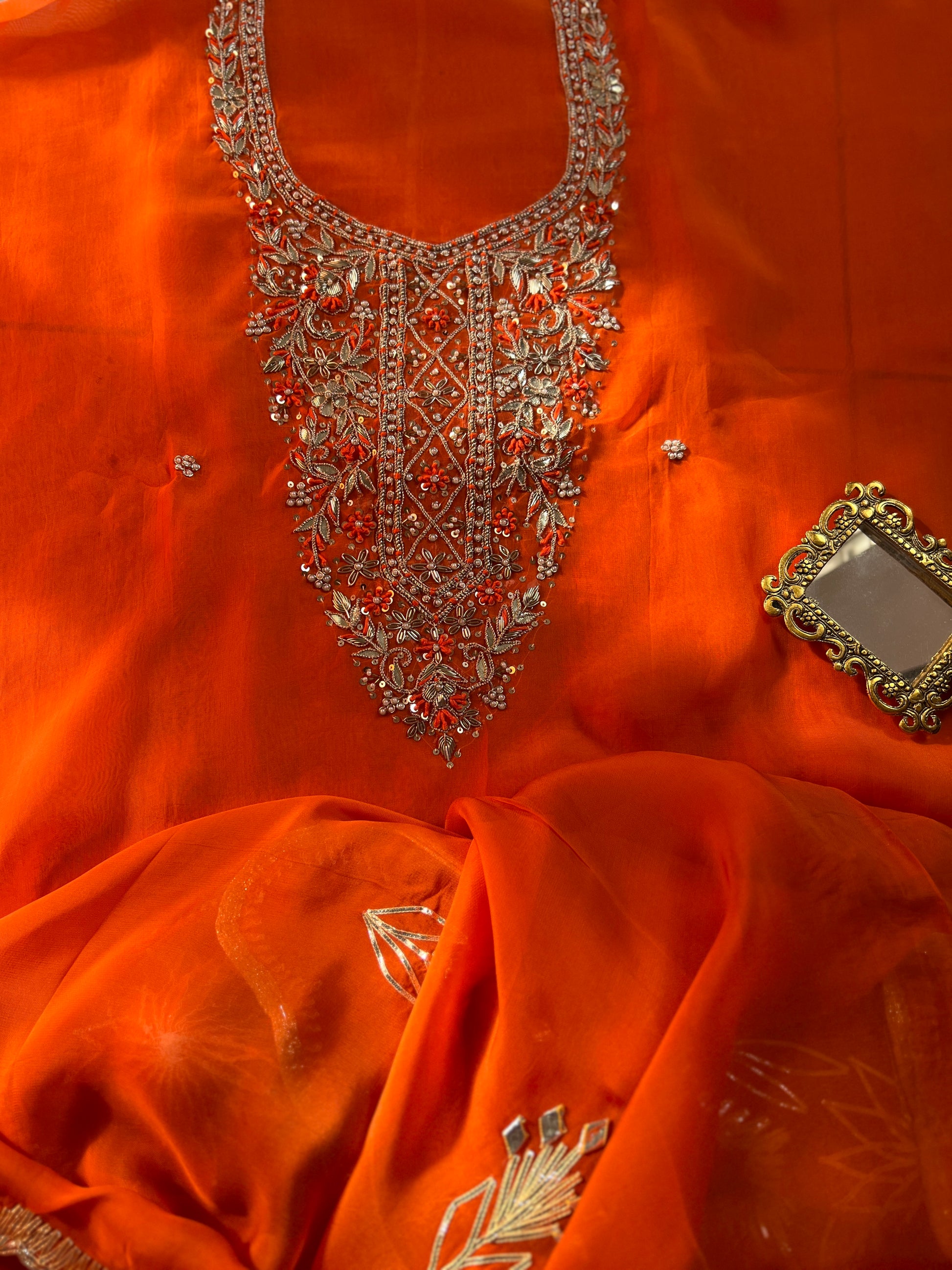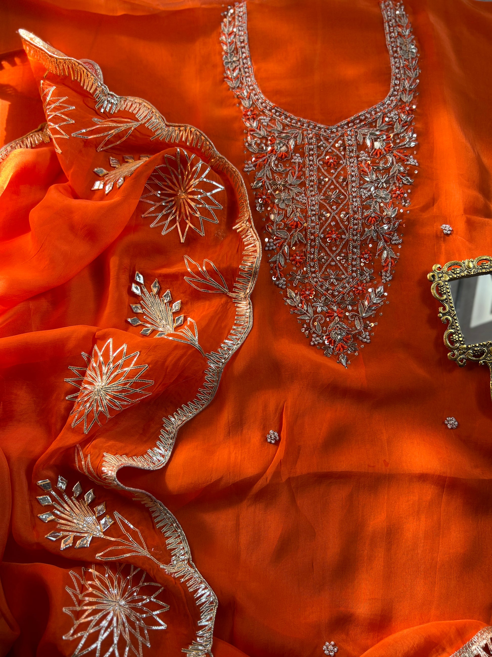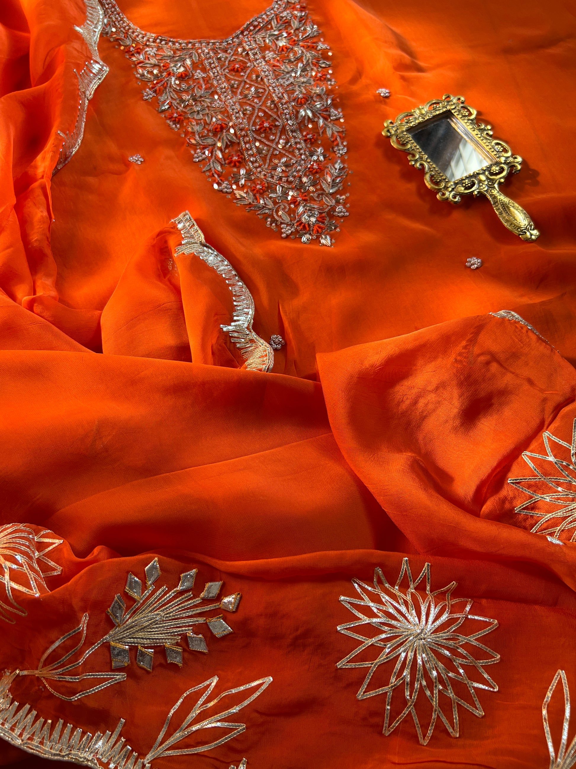 Fanta Orange Organza Ensemble with Handwork & Gotaphool Detailing