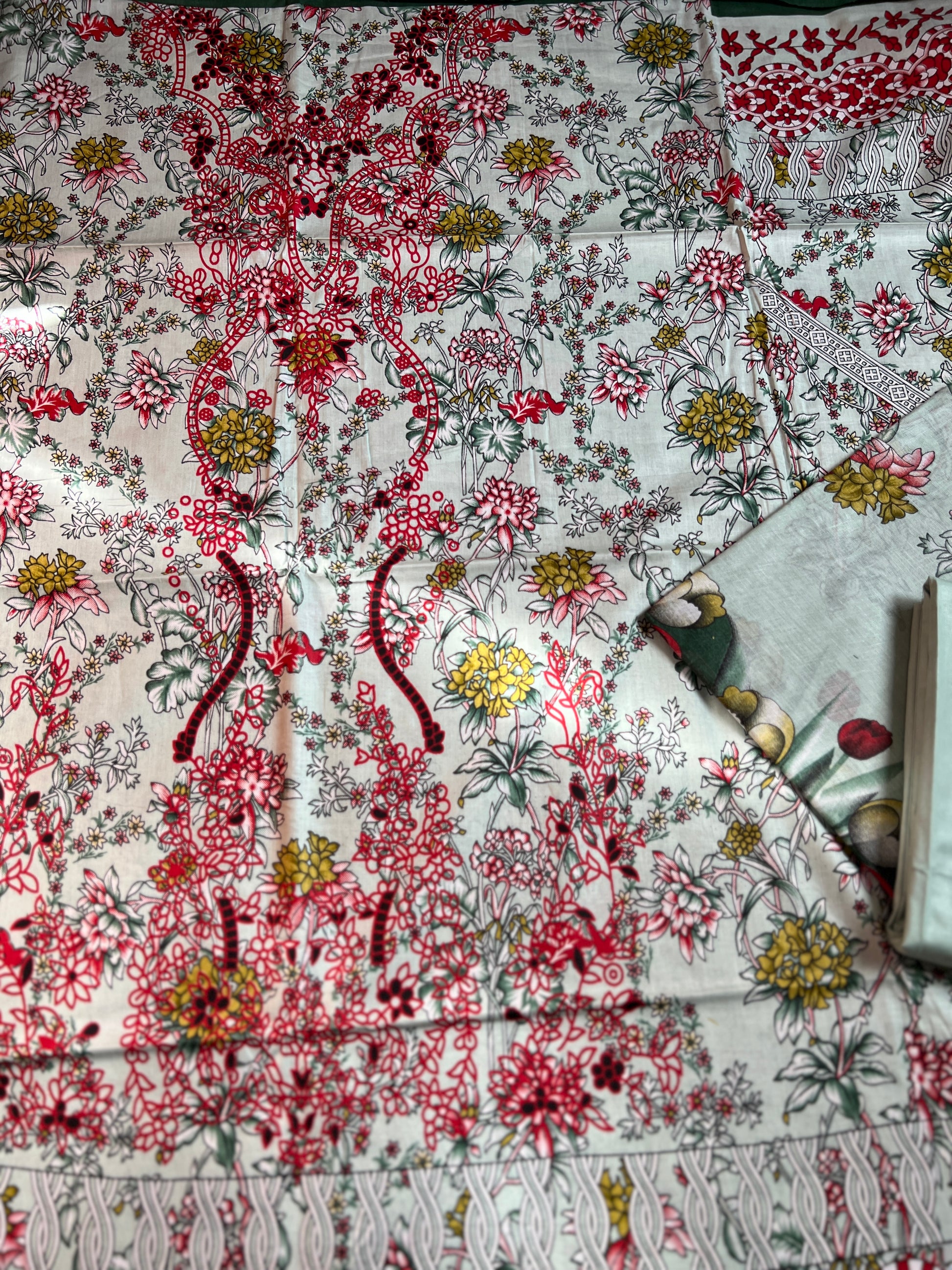 Refresh your summer wardrobe with this beautifully printed cotton suit set featuring delicate floral patterns in soft pastel tones with vibrant red detailing. Designed to offer both elegance and comfort, this breathable cotton fabric keeps you cool and stylish all day long.