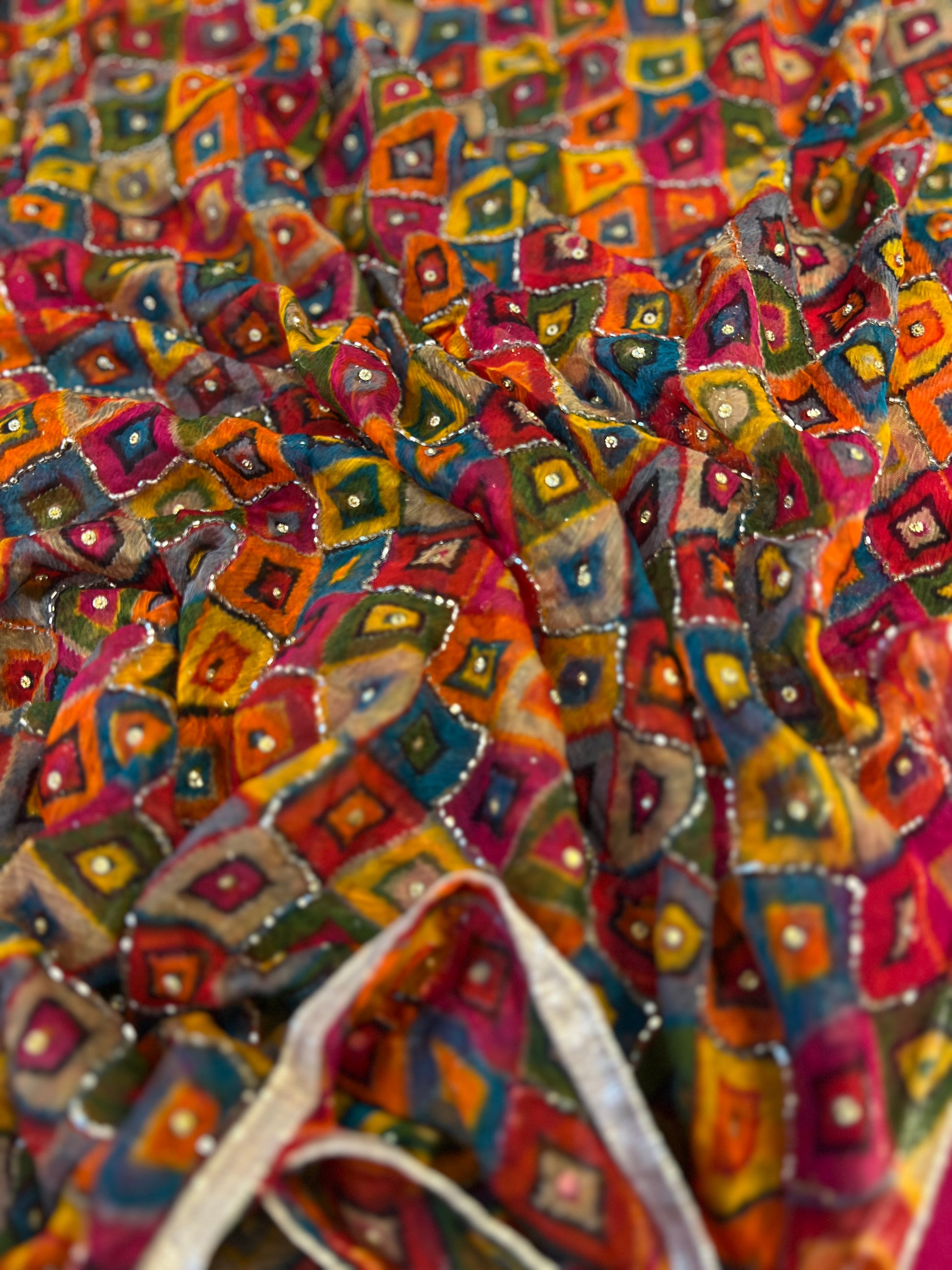- Top: Luxurious silk adorned with Kalkatta hand embroidery on the neckline and delicate Mukesh work all over.