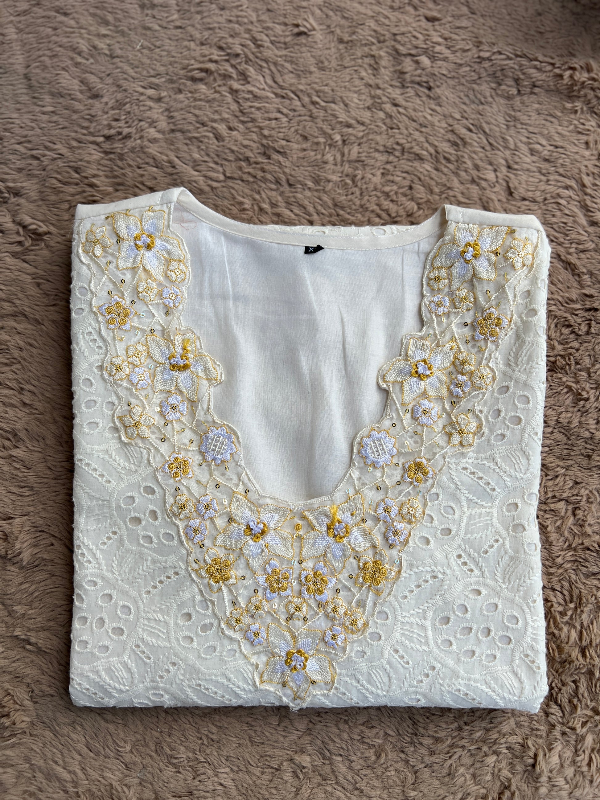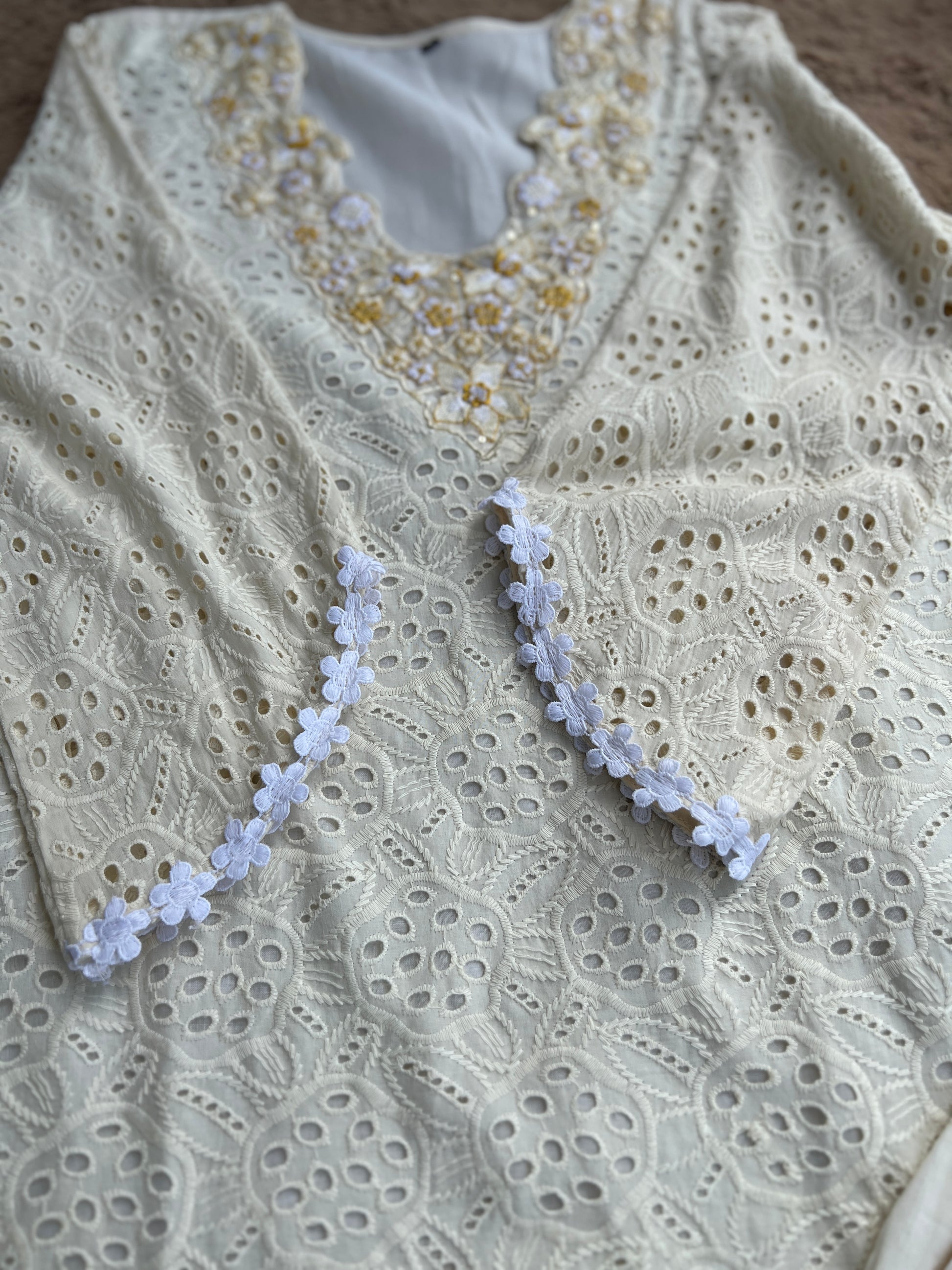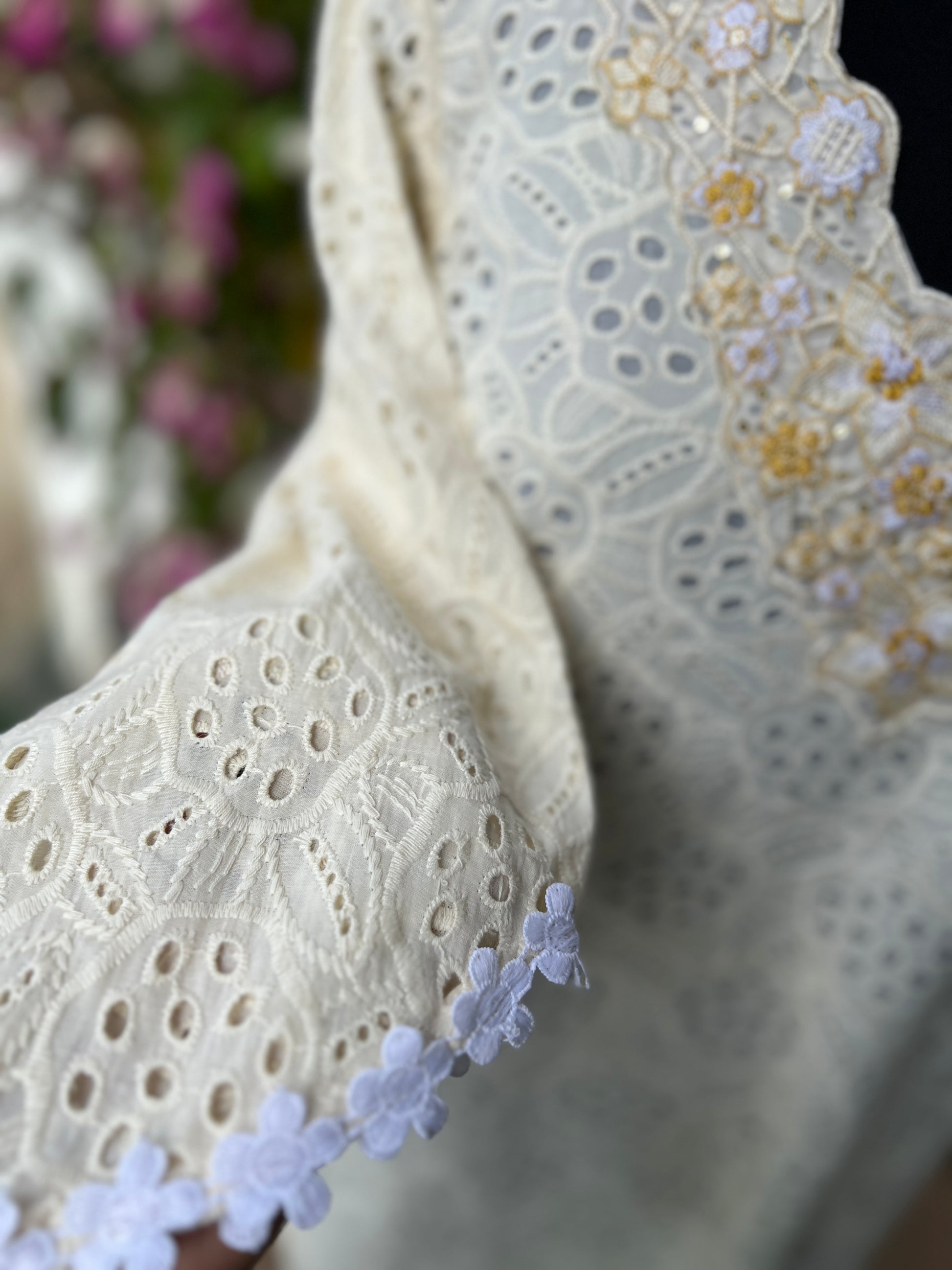 - Dry clean preferred to maintain embroidery and fabric texture