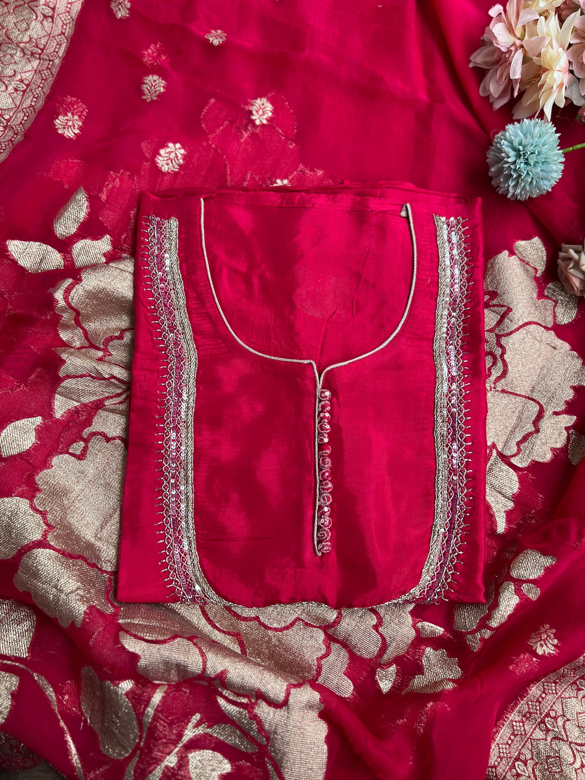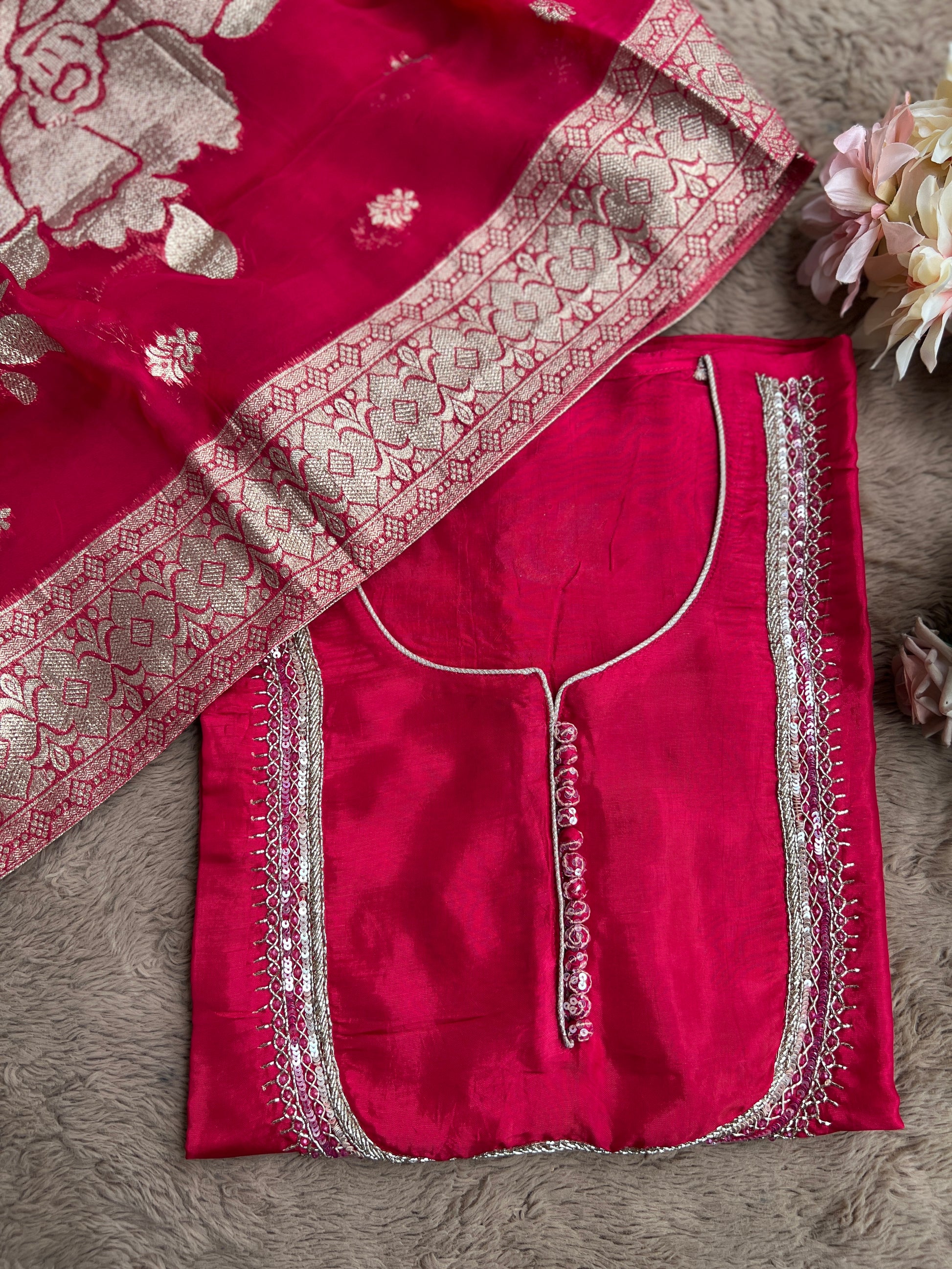 Exude sheer elegance in this U neck Russian silk top, intricately hand-embroidered with delicate detailing on the neckline and motifs across the fabric. Paired with a luxurious silk bottom and a statement contrasting hot pink Dola Banarasi silk dupatta woven with zari florals, this ensemble strikes the perfect balance of regal charm and modern grace. Ideal for weddings, festive evenings, and grand celebrations.