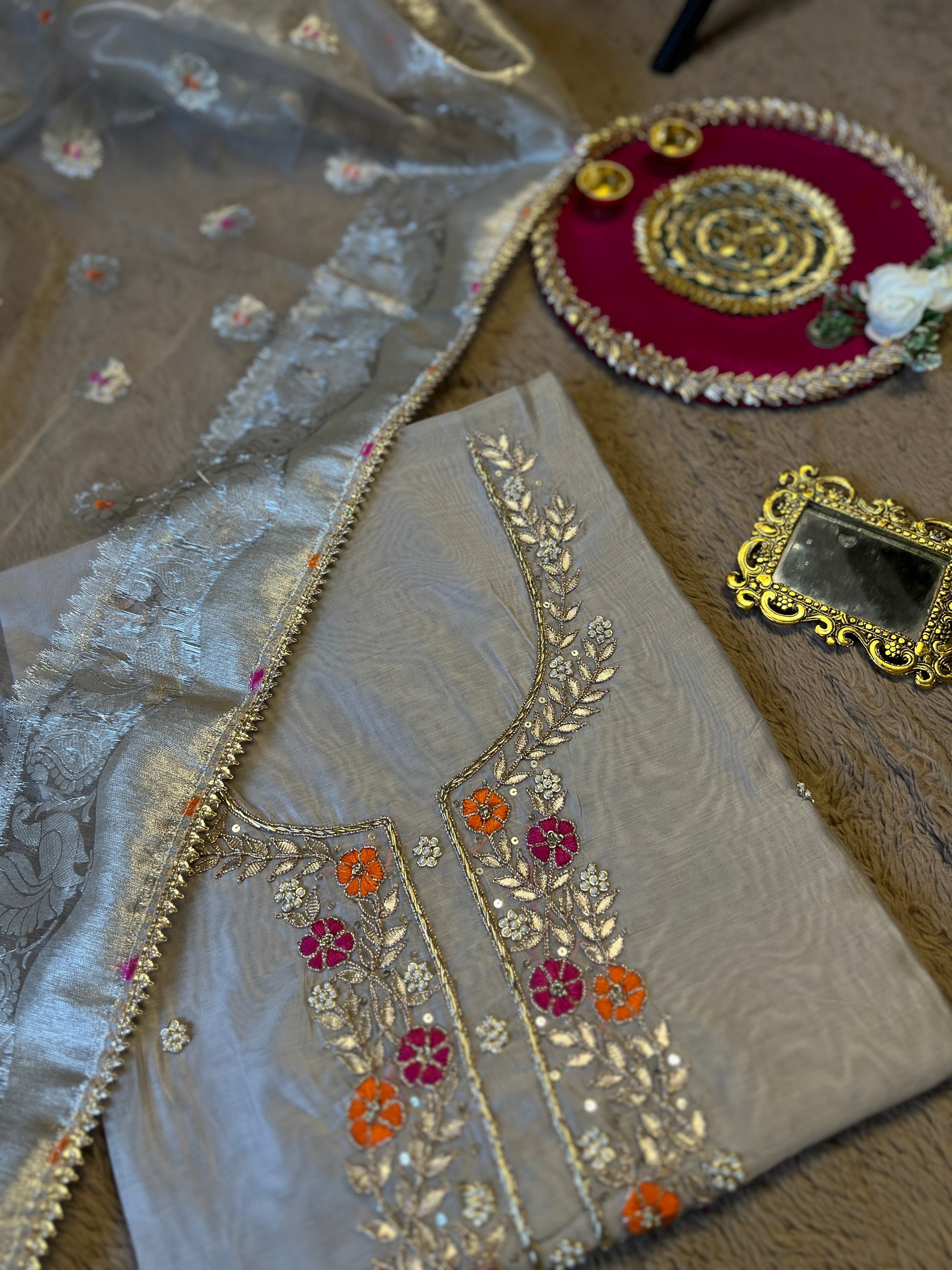 - Dry clean only to preserve the shine and texture of the Chanderi silk and tissue fabric