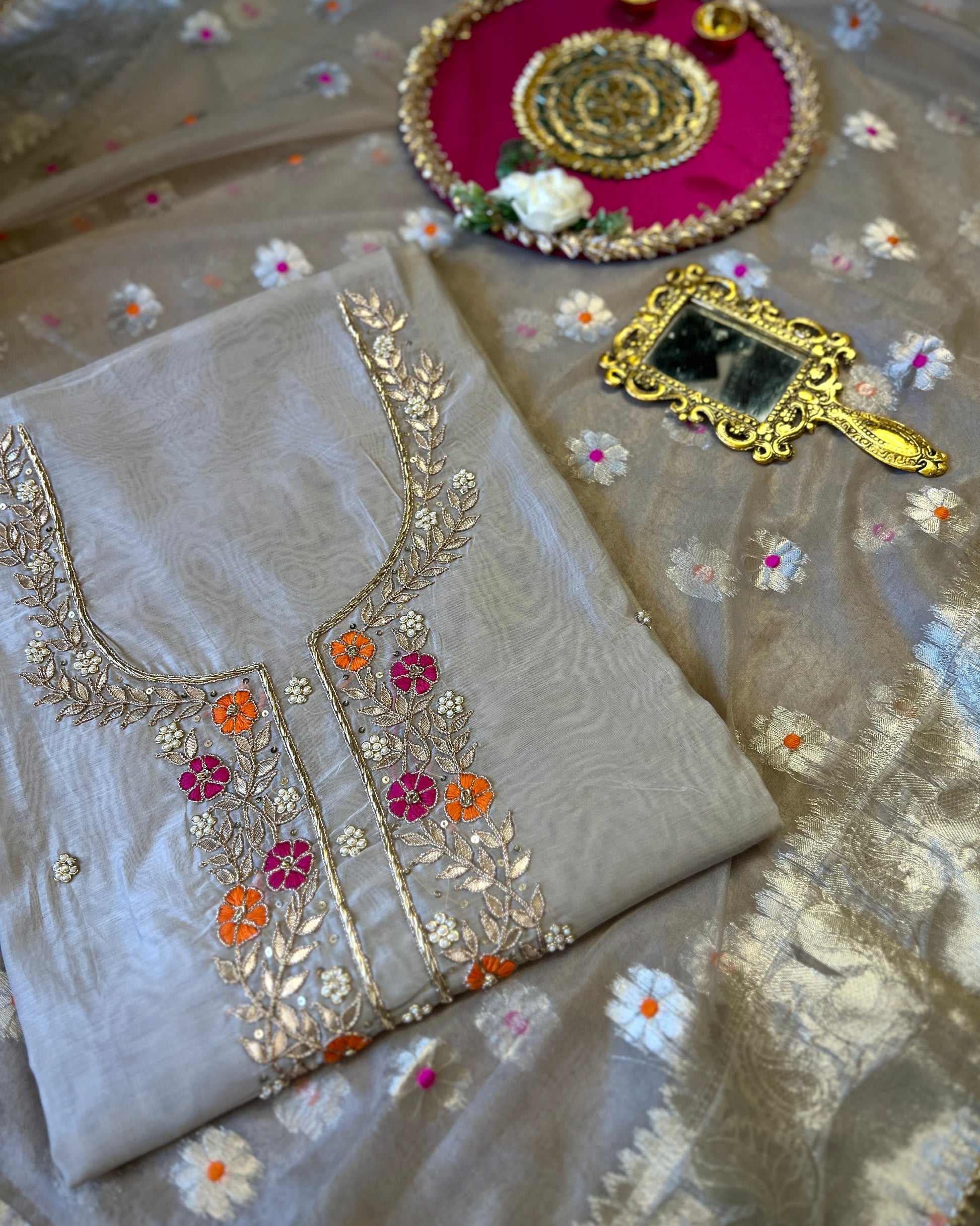 Radiate sheer grace in this rich Chanderi silk suit, featuring delicate floral embroidery on the neckline in vibrant hues of pink and orange. The look is beautifully elevated with a luxurious tissue dupatta adorned with woven motifs and a golden border, paired with a pure Shantoon bottom for a refined and comfortable finish. Perfect for festive occasions, intimate weddings, and elegant gatherings.