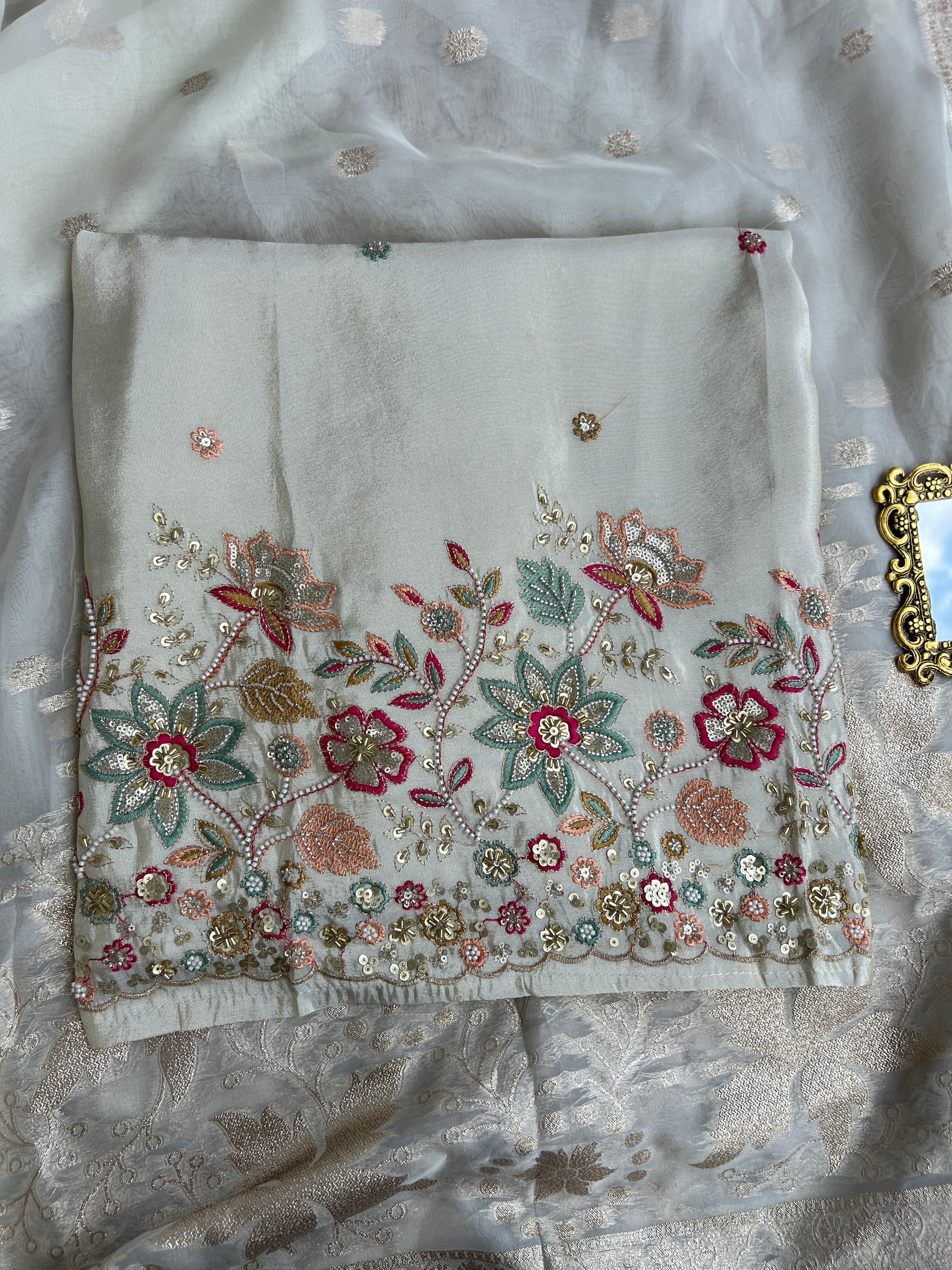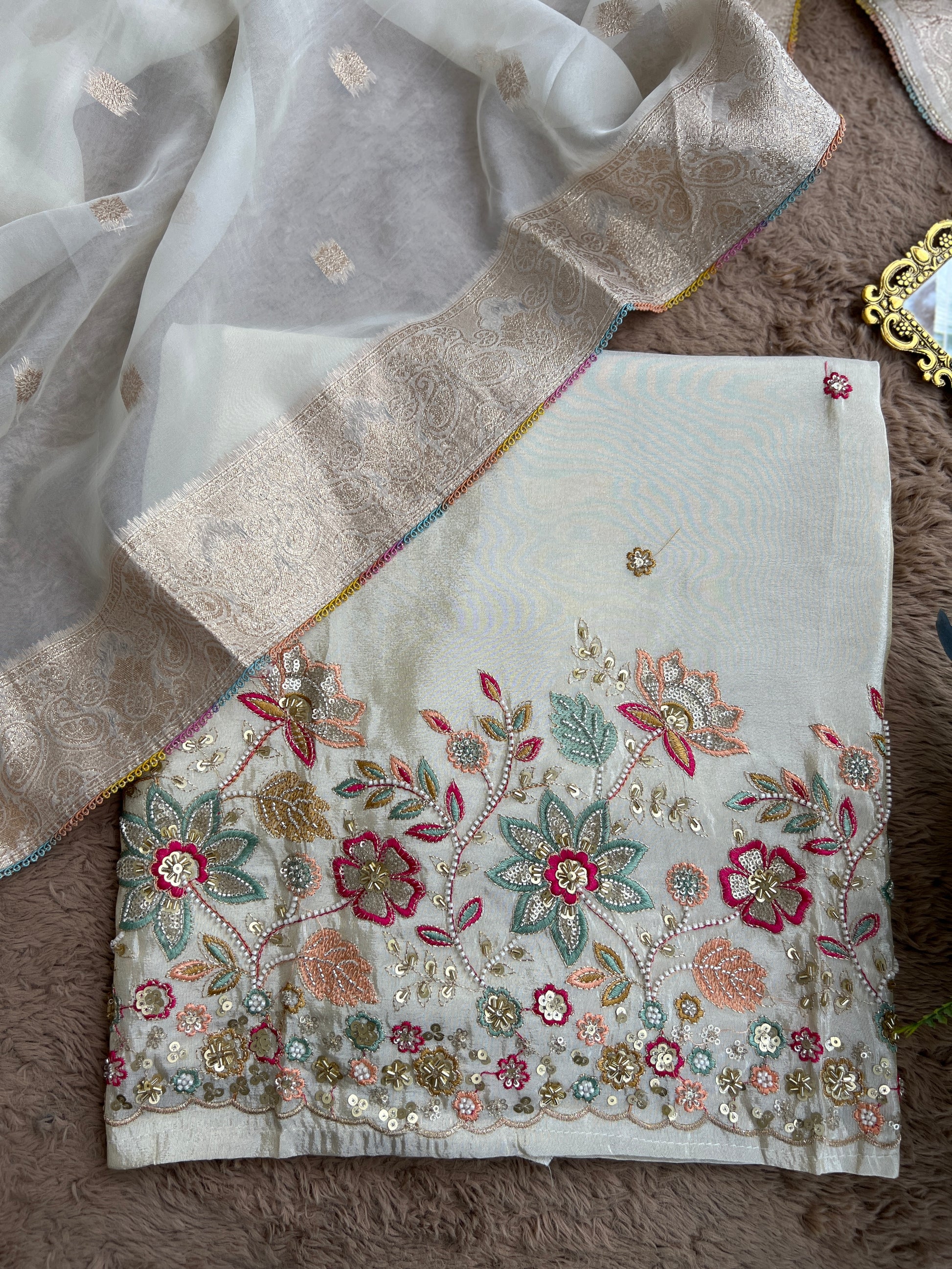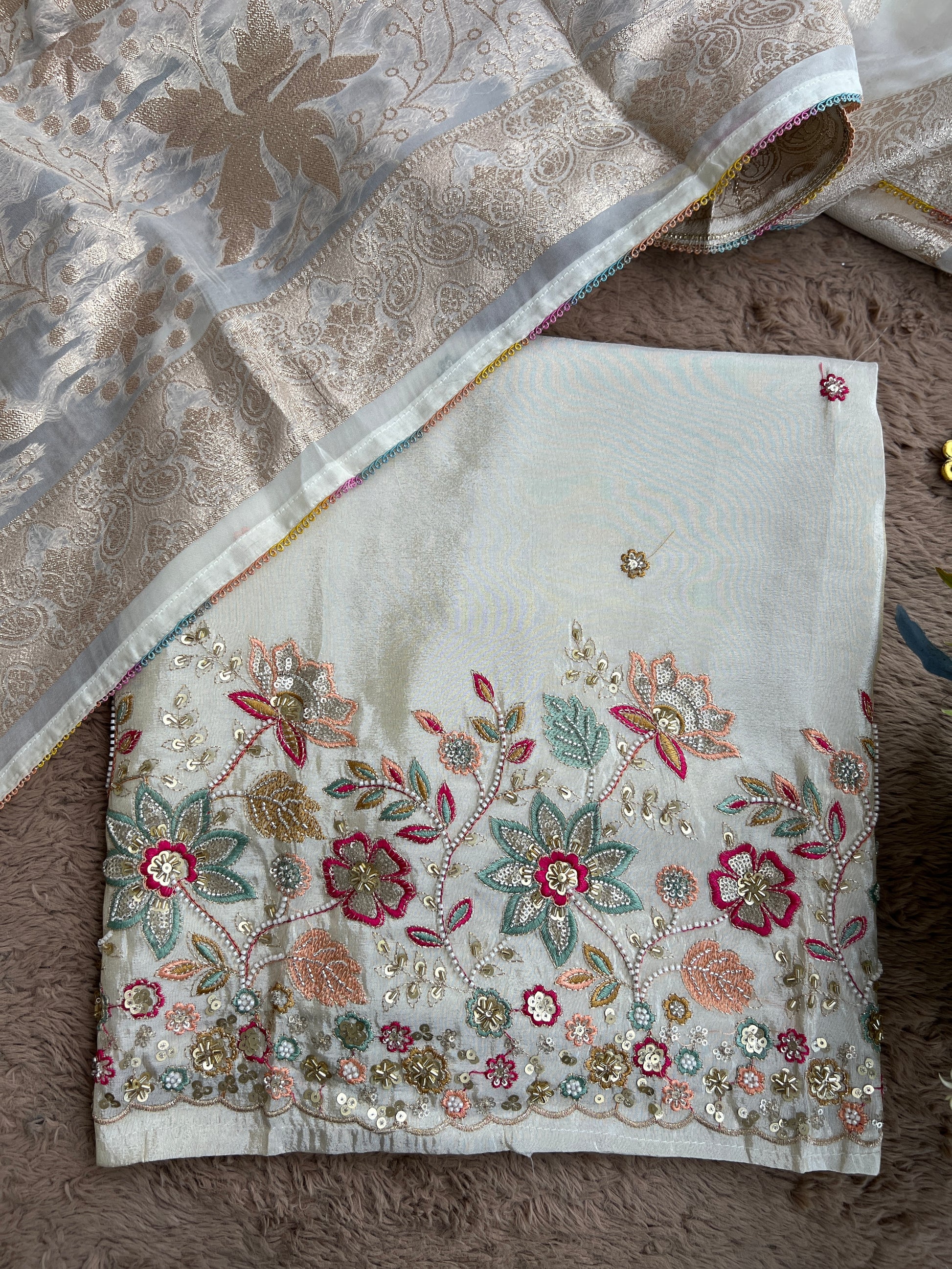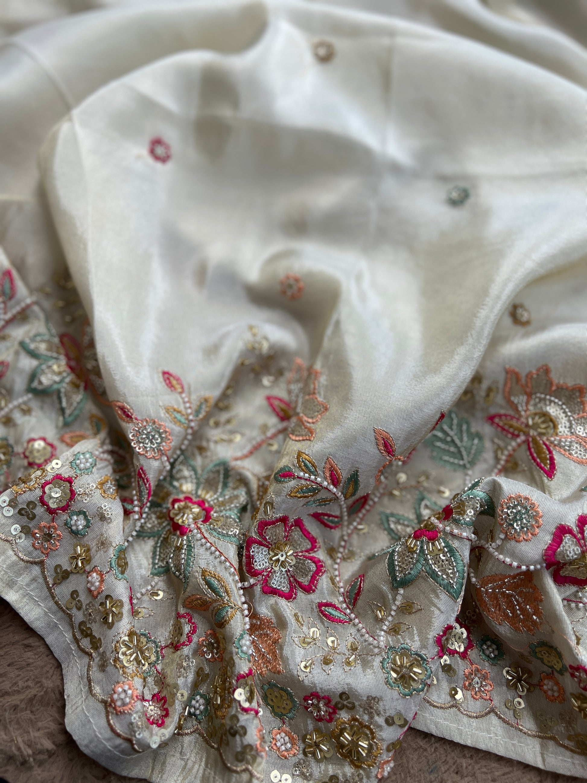 Ivory Shimmer Silk with Multi-Embroidered Elegance
