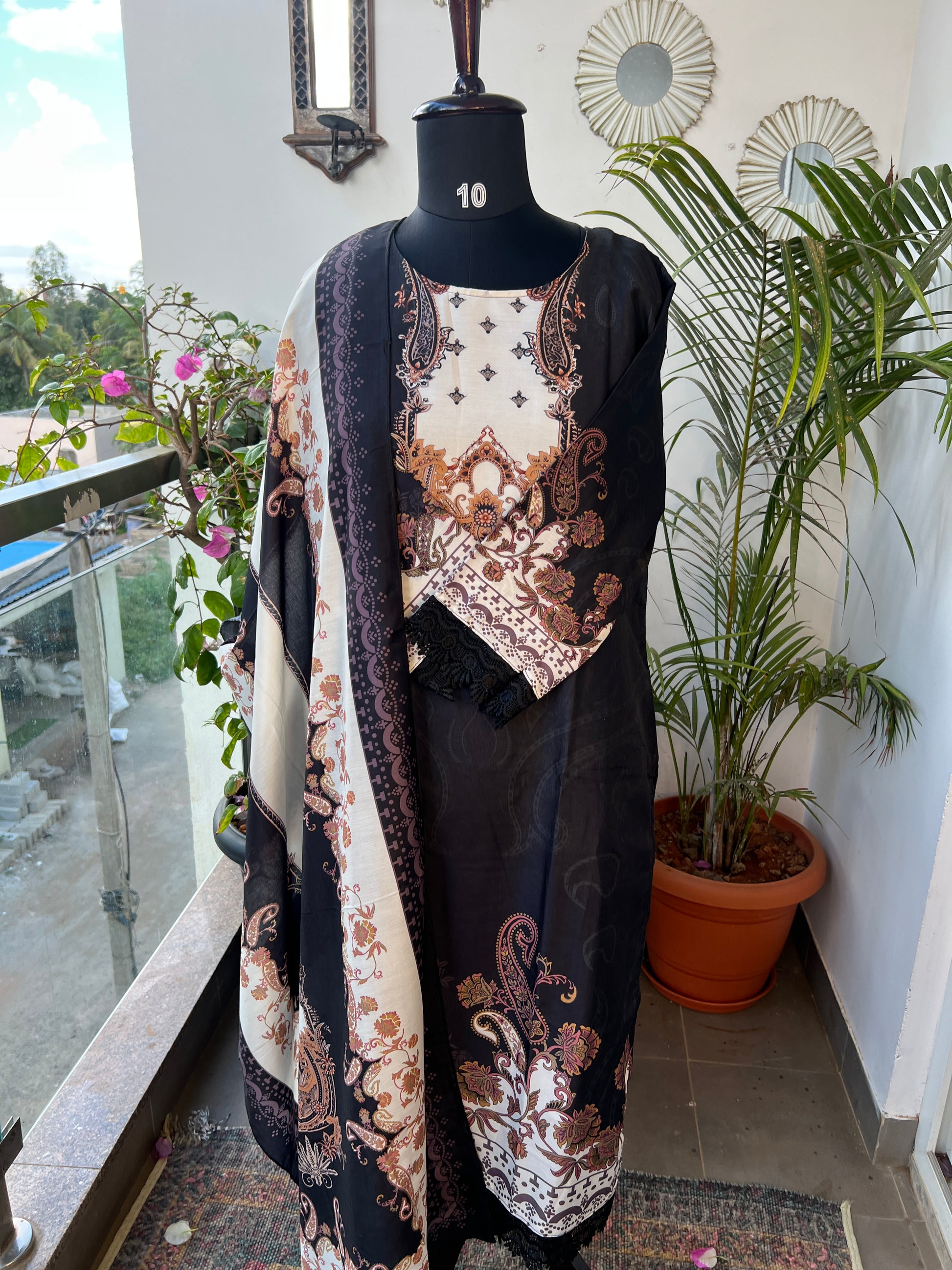 Black Karachi Print Maslin Suit with Dupatta – Timeless Ethnic Charm