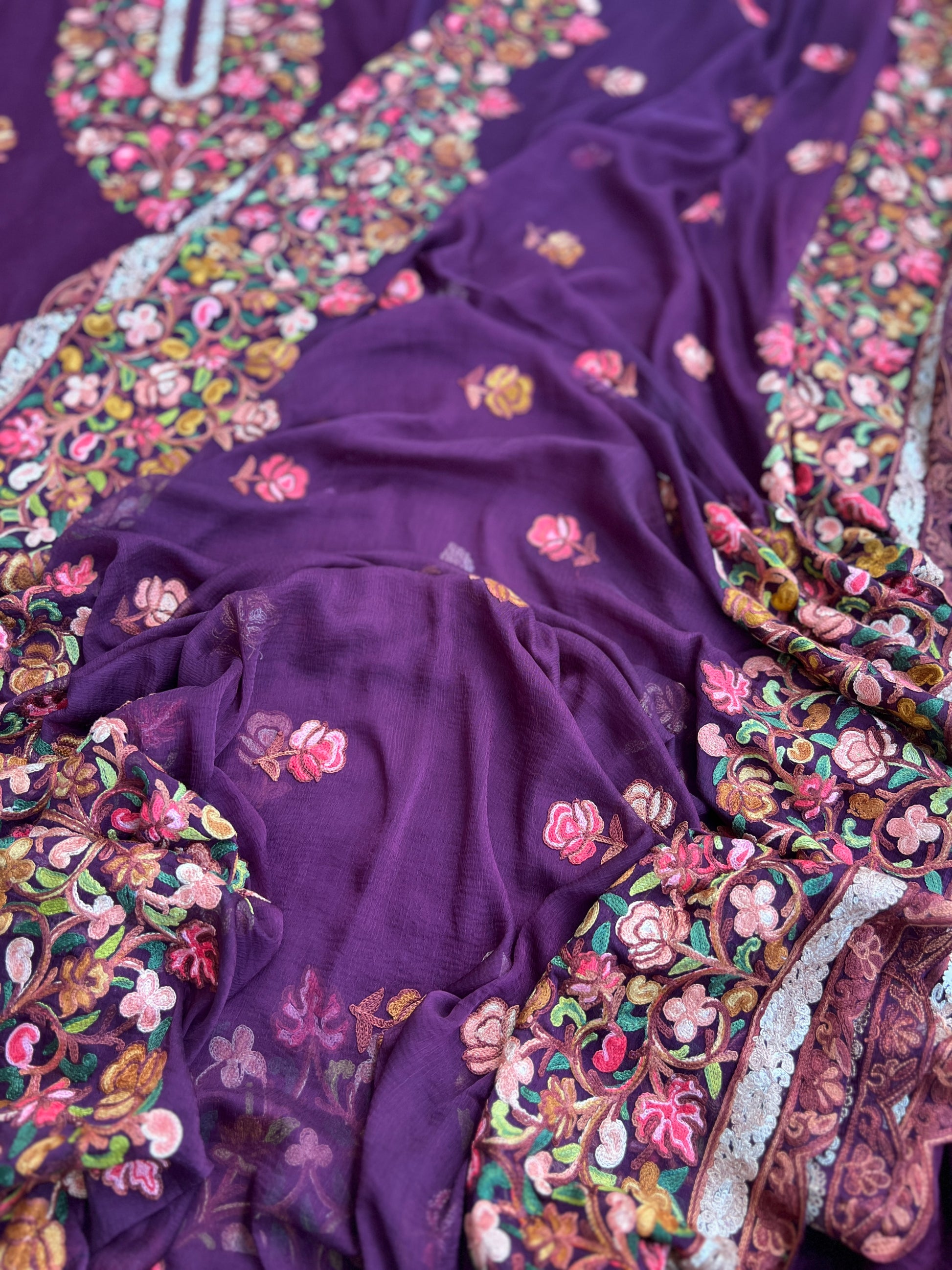 Kashmiri Embroidered Wine Suit with Graceful Chiffon Dupatta