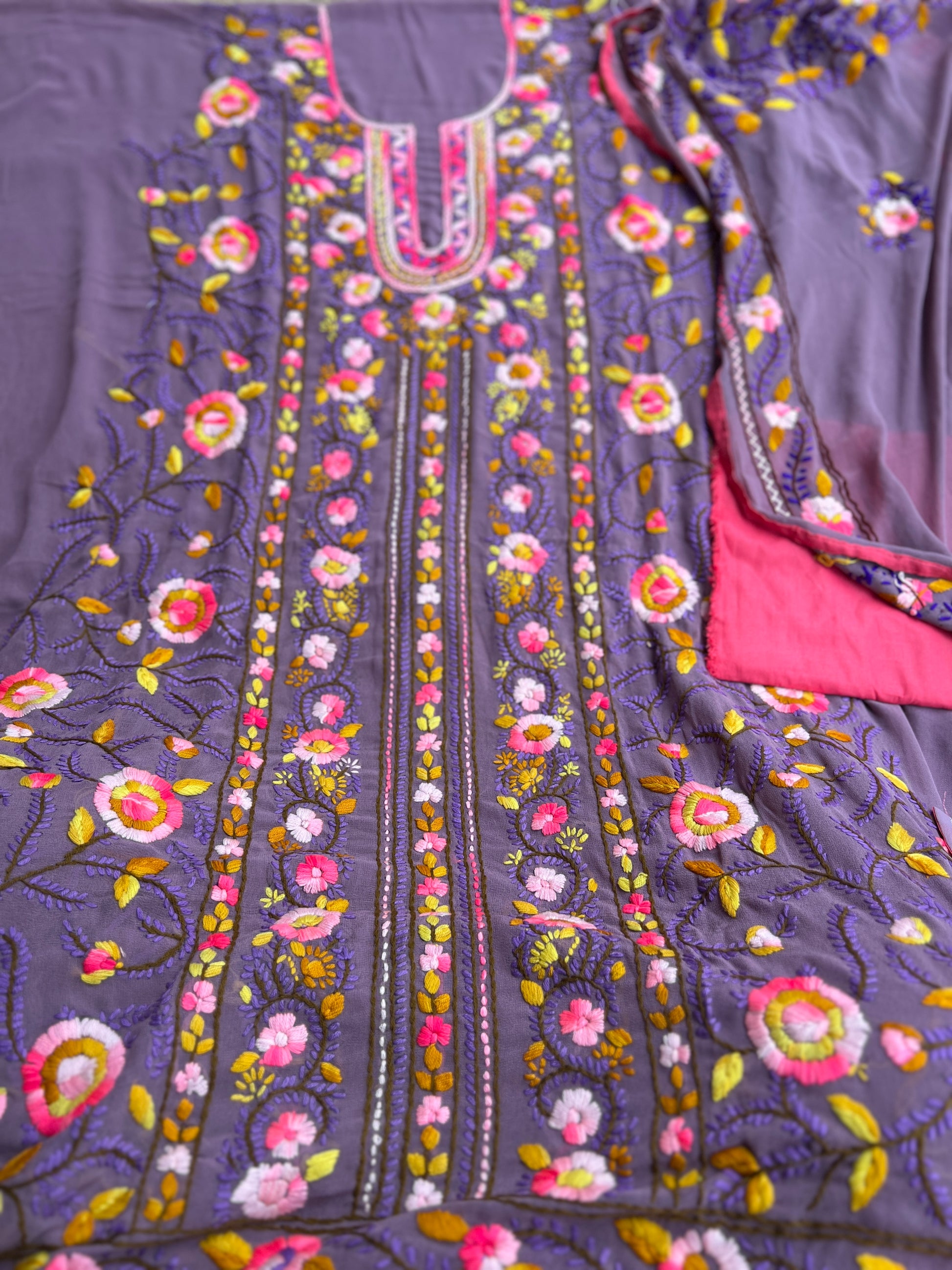 This exquisite Phulkari suit is crafted on soft georgette fabric, beautifully adorned with multicolor hand embroidery in traditional floral motifs. The ensemble includes a georgette kurta with intricate detailing, a cotton silk bottom for all-day comfort, and a matching georgette dupatta embellished with fine hand embroidery, making it a perfect blend of grace and heritage.