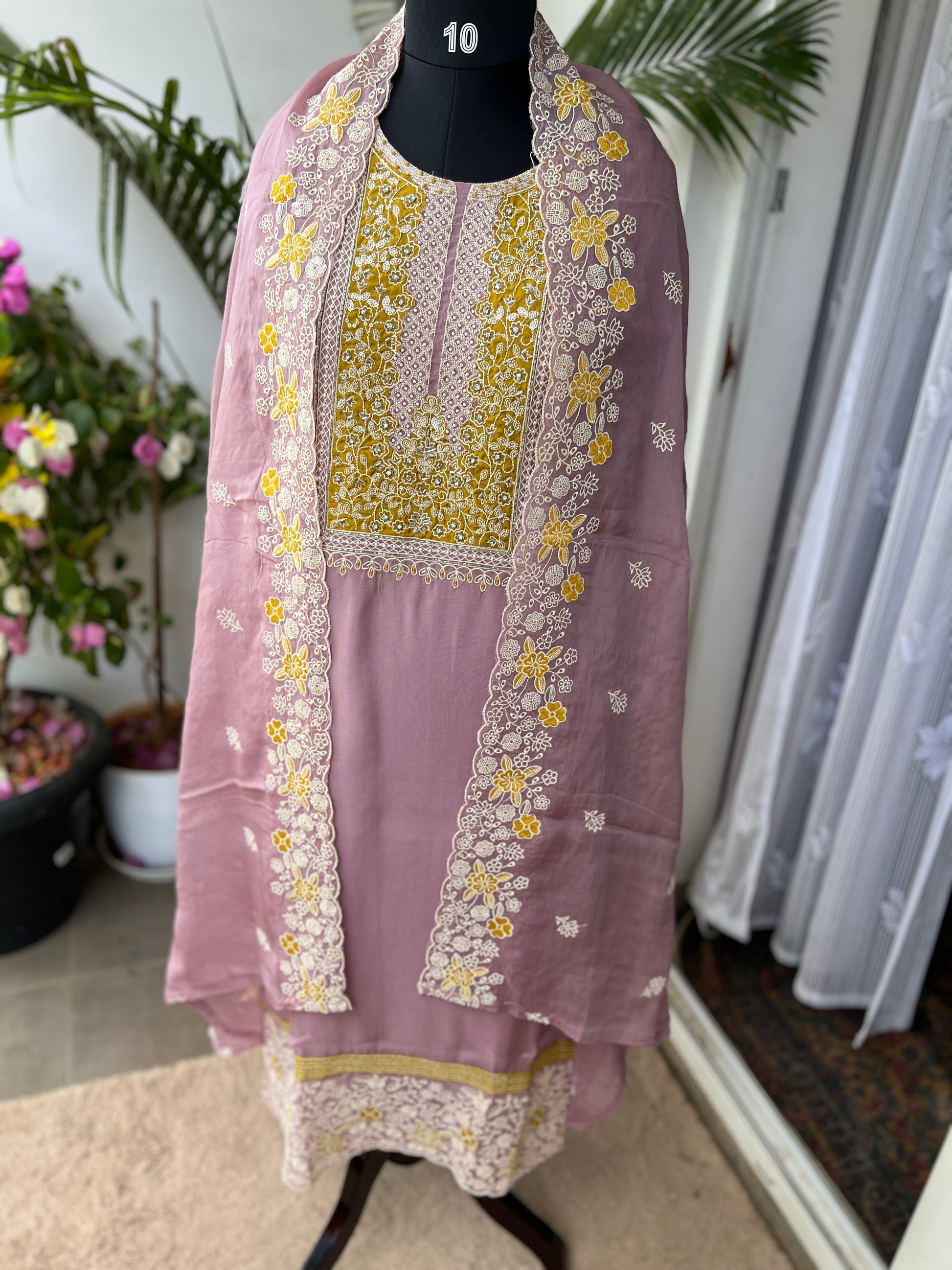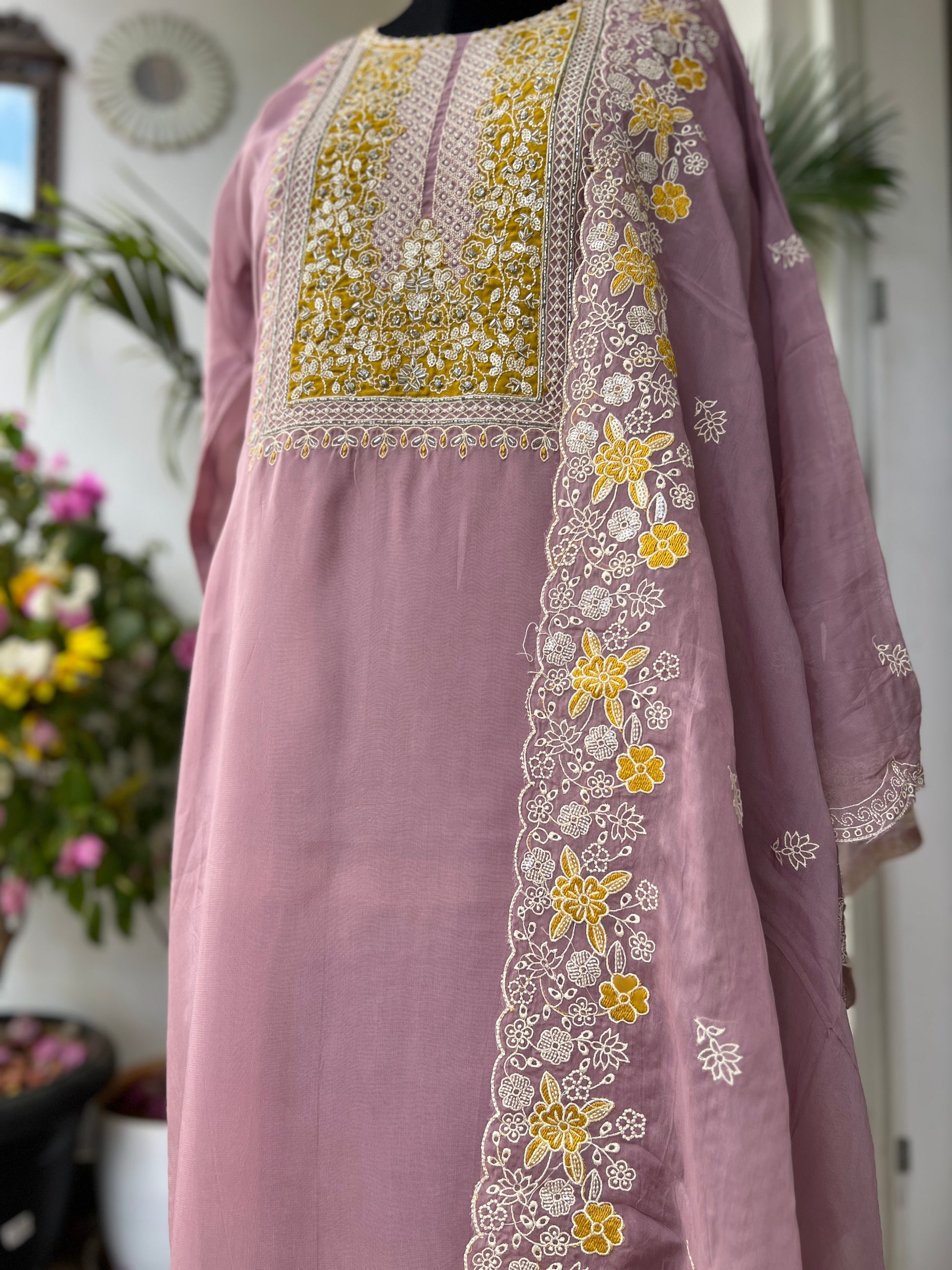 A graceful lavender organza suit adorned with exquisite embroidery on the neckline, daman, and dupatta. The intricate floral handwork in shades of yellow and white adds charm to its pastel base. Paired with comfortable cotton silk pants and a shimmer organza dupatta, this set is perfect for elevating your festive and occasion wear wardrobe.
