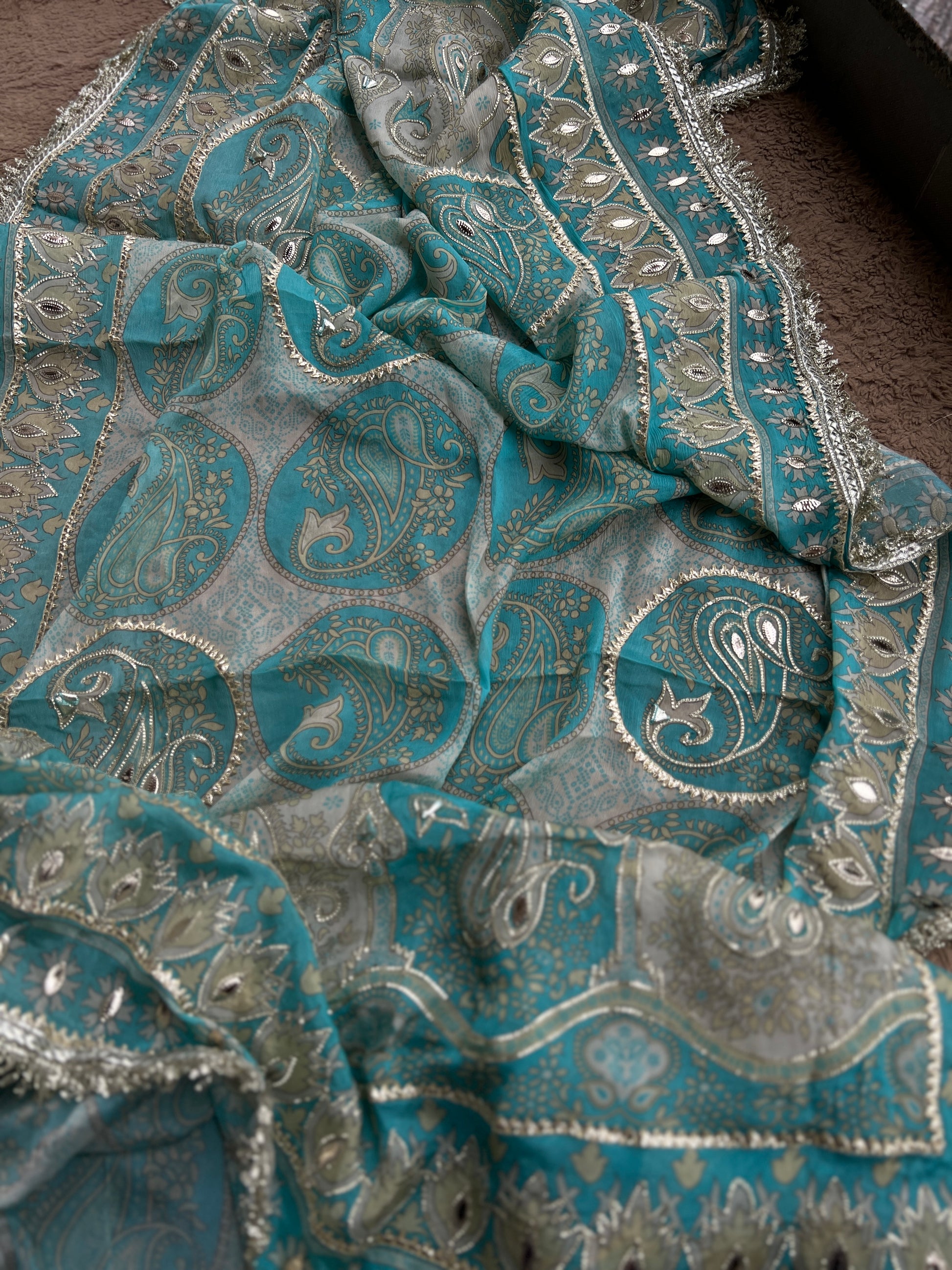 The top features a rich shimmer silk base highlighted with handcrafted Gota Patti work, giving it a premium and graceful appeal. Paired with a matching silk bottom for a seamless silhouette, the set is completed with a beautifully printed Chinnon dupatta adorned with delicate gota detailing, adding the perfect hint of tradition and charm.