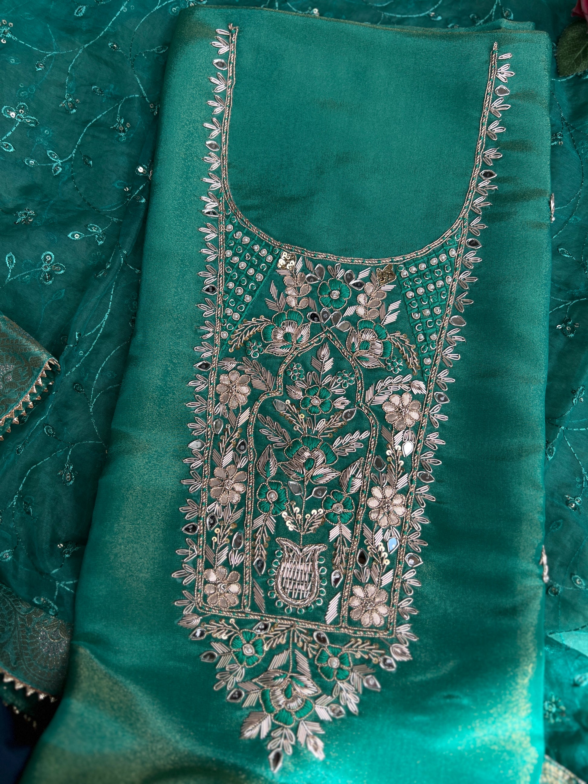This opulent ensemble features a pure shimmer silk top that exudes a radiant sheen, elevated by intricate Zardozi work concentrated around the neckline. The elaborate hand-embroidery showcases a rich blend of gold and silver threads, complemented by tiny sequins and beads, creating a stunning display of traditional craftsmanship with floral and paisley motifs. Paired with a robust Shantoon bottom in a matching deep green shade, the outfit ensures a comfortable and sturdy base that balances the top’s luxurious texture. The tissue organza embroidered dupatta adds a lightweight, ethereal touch, adorned with delicate silver thread work and a shimmering border, enhancing the overall grandeur. Perfect for weddings, festive celebrations, or high-profile events, this unstitched suit combines timeless elegance with a modern flair, offering versatility for custom tailoring.