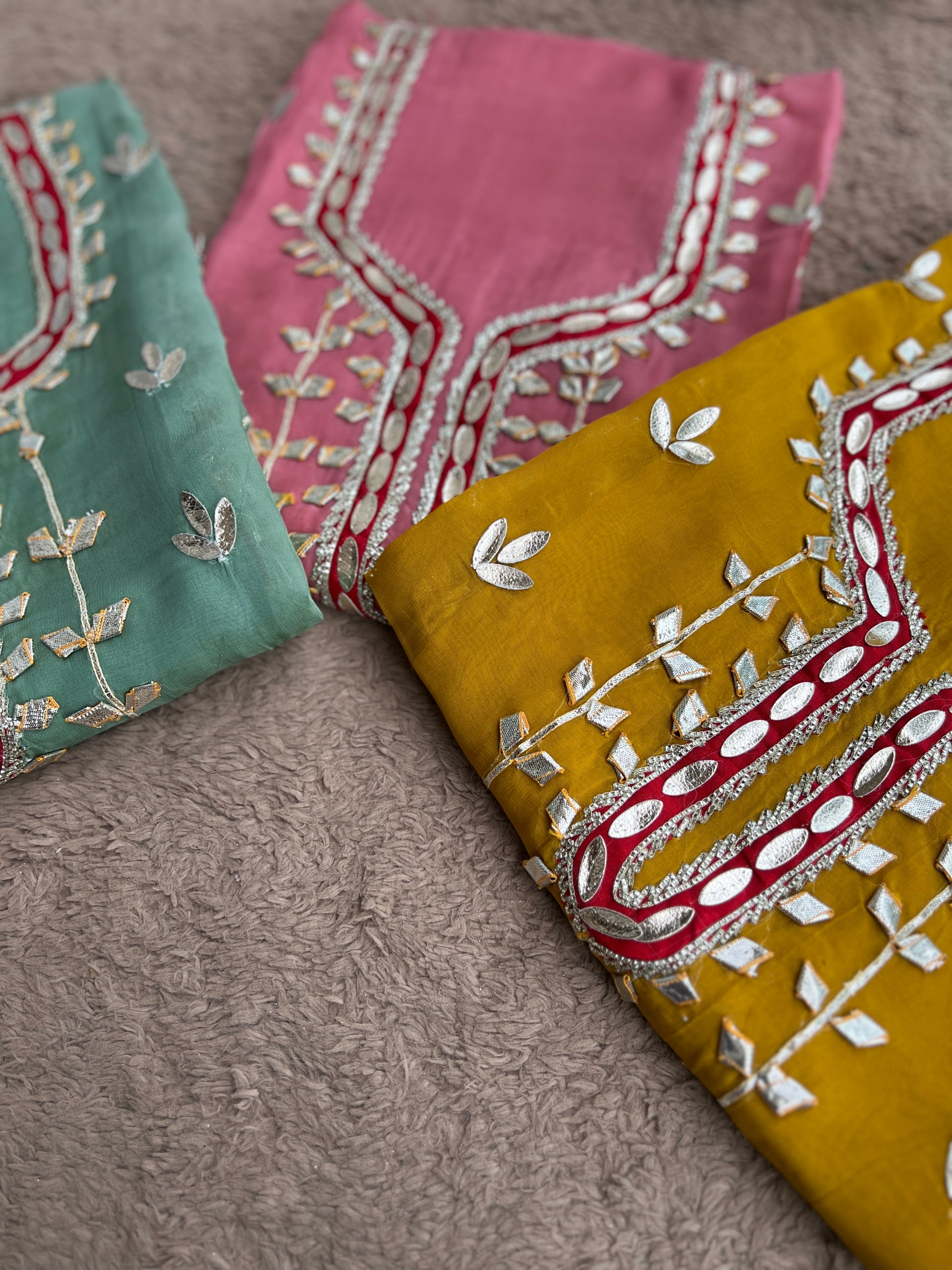 The top features intricate full Gota Patti work, adding a rich, celebratory glow to the outfit. Paired with a silk bottom for a smooth and luxurious fit, the ensemble is completed with a premium tissue dupatta enhanced with delicate gota detailing—light, shimmery, and absolutely stunning.