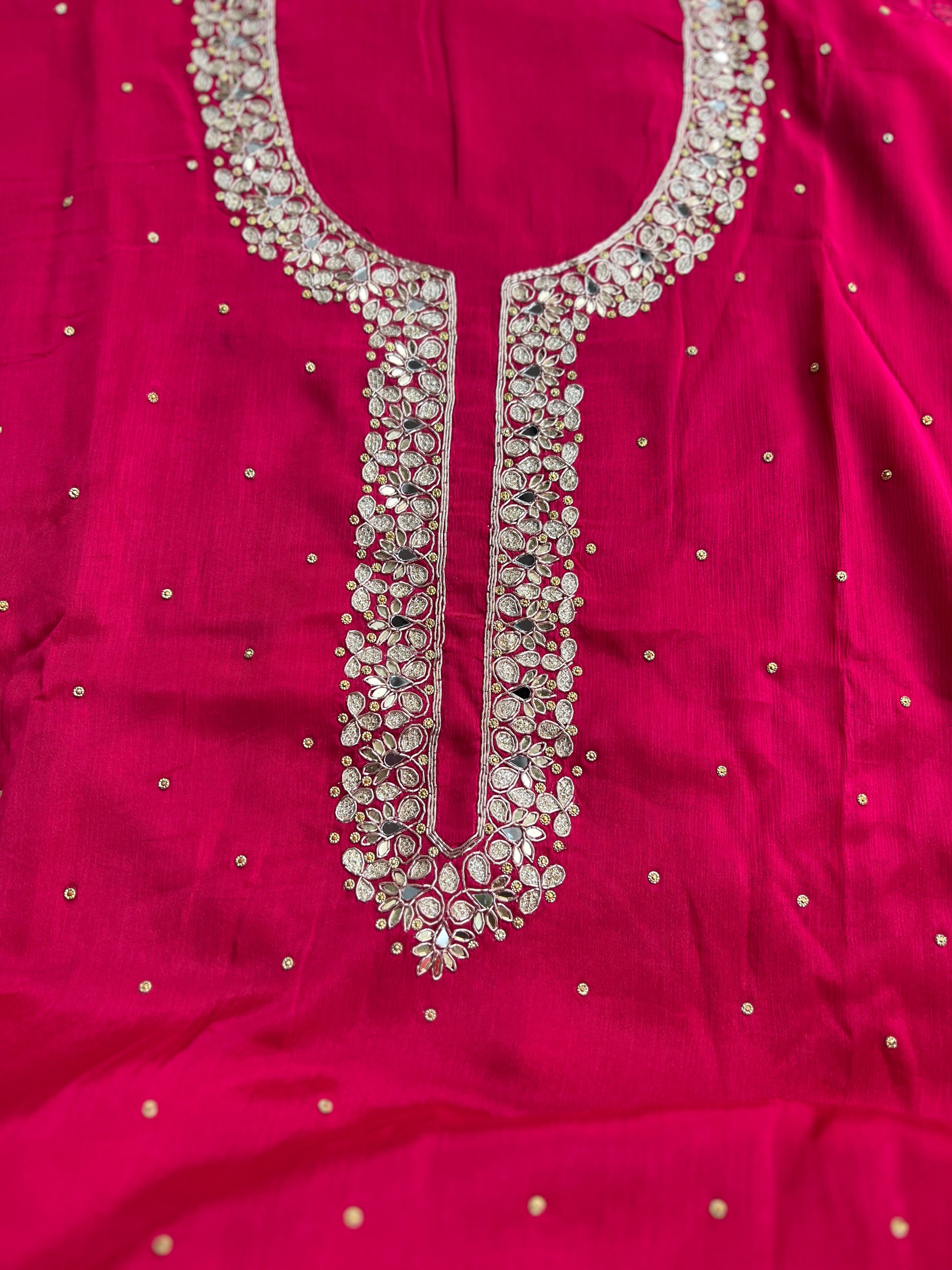 An elegant Rani Pink festive suit set crafted from premium pure chinnon fabric, designed for a graceful and luxurious look. The neckline features intricate Kalkatta handwork, adding rich traditional detailing to the outfit.