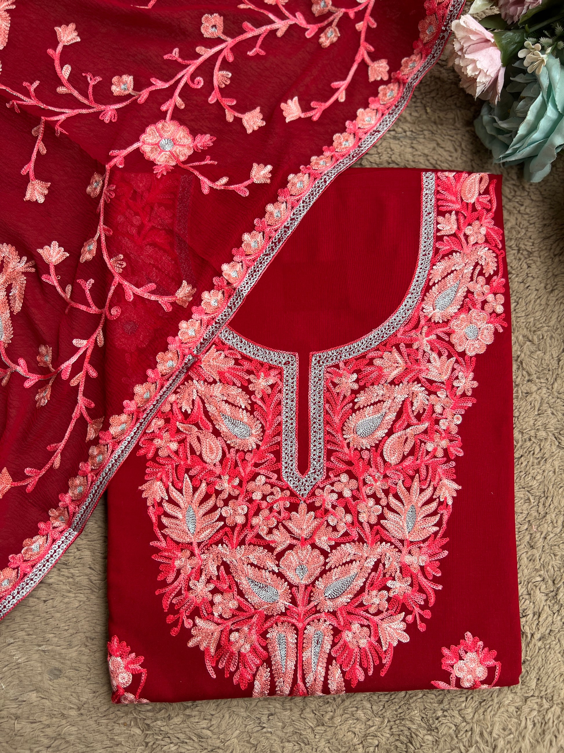 Elevate your festive wardrobe with this Ruby-tone Modal Cotton Suit, adorned with fine Kashmiri embroidery enhanced with silver zari detailing.