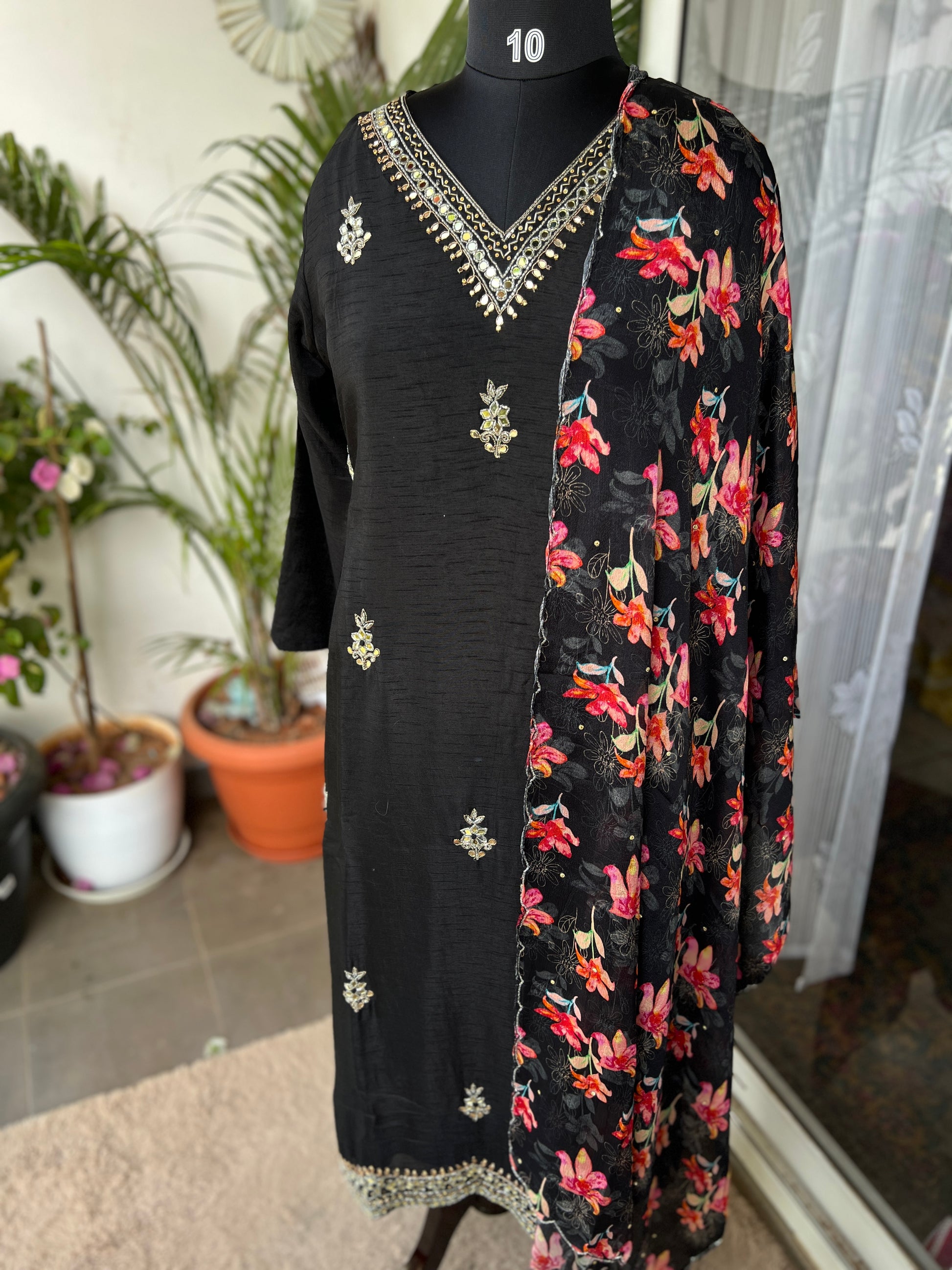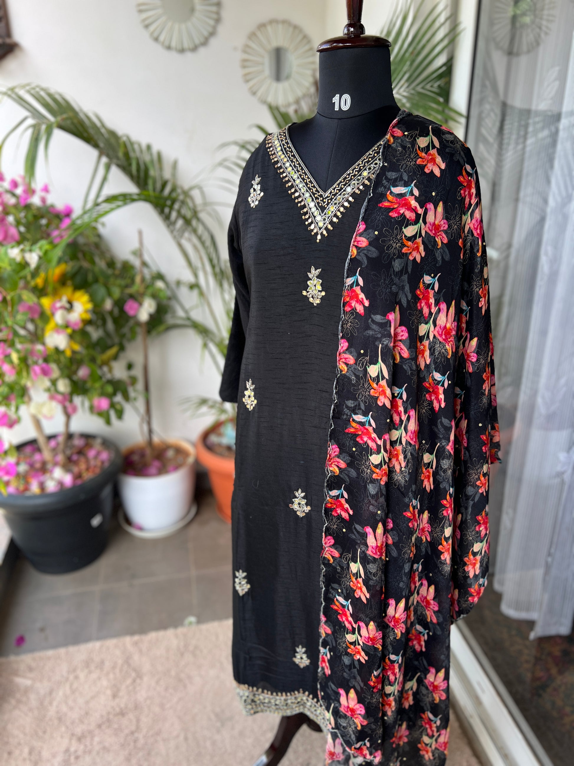 Midnight Elegance – Black Tussar Silk Suit with Kalkatta Handwork & Floral Chiffon Dupatta