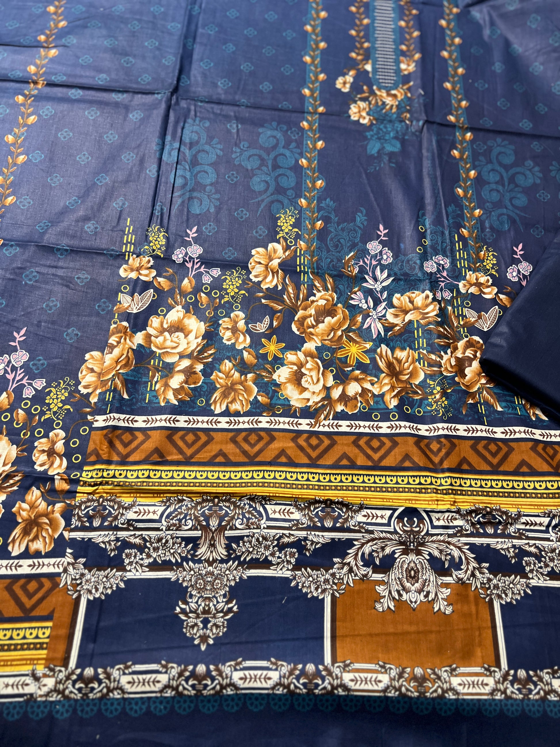 Elevate your everyday elegance with this midnight navy cotton suit featuring rich golden floral prints and statement neckline detailing. The beautifully coordinated printed dupatta with intricate borders adds a festive touch, while the soft cotton fabric ensures all-day comfort. Perfect for office wear, casual gatherings, and small celebrations — a timeless addition to your ethnic wardrobe. ✨