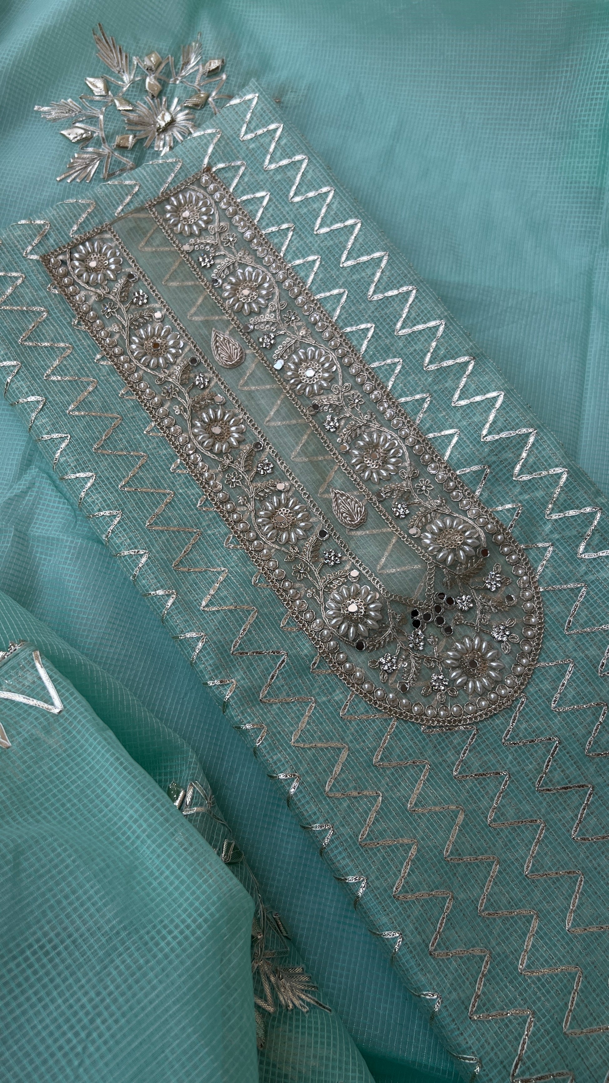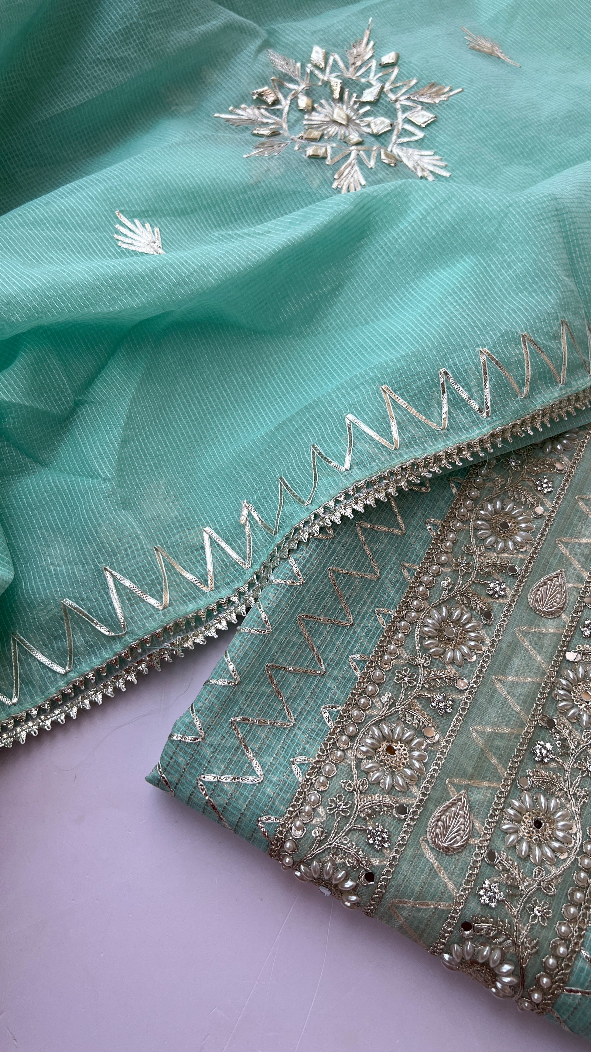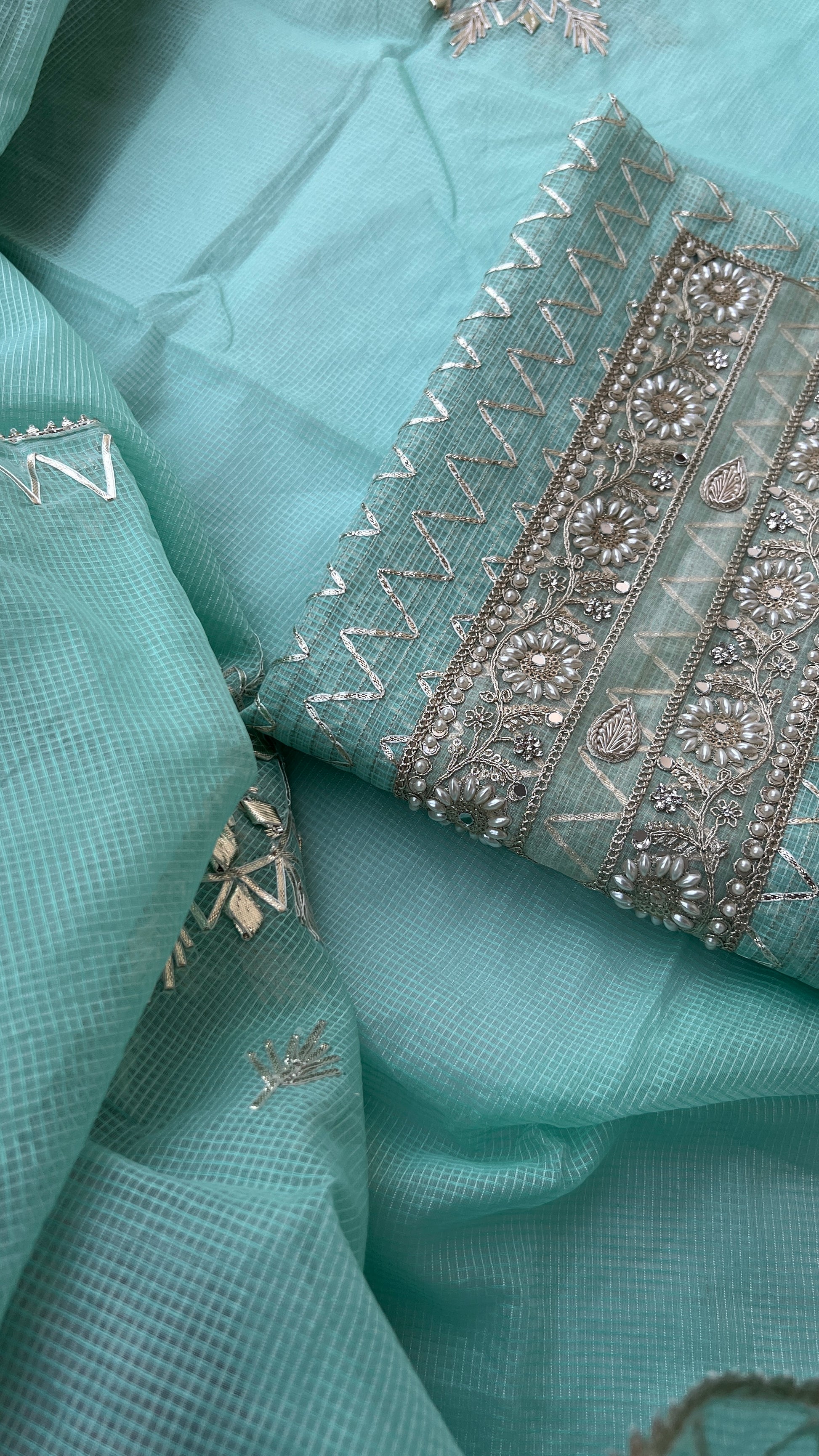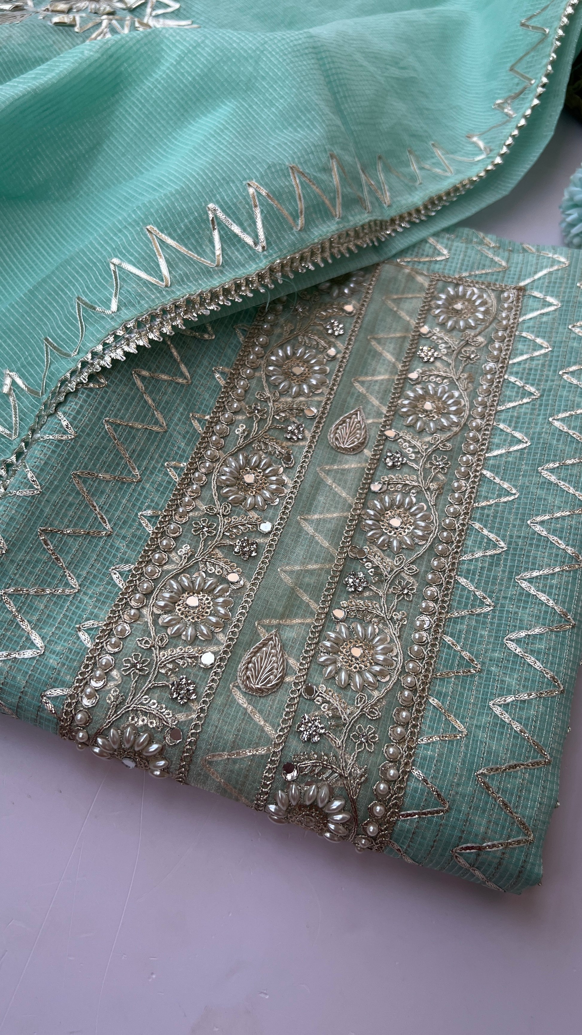 This Light aqua Kota Gotawork Suit** is a timeless addition to your ethnic wear collection, offering a perfect blend of traditional craftsmanship and contemporary style.