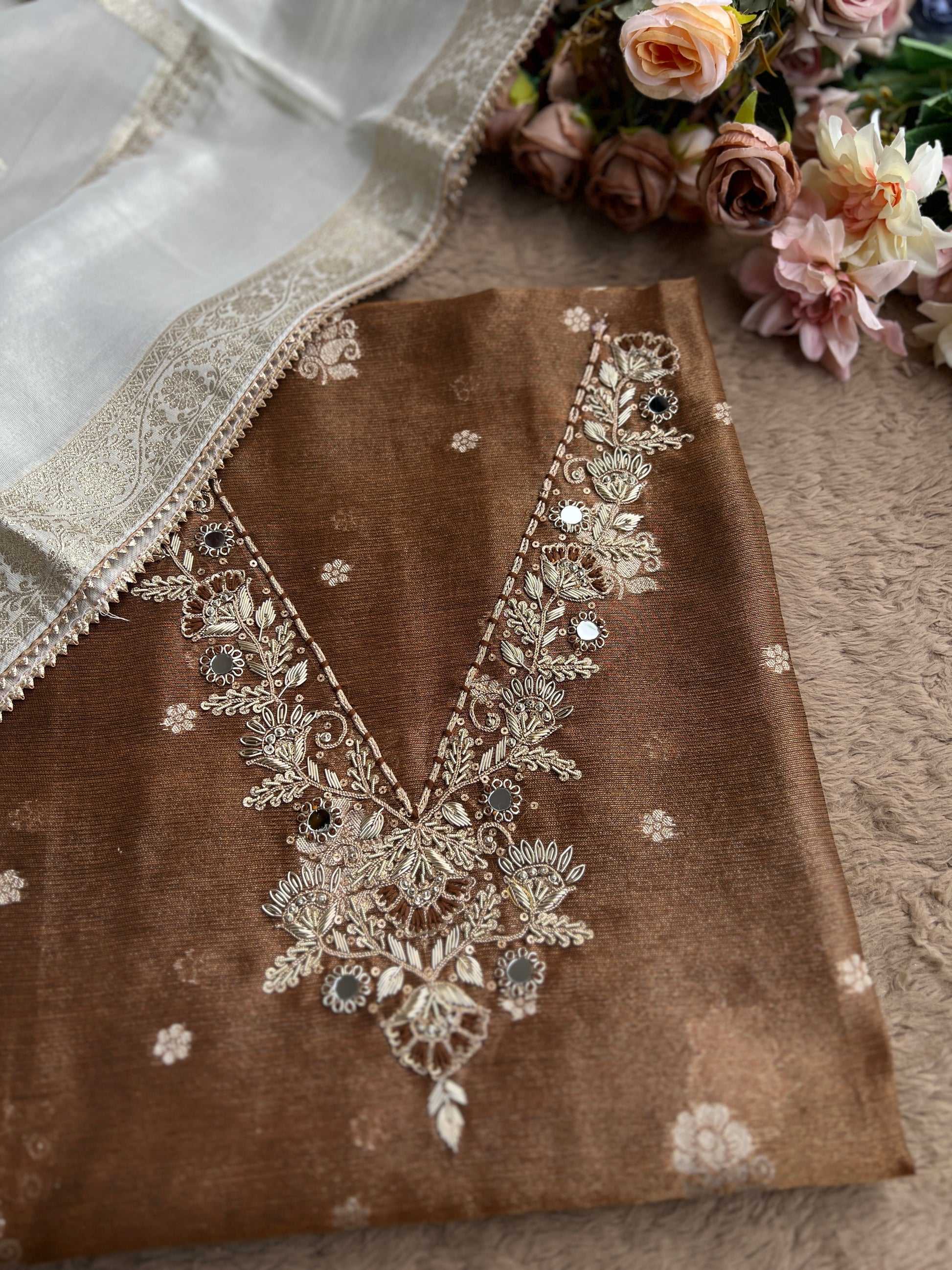 Mocha Mist Soft Kota Silk Suit with V-Neck Handwork & Woven Silk Dupatta