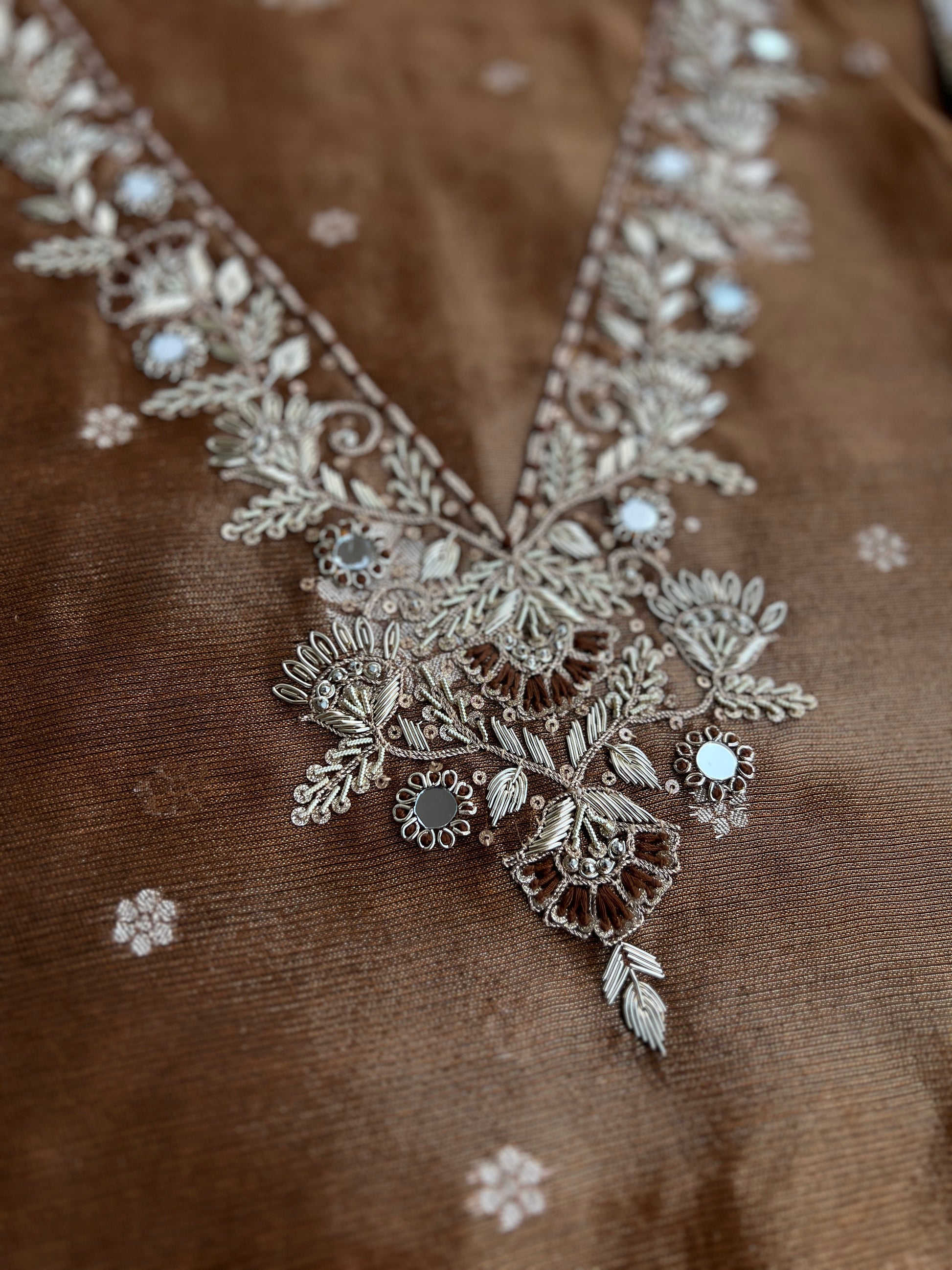 Indulge in understated luxury with this Soft Kota Silk suit in a refined Mocha Mist shade. The top features a beautifully crafted V-neck handwork design, adding subtle elegance without overpowering the look. It comes paired with a smooth silk bottom for comfort and a rich woven silk dupatta that completes the outfit with a graceful drape.