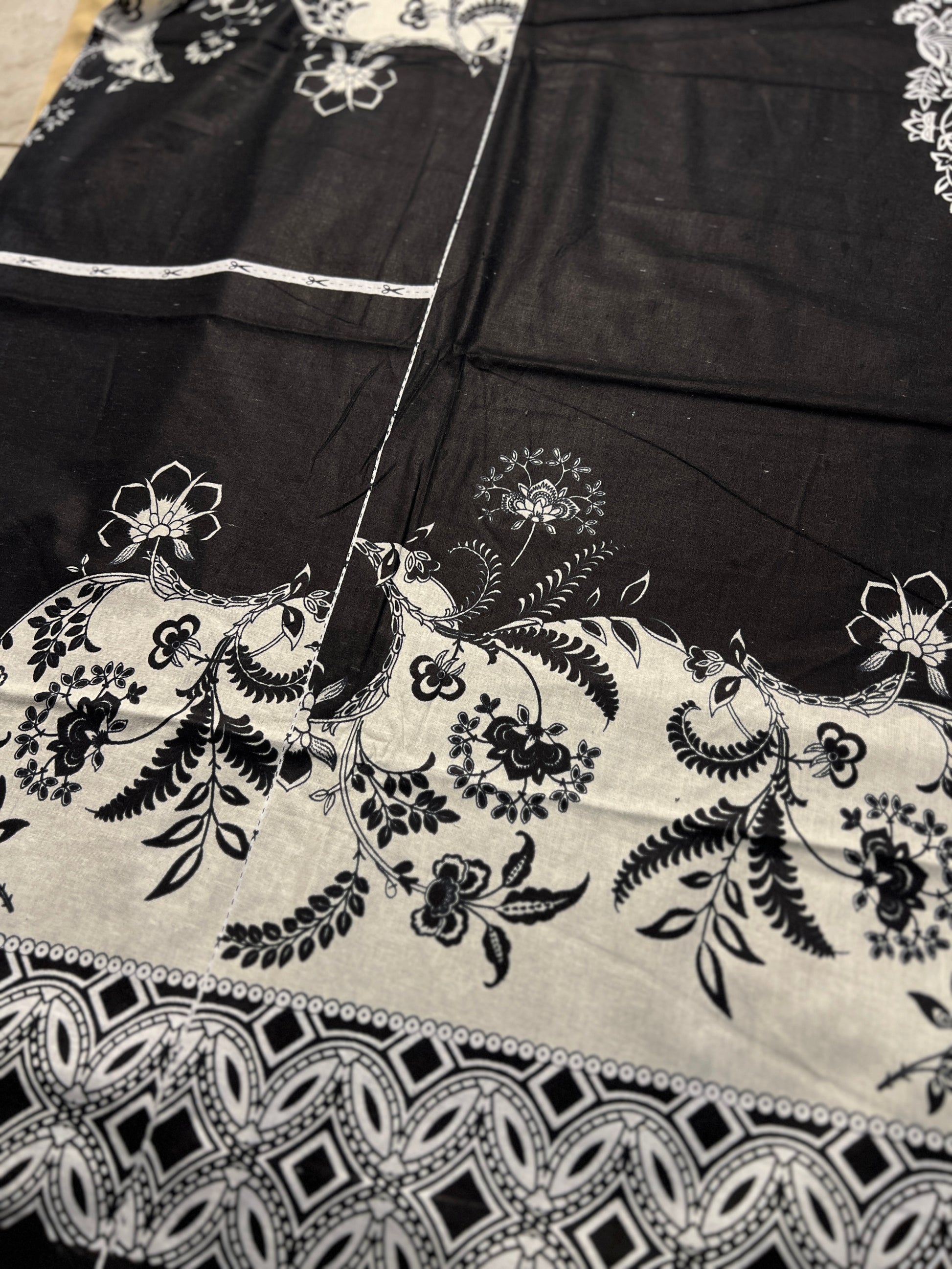 Elevate your everyday style with this Black & White Karachi Print Cotton Suit featuring a beautifully printed pant fabric — perfect for stitching into palazzo, cigarette pants or farshi salwar.