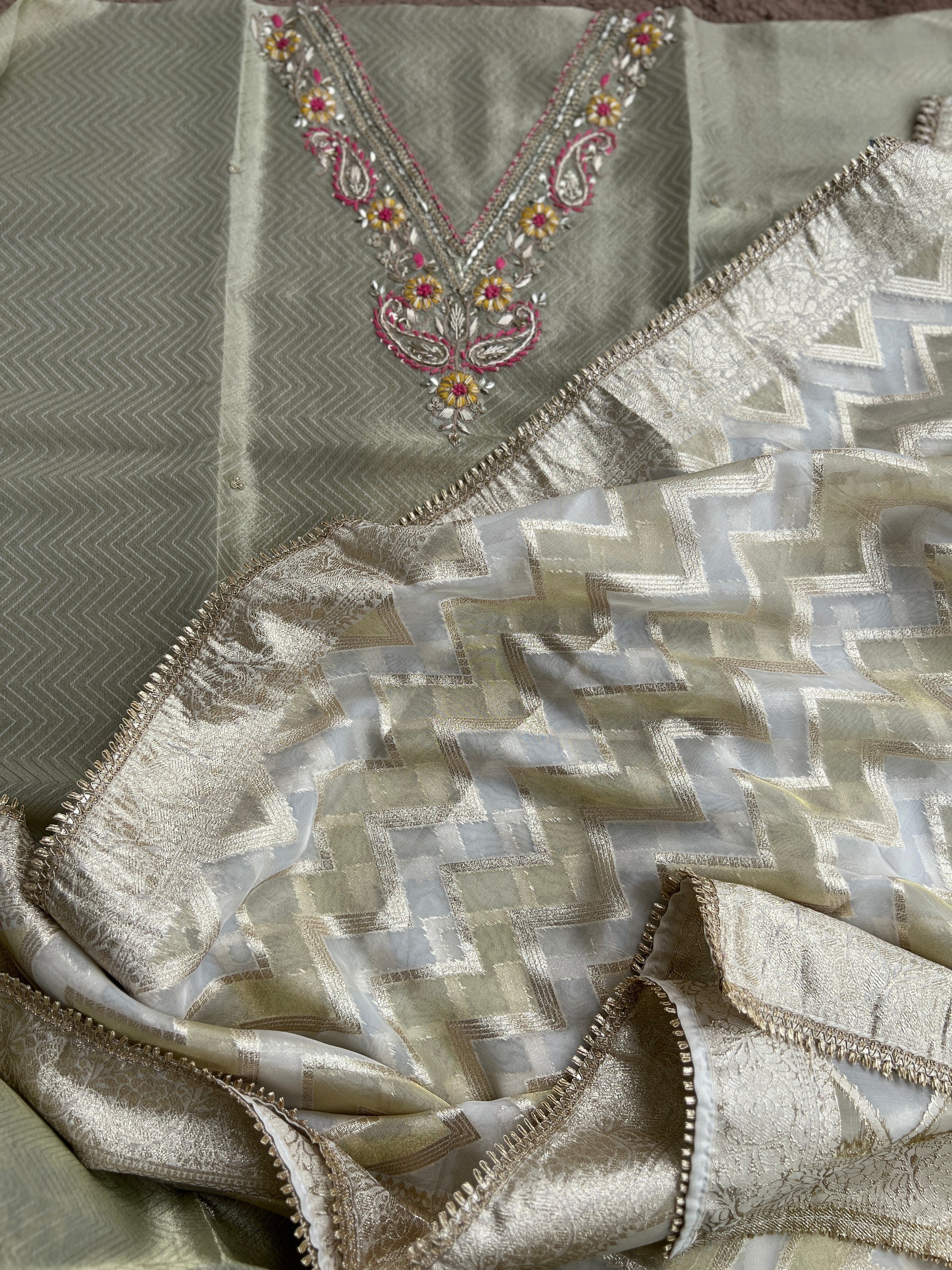 graceful olive tissue top adorned with delicate handwork on the neckline, paired with a rich tissue Banarasi dupatta featuring lace-detailed borders, and a comfortable Shantoon bottom. The perfect blend of subtle elegance and festive charm.