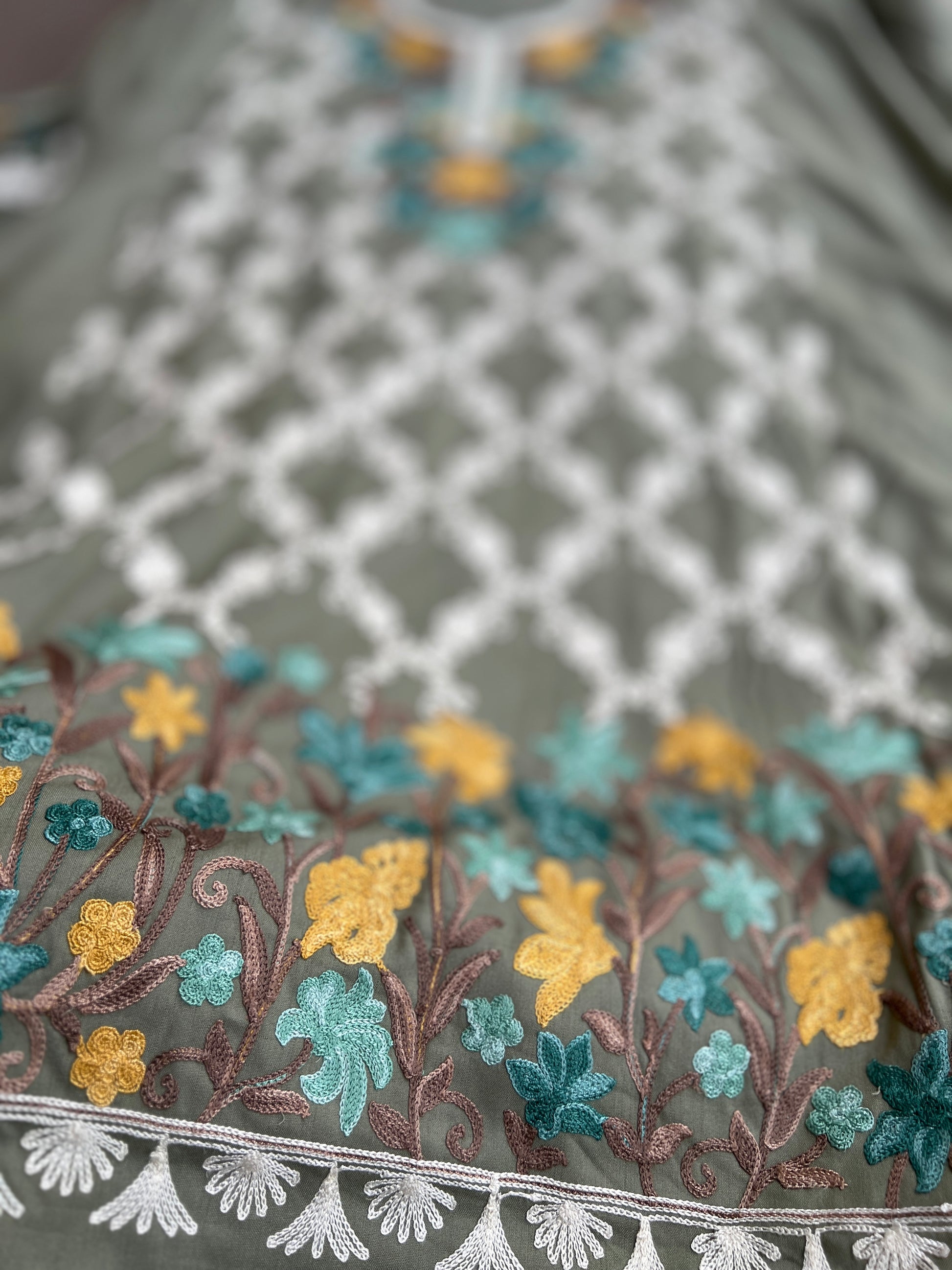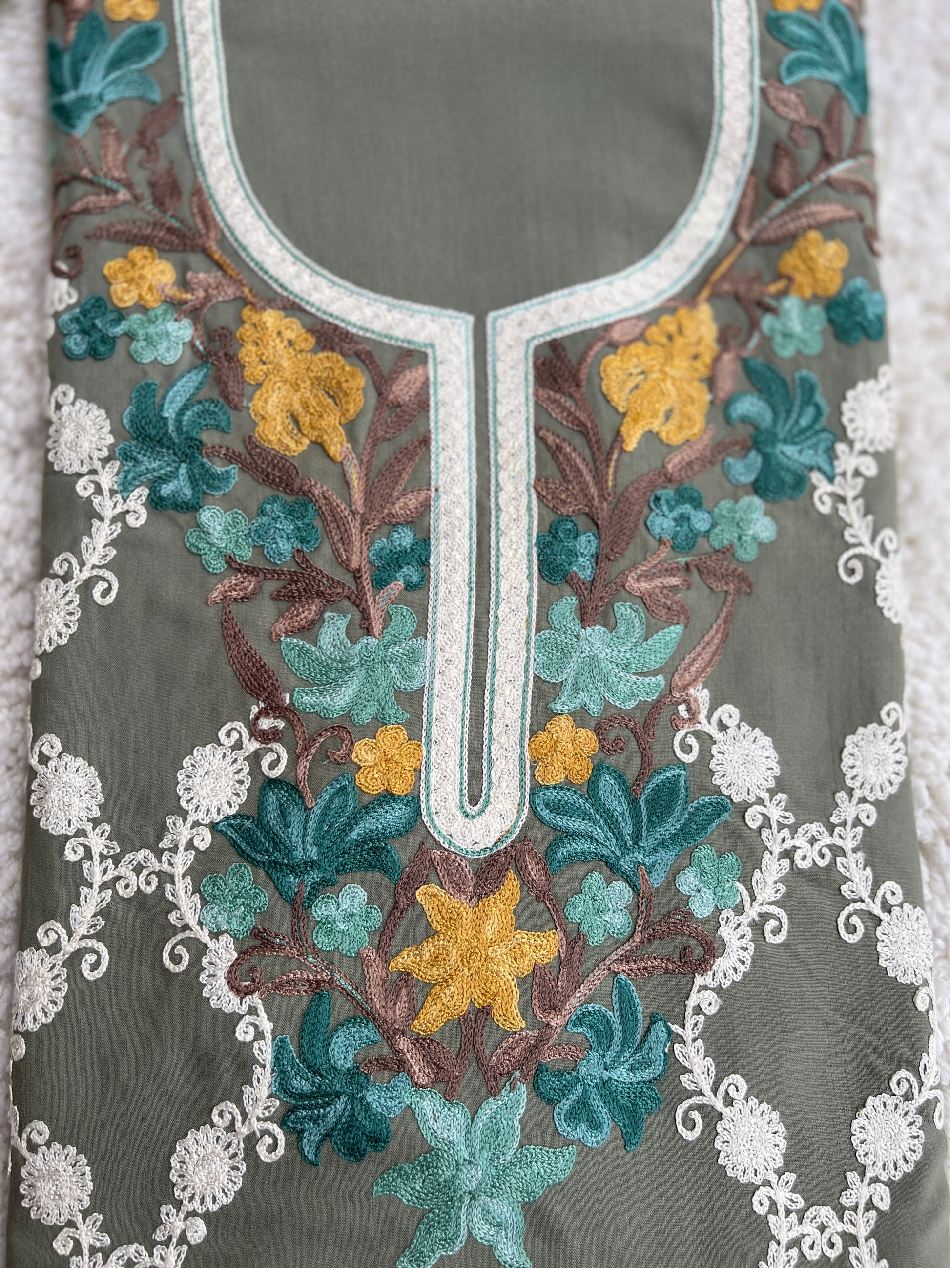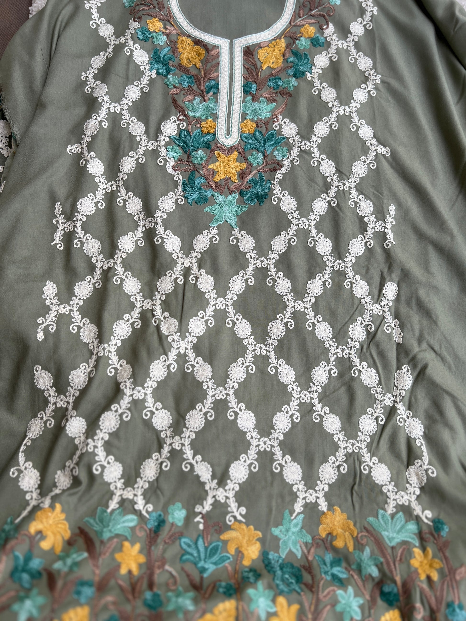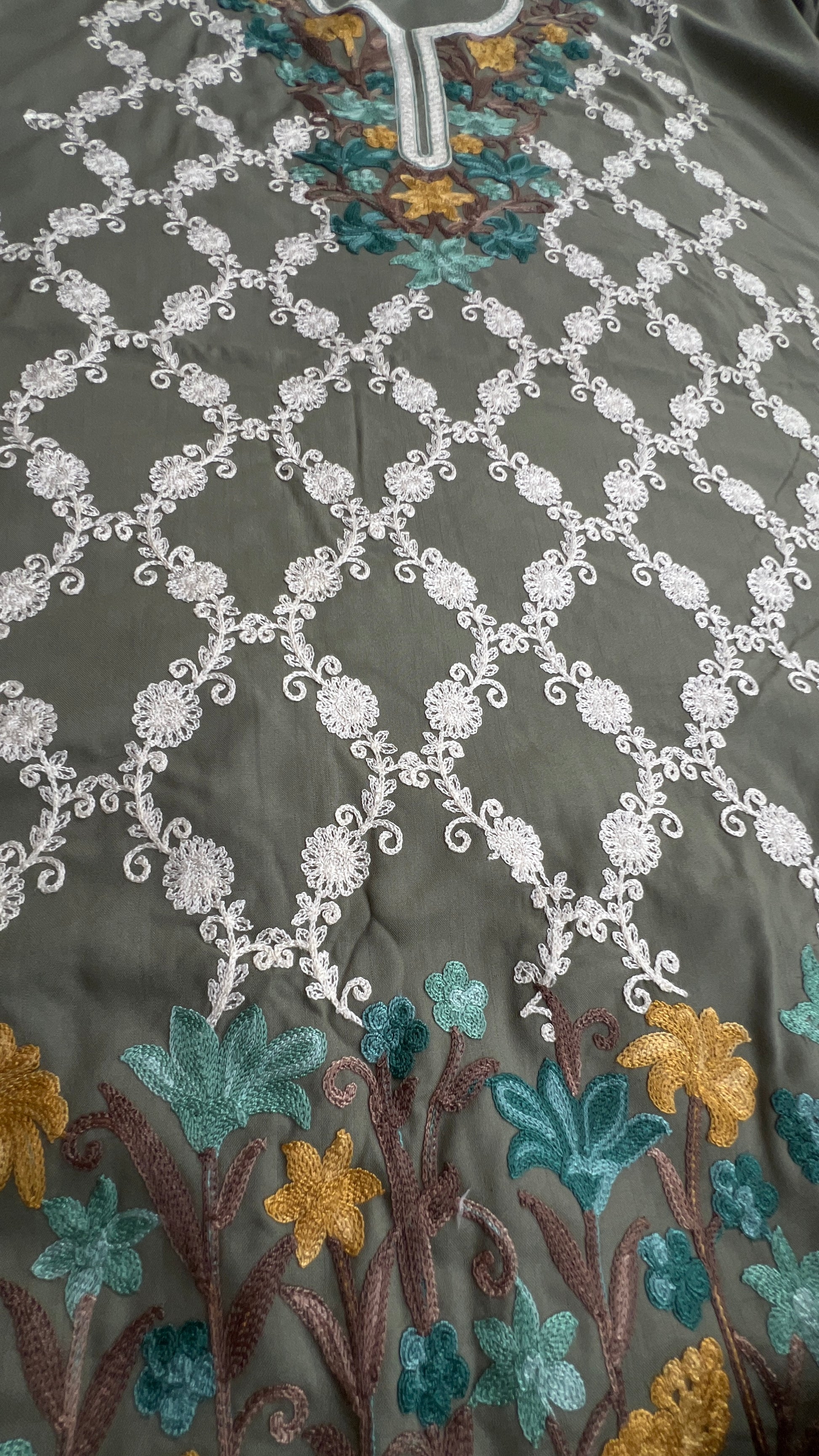 Experience timeless elegance with our olive Shade Kashmiri Aari Embroidered Dress Material, perfect for all seasons. This exquisite dress material features the renowned Kashmiri Aari embroidery, adding a touch of traditional artistry to your wardrobe. The stunning olive color exudes sophistication, making it ideal for any occasion.
