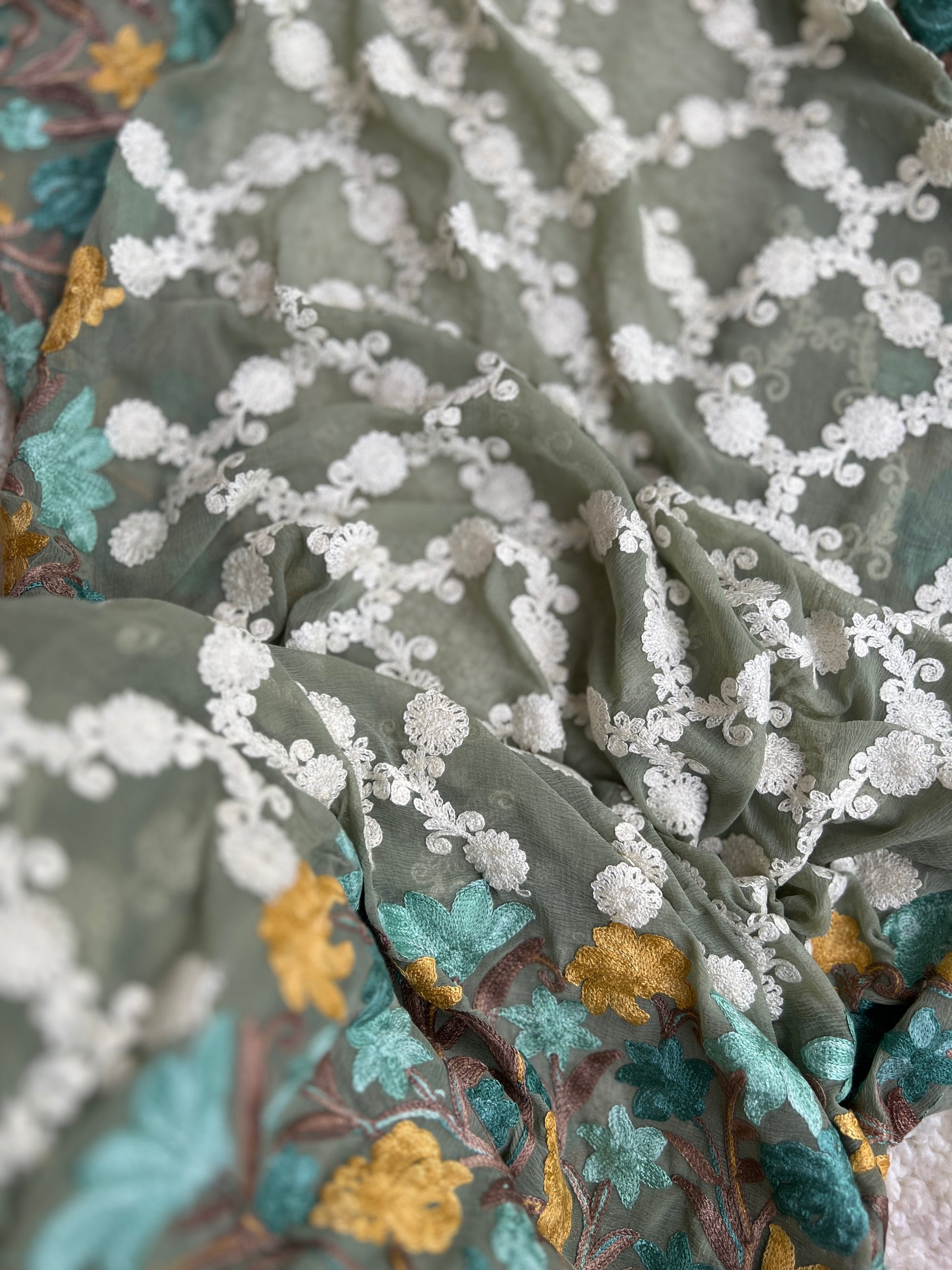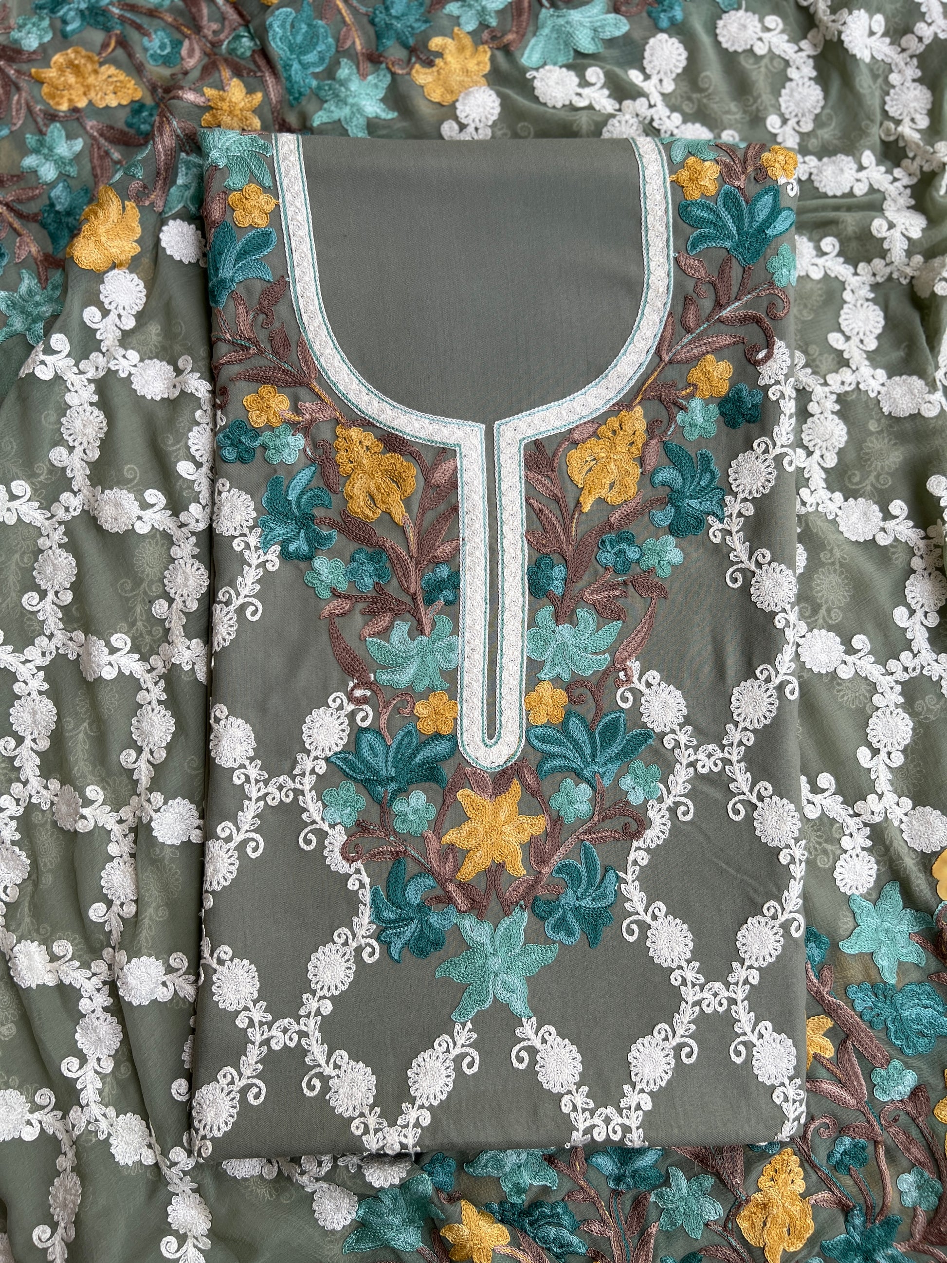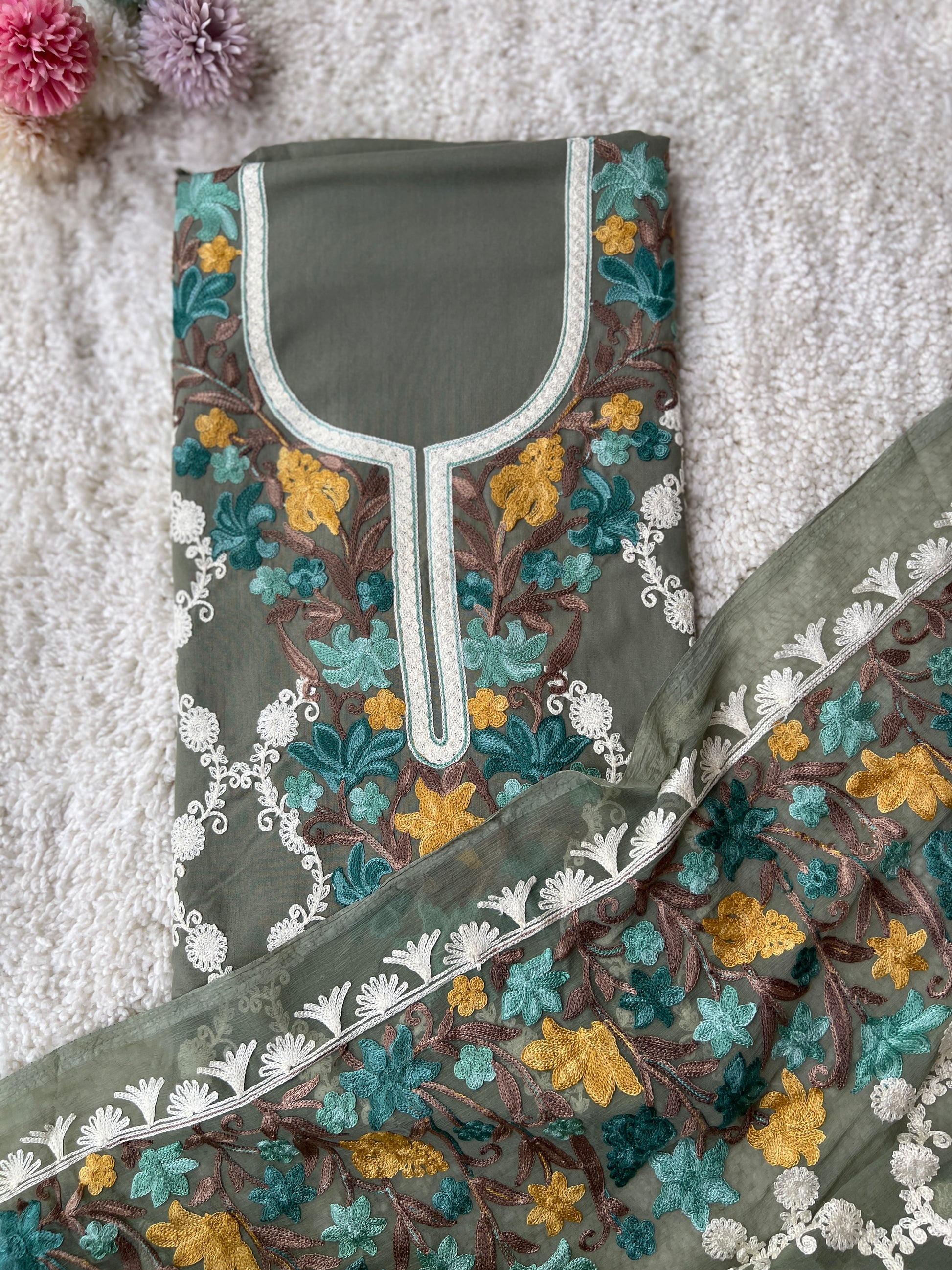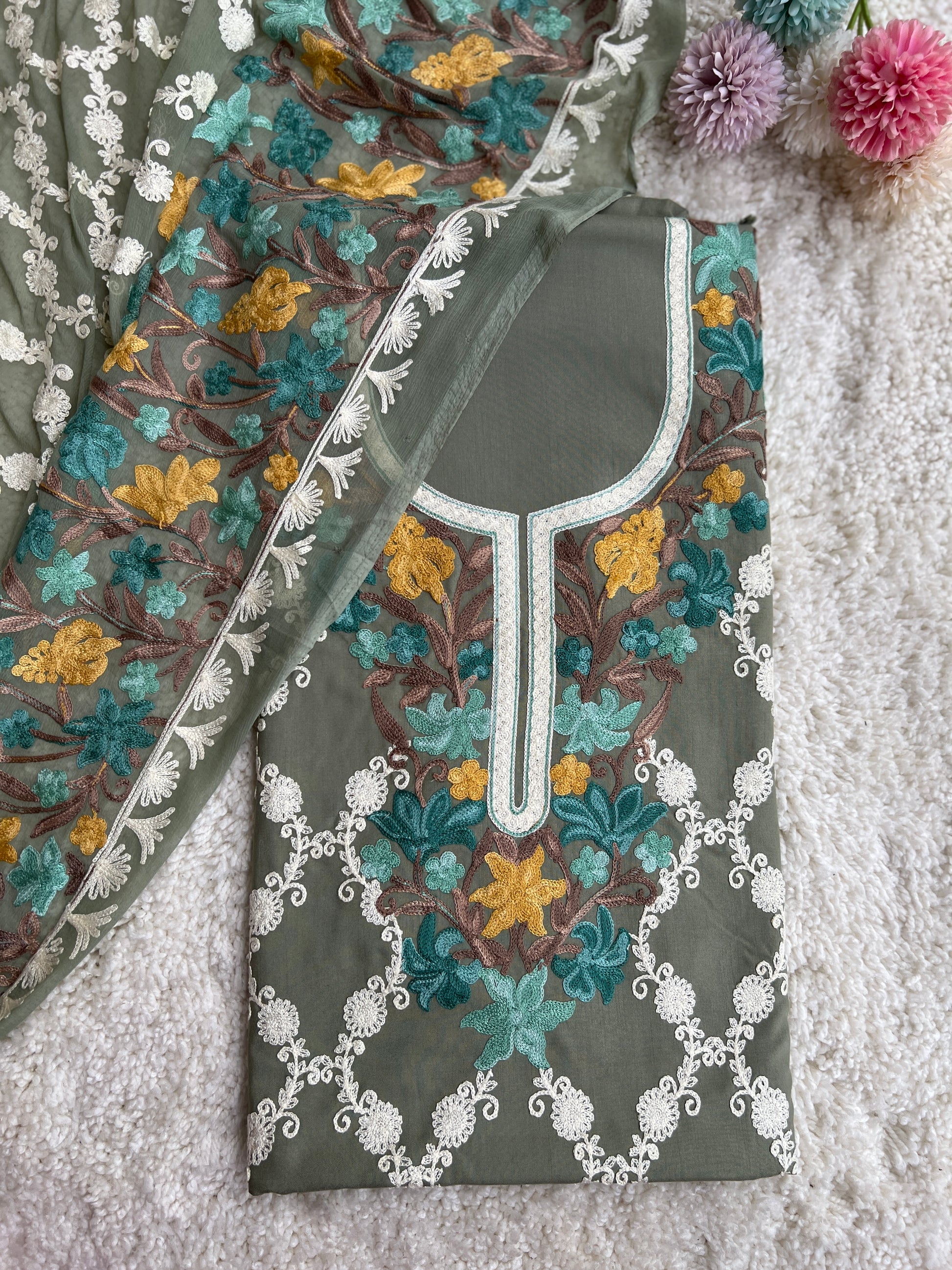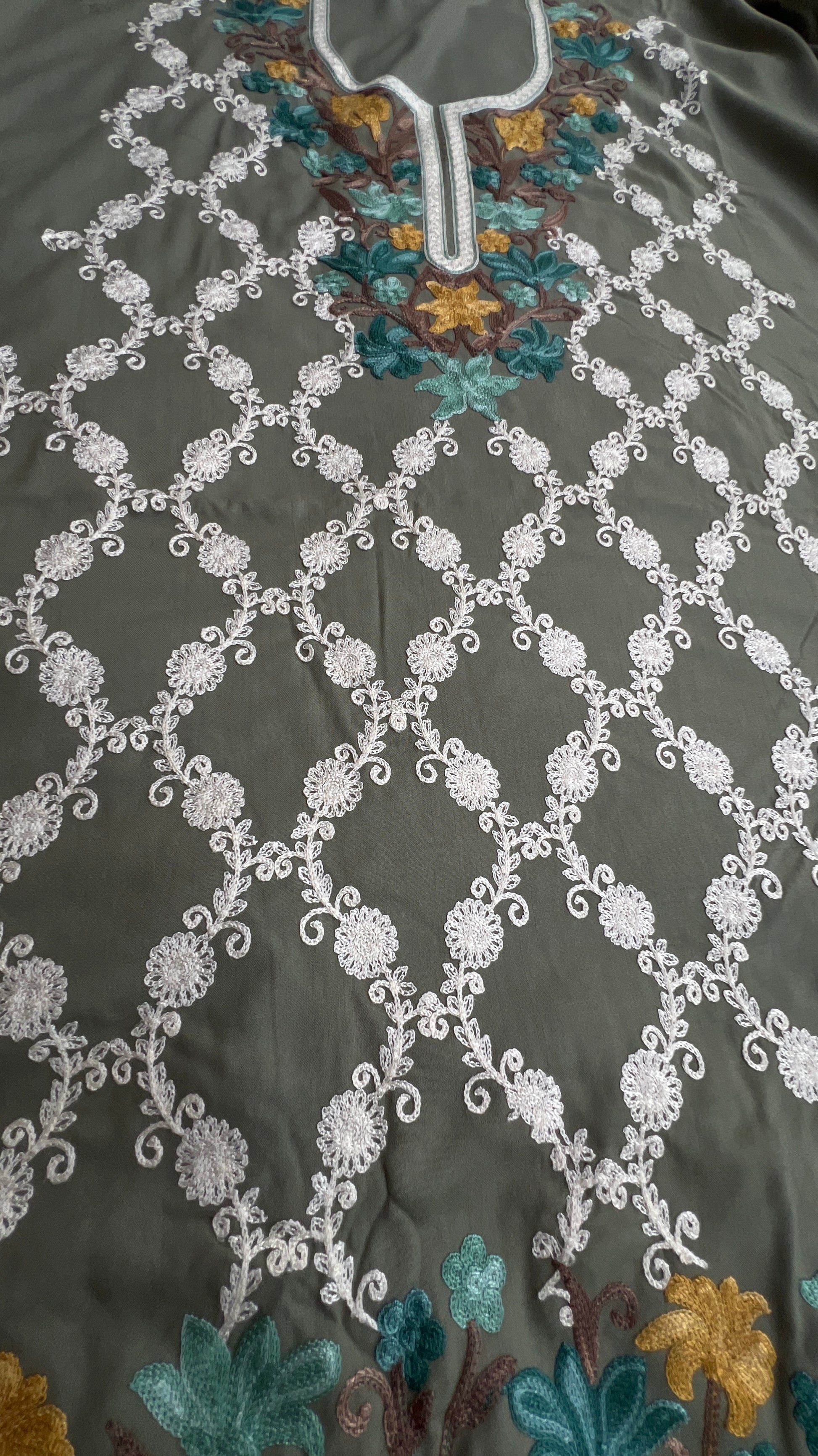 Experience timeless elegance with our olive Shade Kashmiri Aari Embroidered Dress Material, perfect for all seasons. This exquisite dress material features the renowned Kashmiri Aari embroidery, adding a touch of traditional artistry to your wardrobe. The stunning olive color exudes sophistication, making it ideal for any occasion.