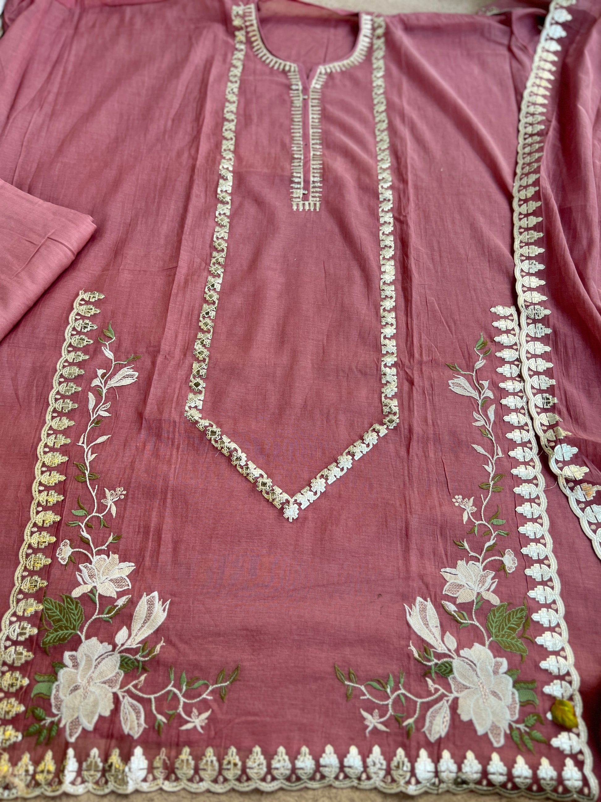 Mal Chanderi fabric with elegant pitta work on neckline & panel, lightweight and breathable, soft festive shine