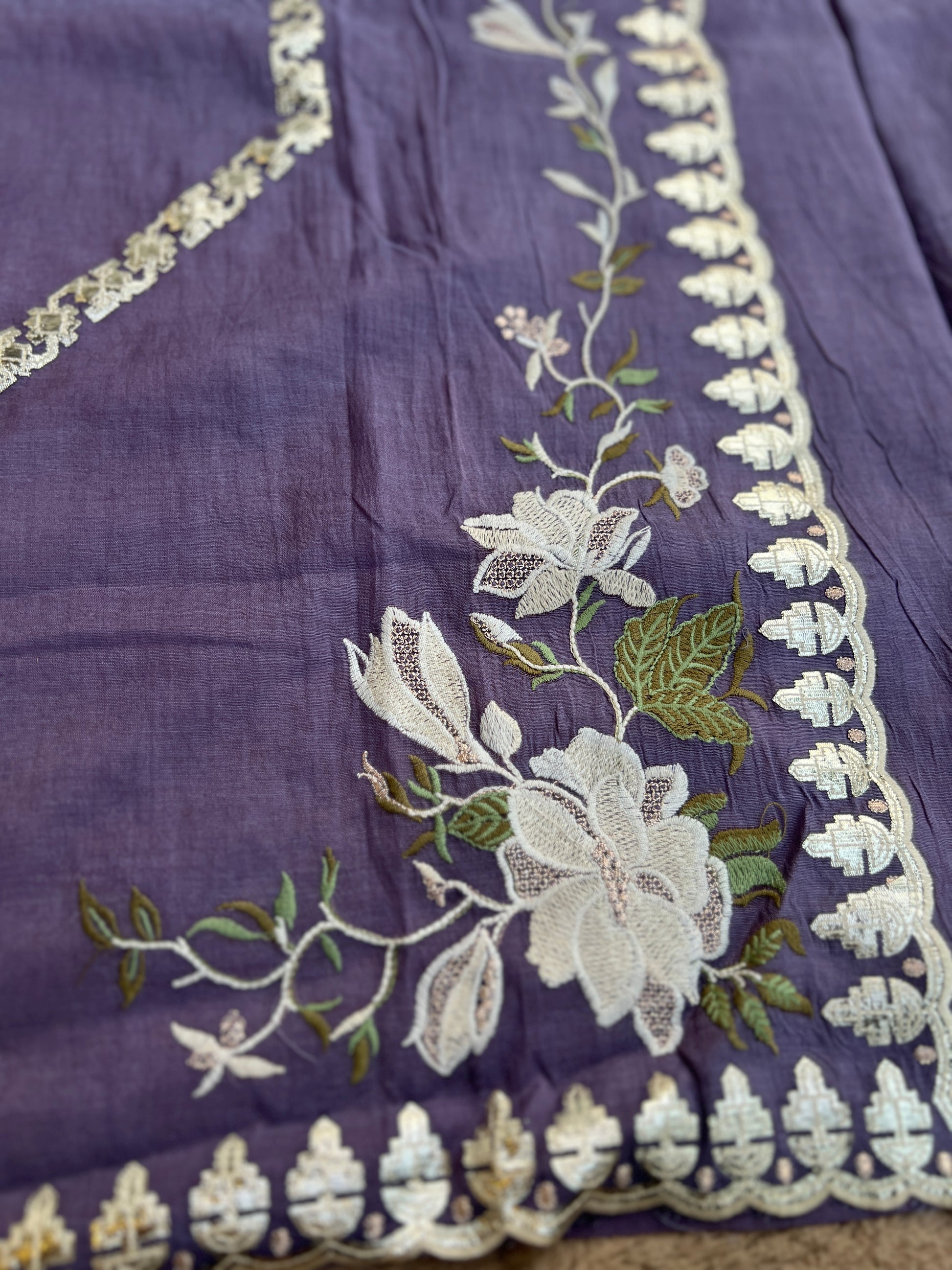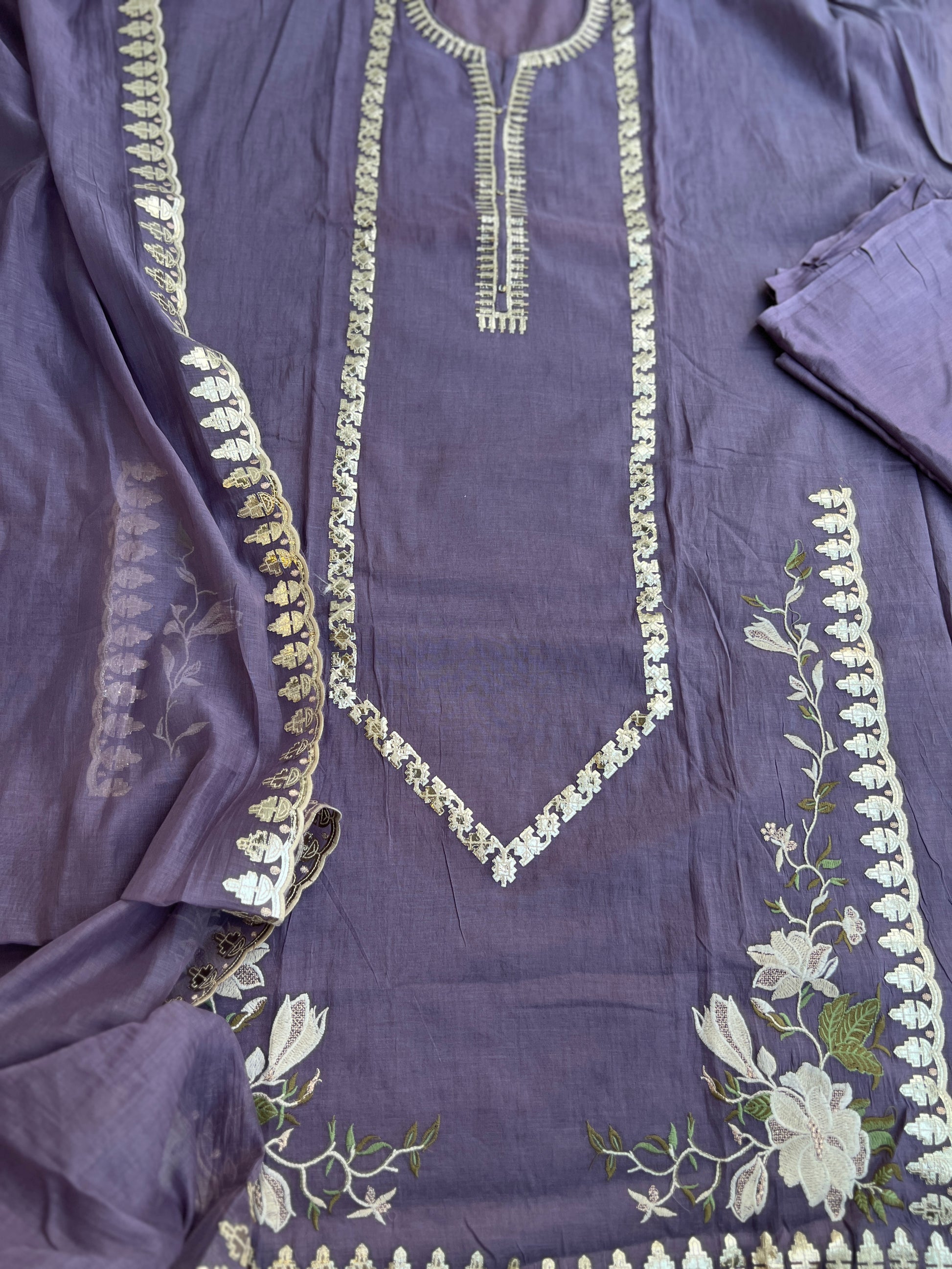 Every suit at The Syma Closet is a labour of love β€” stitched not just by hands, but by generations of craft knowledge. The Kalkatta handwork on this dupatta takes a single artisan over 3 days to complete, each motif placed with intention and care. We source our shimmer tissue silk from the finest weavers of Varanasi, where the Banarasi tradition has lived for centuries. When you wear this suit, you carry that history with you.