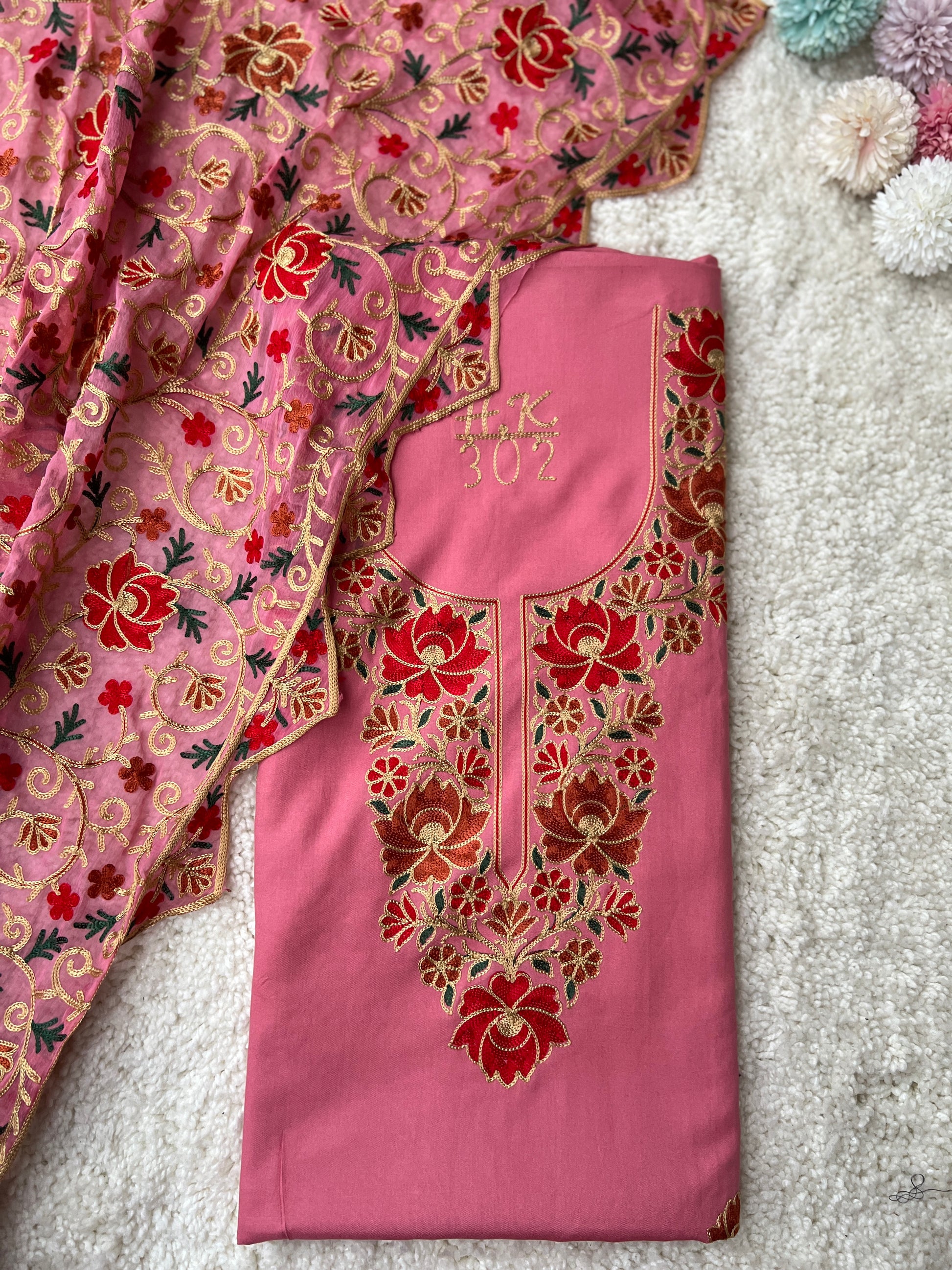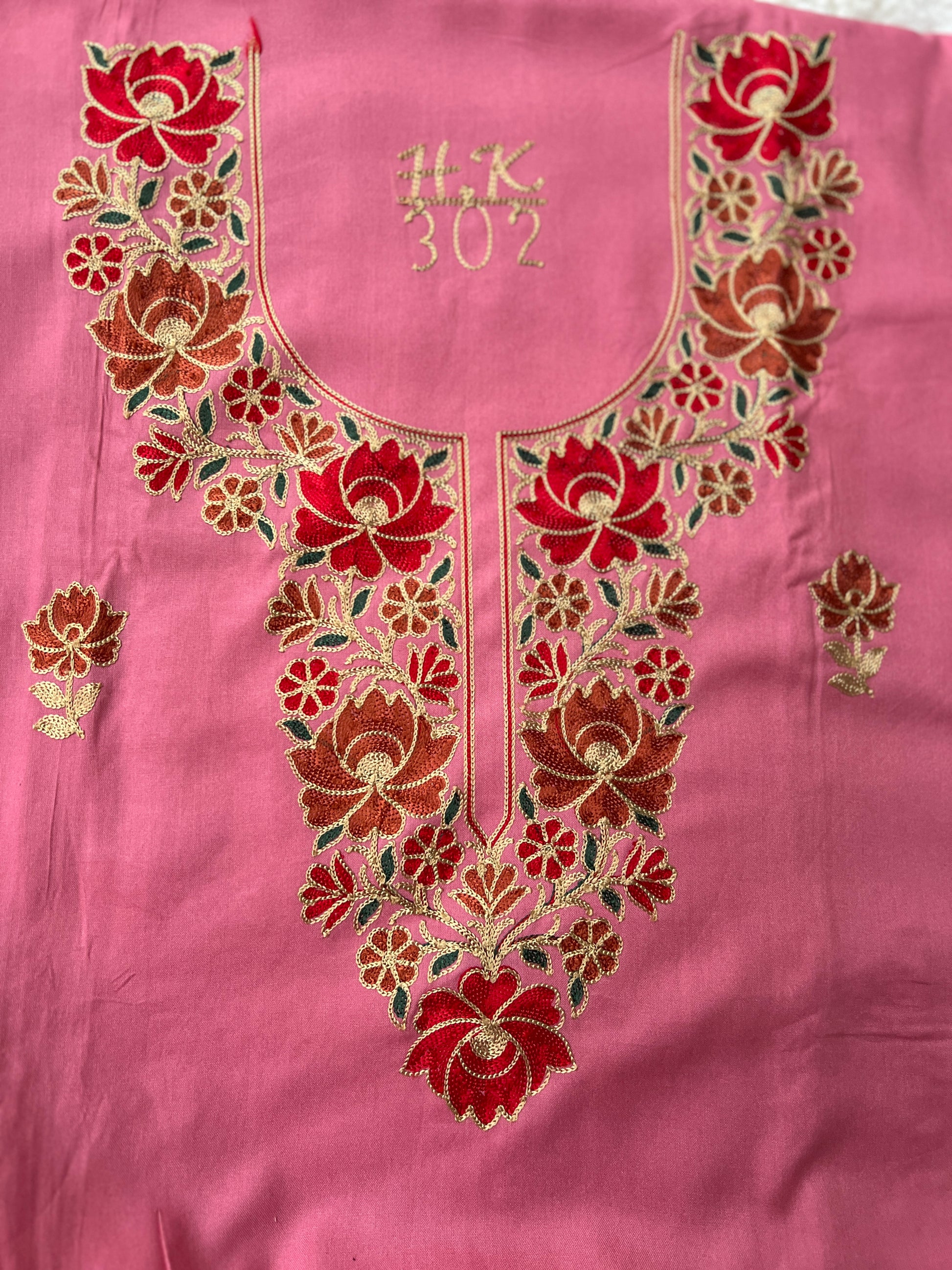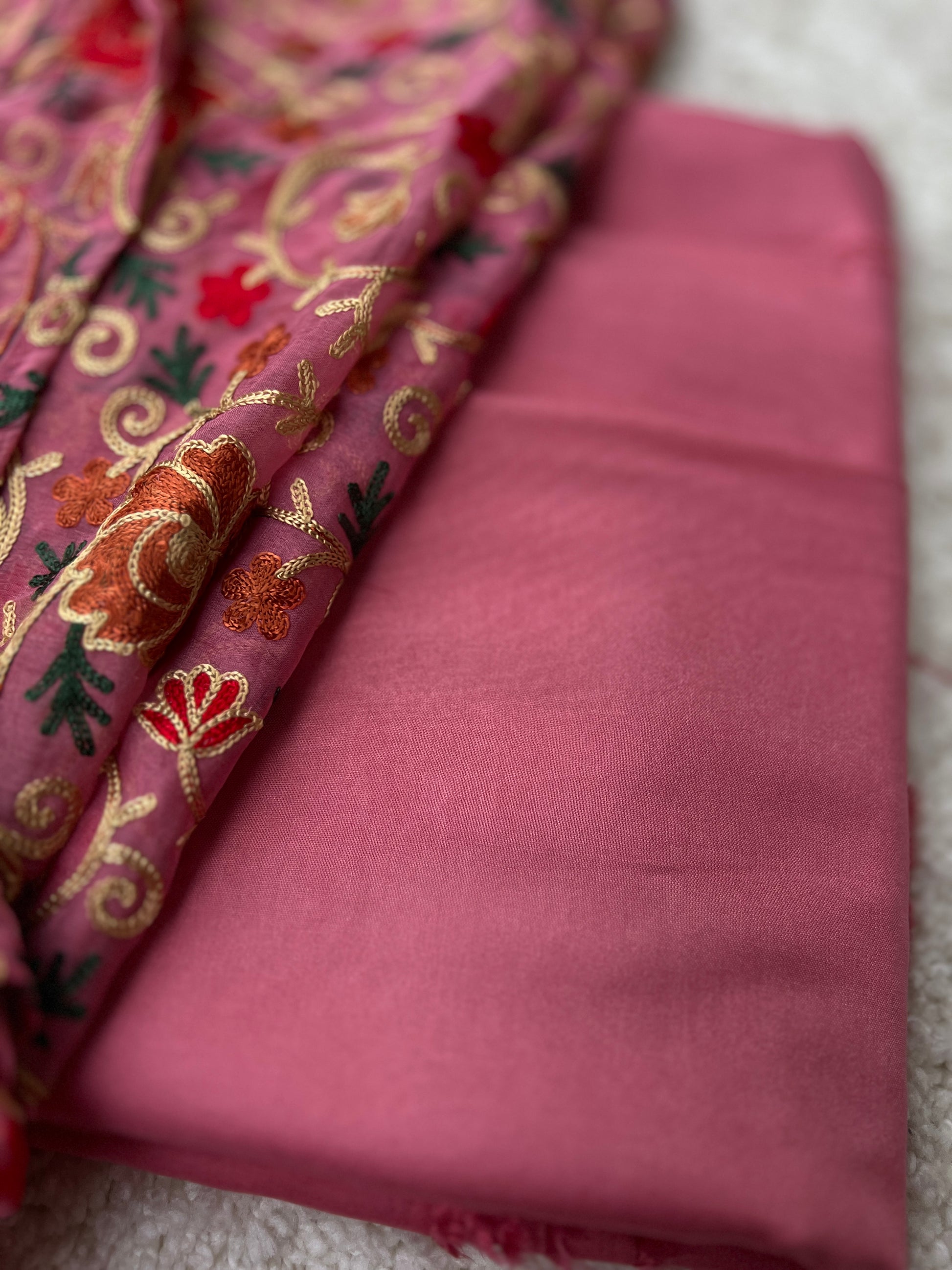 Experience timeless elegance with our pink Shade Kashmiri Aari Embroidered Dress Material, perfect for all seasons. This exquisite dress material features the renowned Kashmiri Aari embroidery, adding a touch of traditional artistry to your wardrobe. The rich plum color exudes sophistication, making it ideal for any occasion.