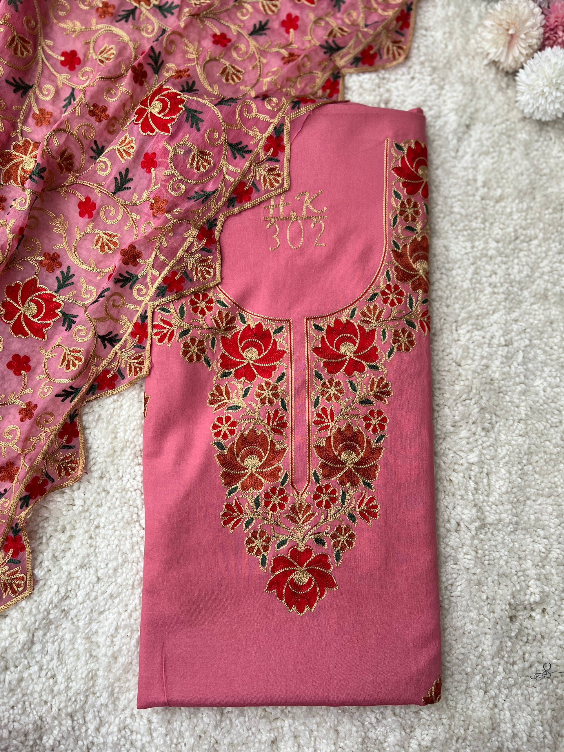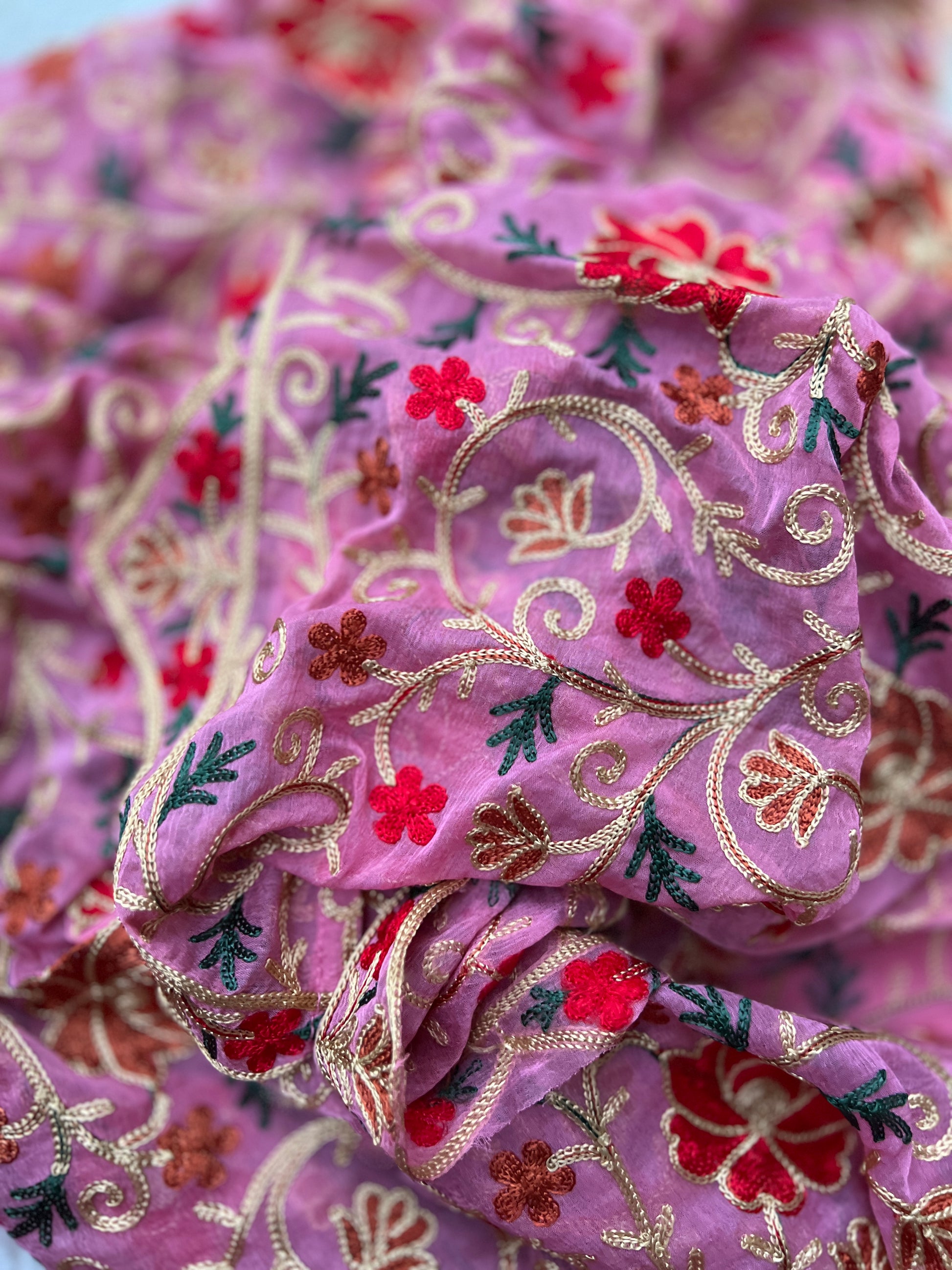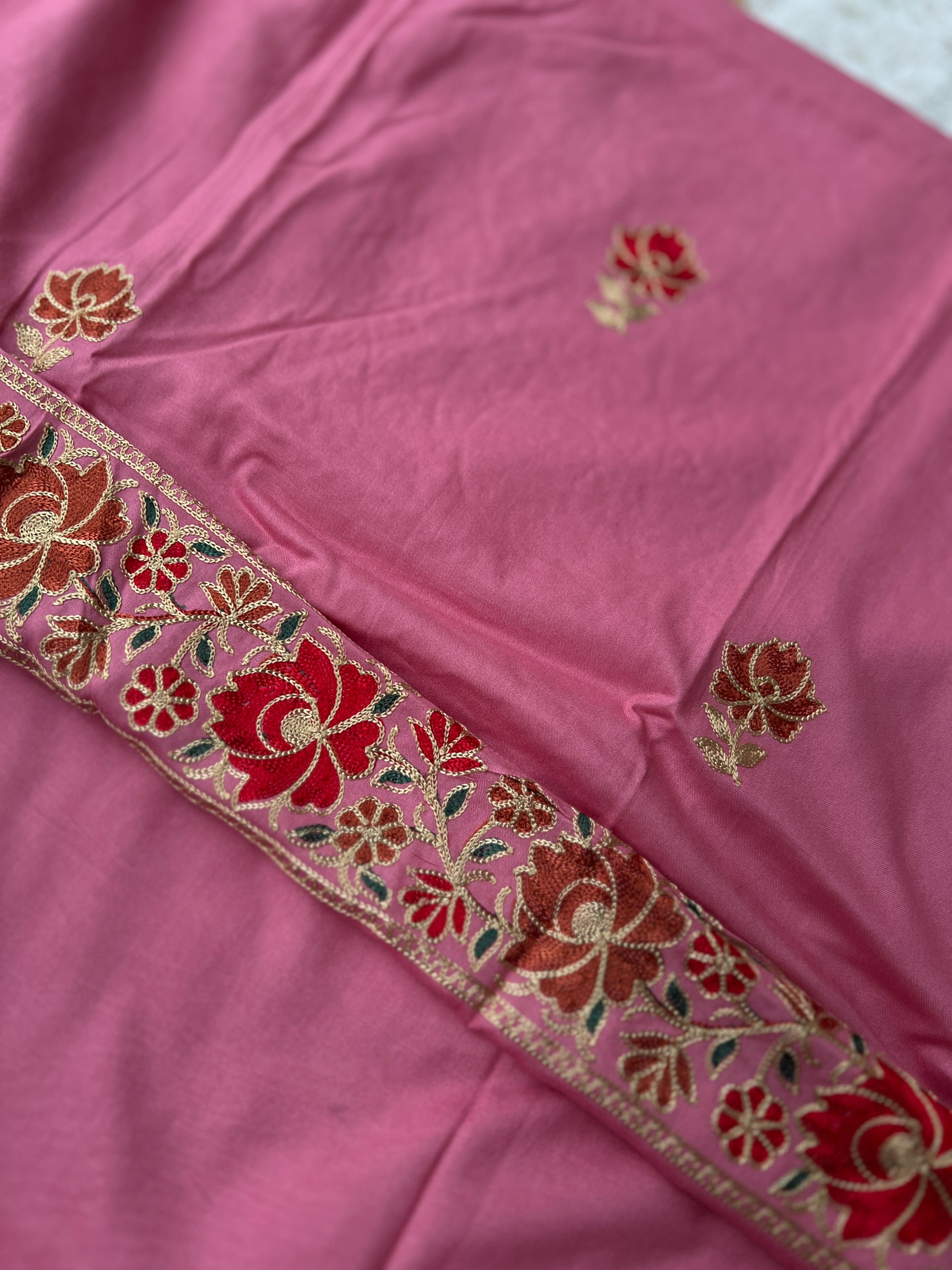 Experience timeless elegance with our pink Shade Kashmiri Aari Embroidered Dress Material, perfect for all seasons. This exquisite dress material features the renowned Kashmiri Aari embroidery, adding a touch of traditional artistry to your wardrobe. The rich plum color exudes sophistication, making it ideal for any occasion.