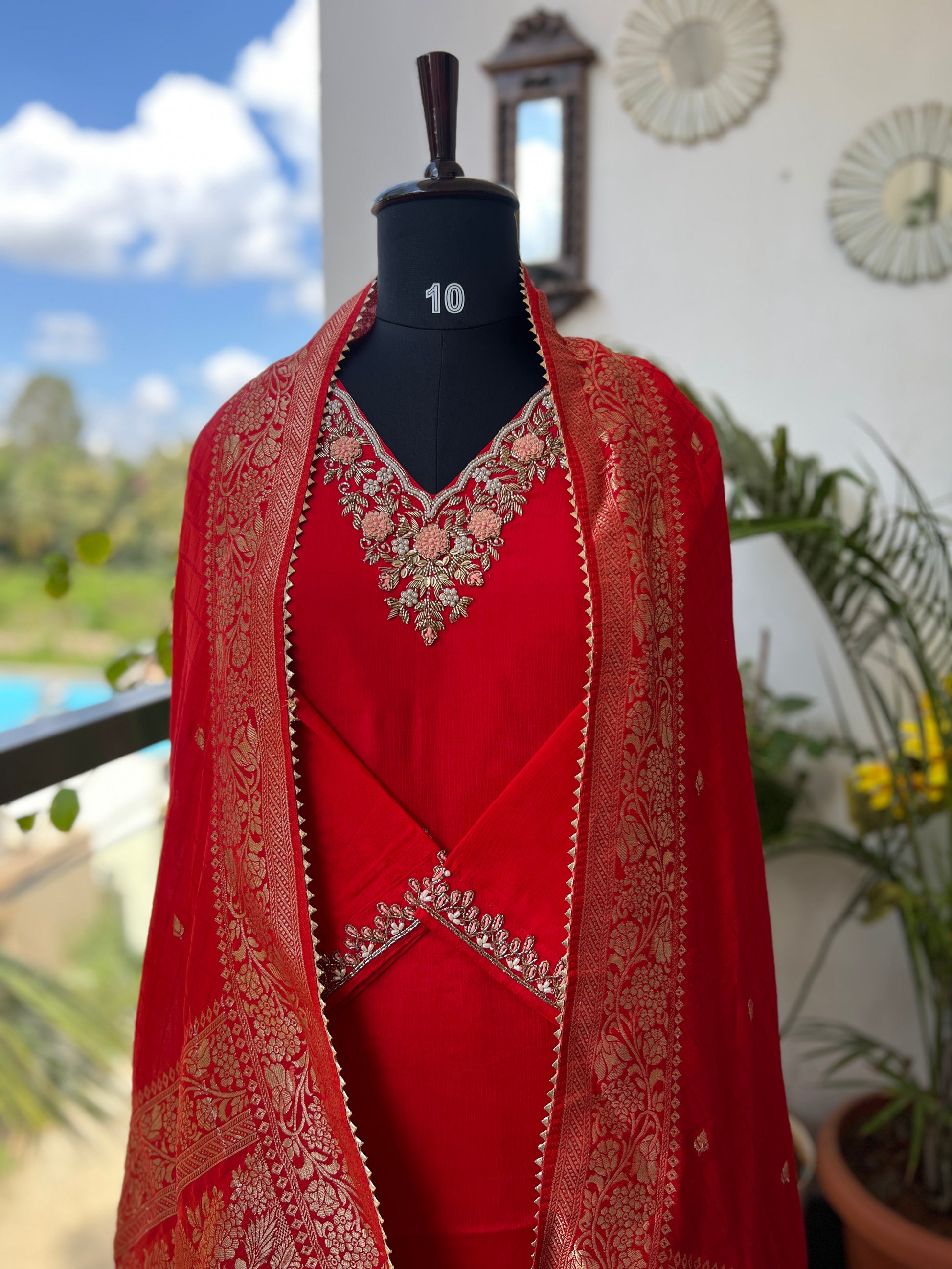 Red Chinnon Suit with Handwork & Silk Banarasi Dupatta