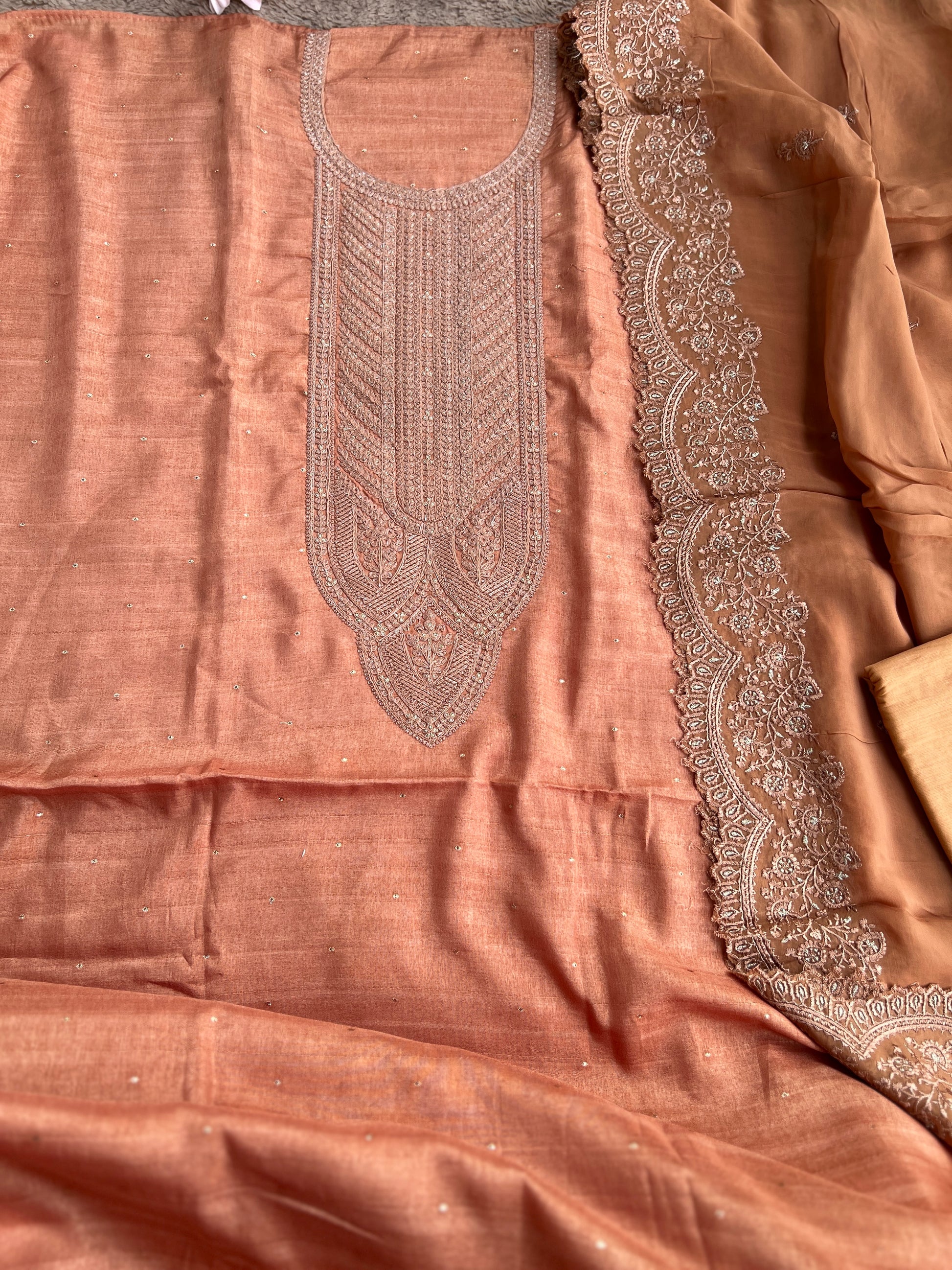 This exquisite three-piece suit radiates subtle luxury with its shimmer silk top adorned in delicate embroidery, perfectly complemented by a stunning embroidered dupatta that adds a regal touch. The set is completed with a soft and comfortable cotton silk bottom, making it an ideal choice for festive gatherings, weddings, and elegant evening wear.