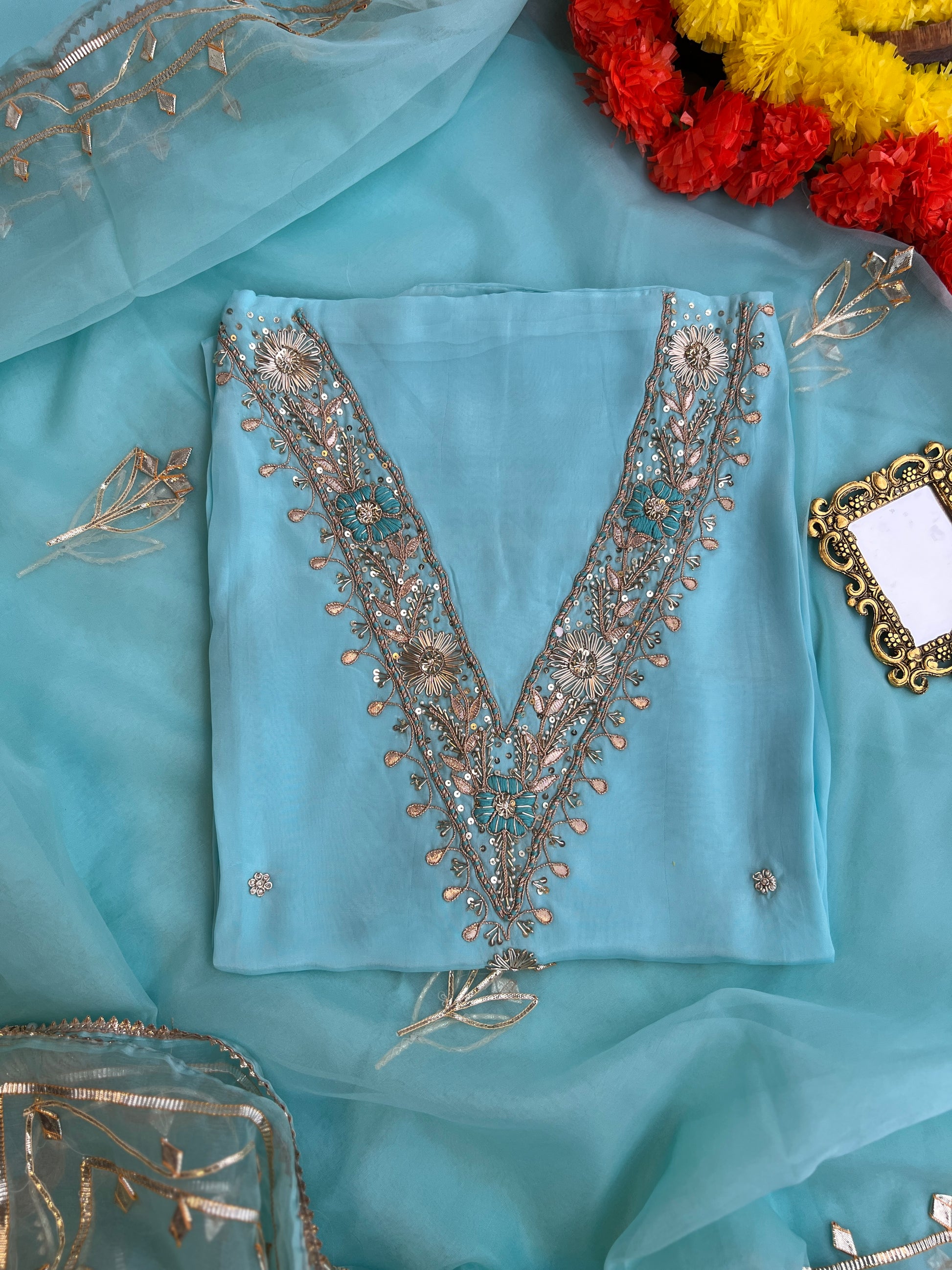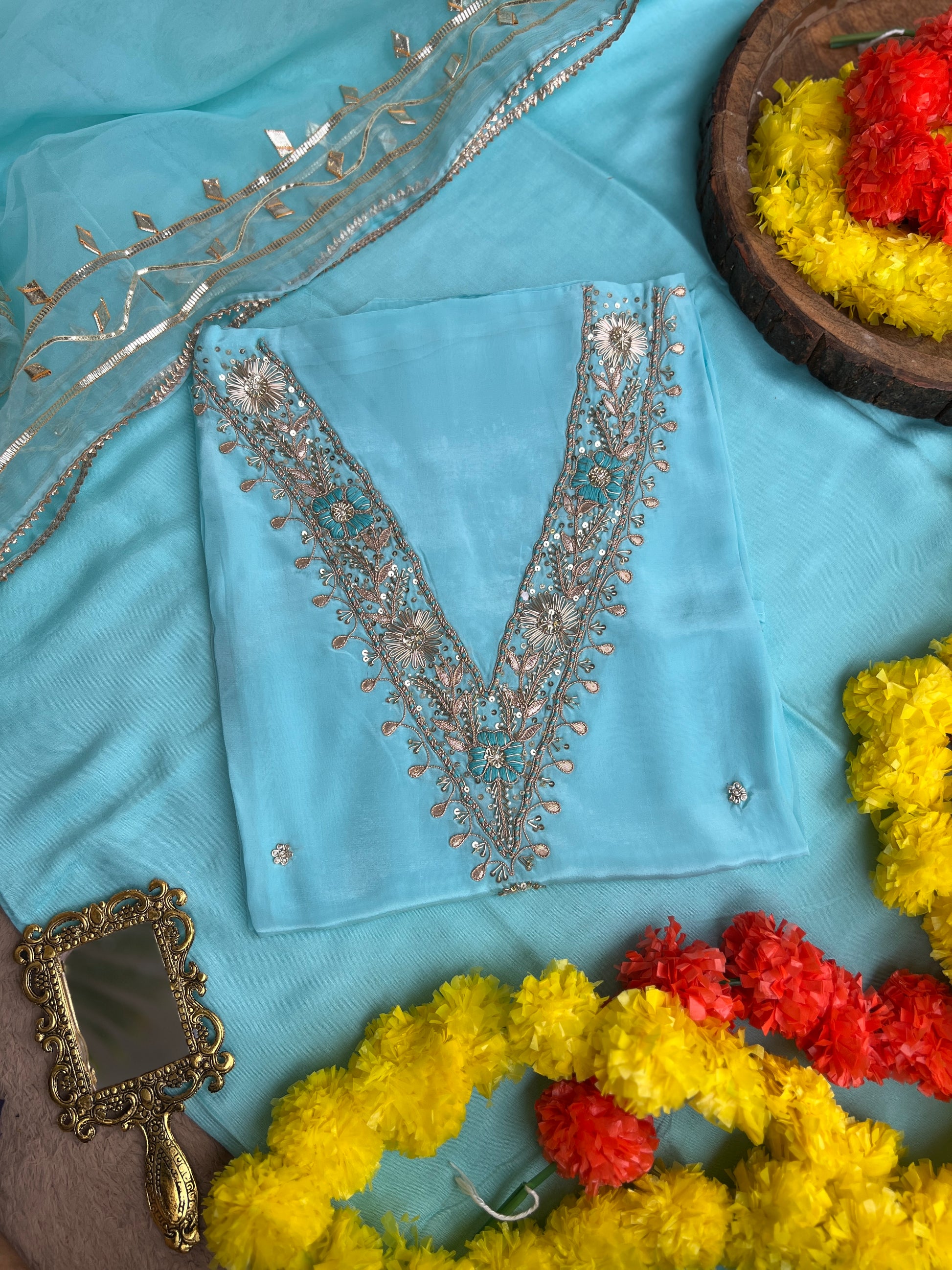 Sky Blue Russian Silk Suit with Handwork & Gota Jaal Dupatta