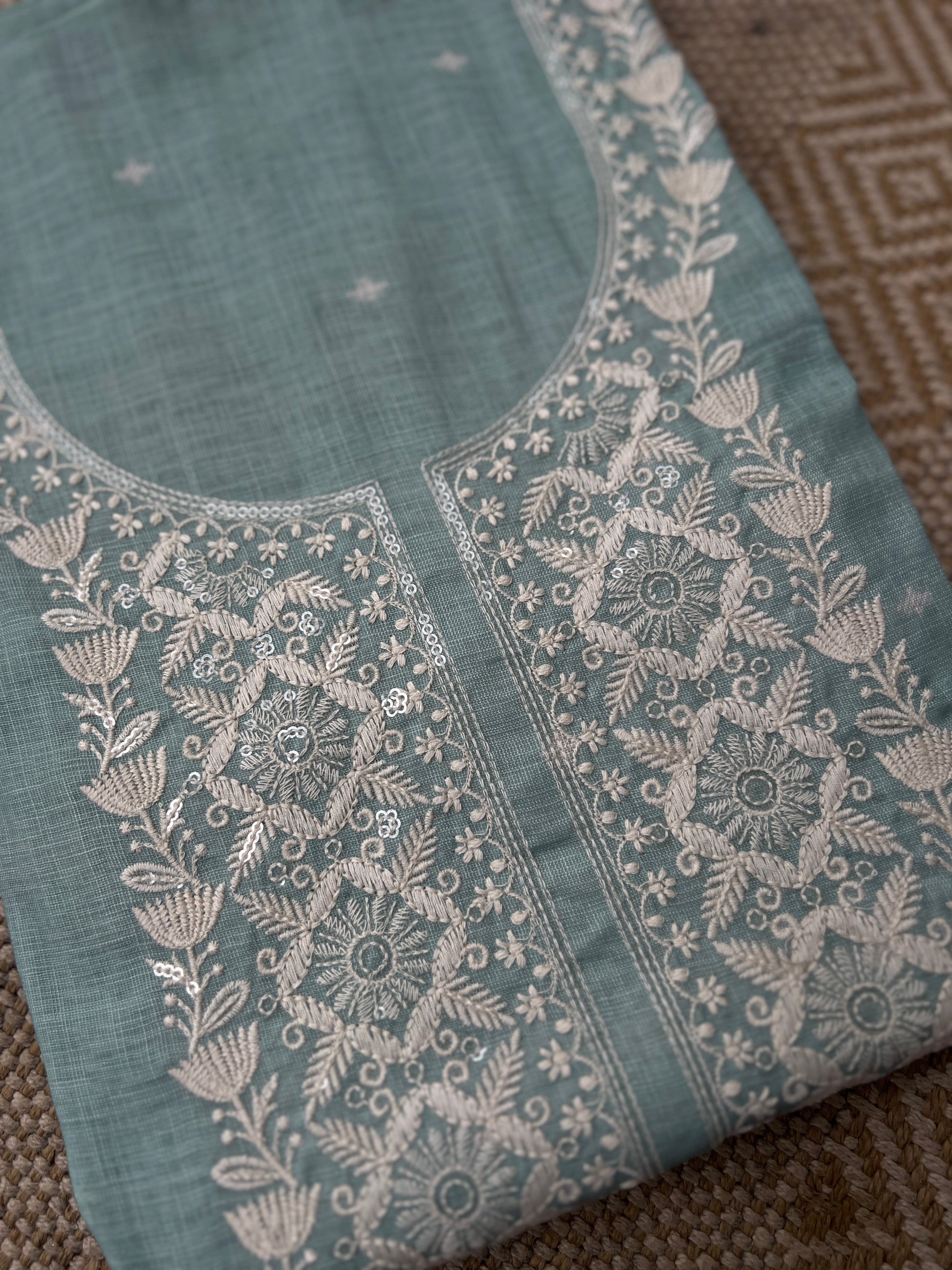 Crafted for the modern woman who appreciates tradition, this linen suit set blends comfort with quiet luxury. The breathable linen base is elevated with delicately embroidered white threadwork around the neckline — adding just the right amount of detail without overpowering the look. Available in serene pastel shades, it’s the perfect pick for office wear, summer outings, or intimate festive occasions.